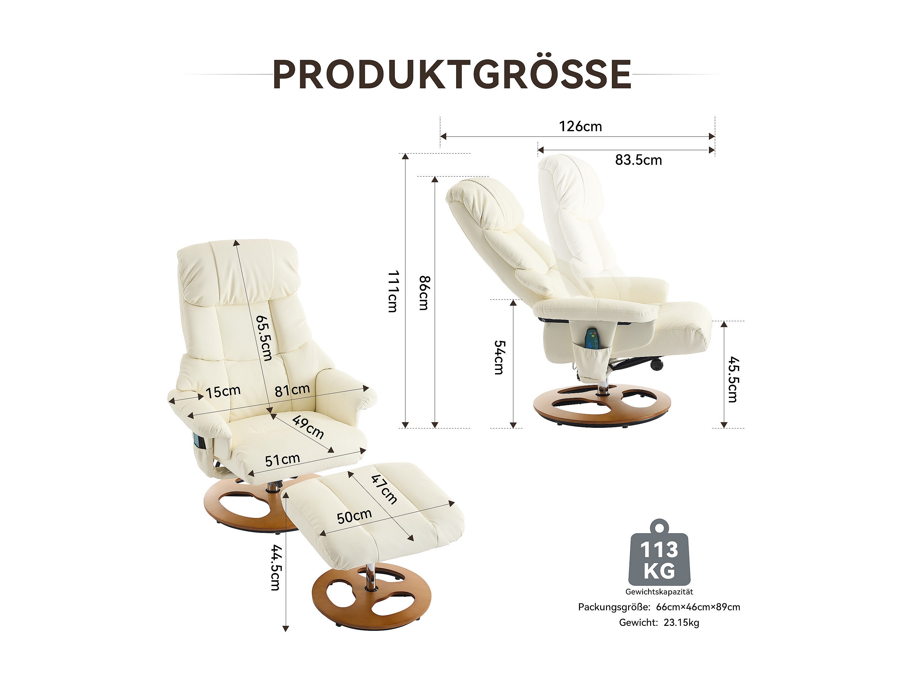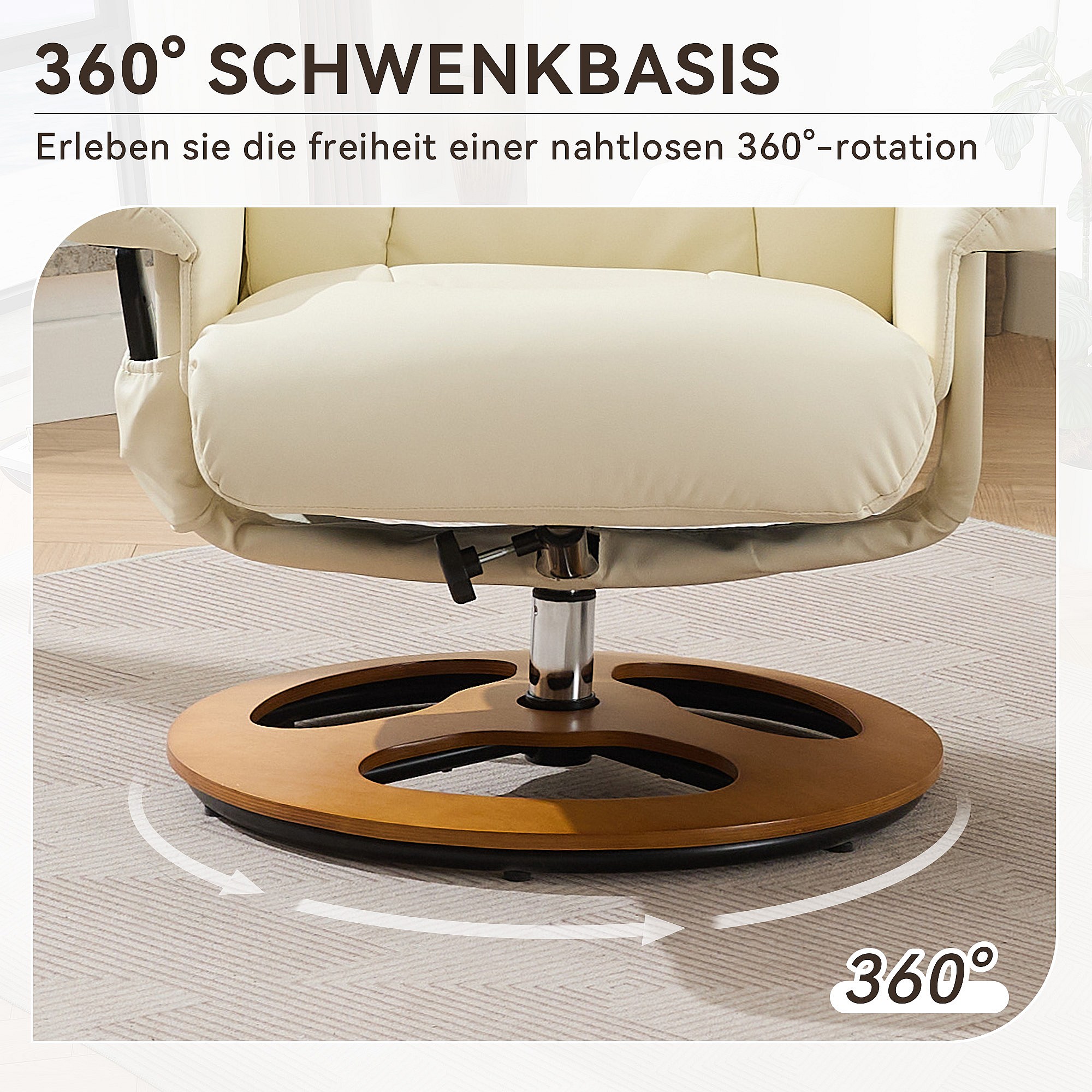 Poltrona de massagem relaxante com aquecimento e apoio para os pés, giratória 360°, PU, sala de estar e escritório, branca