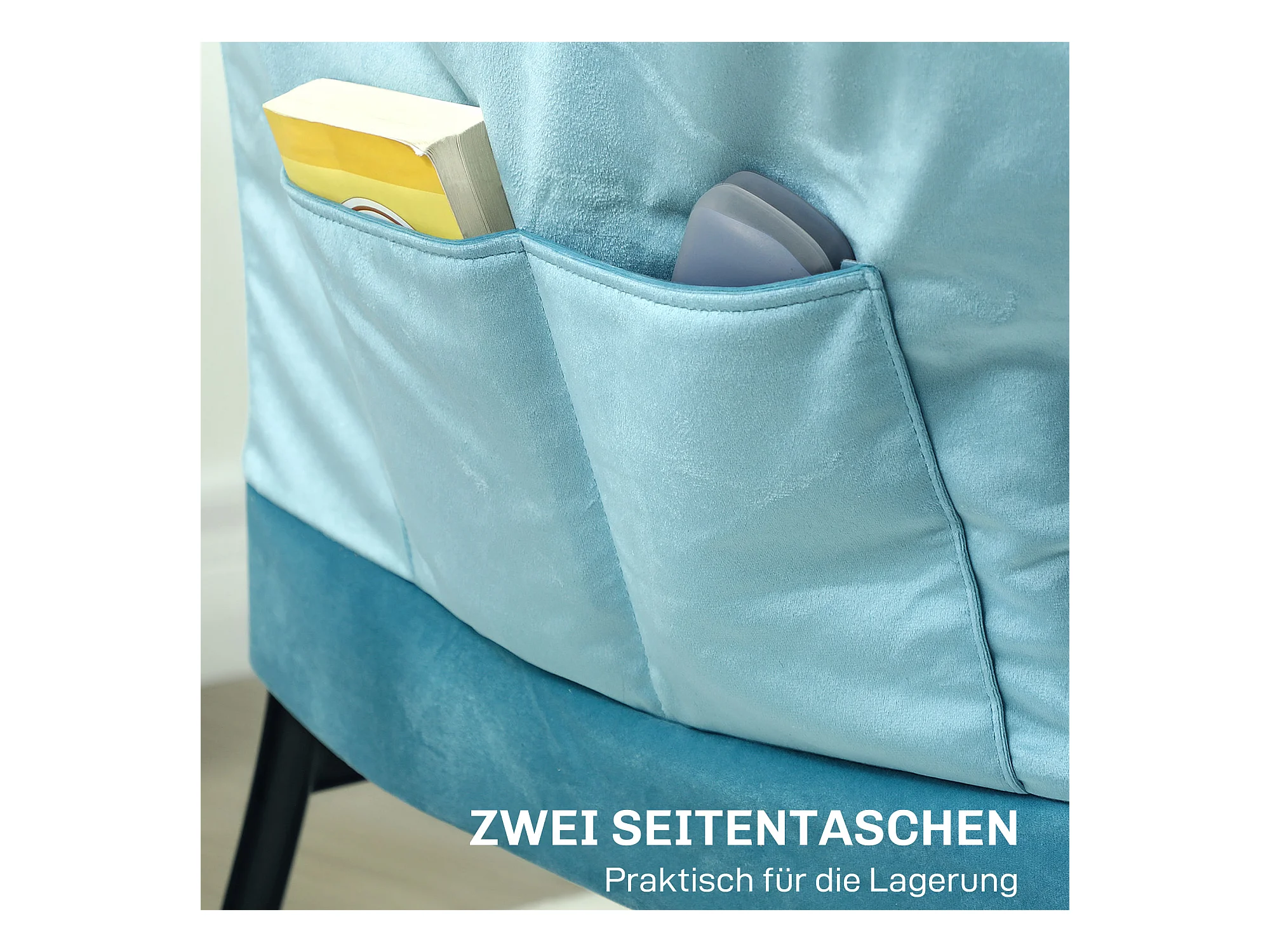 Poltrona de veludo com braços e bolsos laterais para sala de estar quarto azul