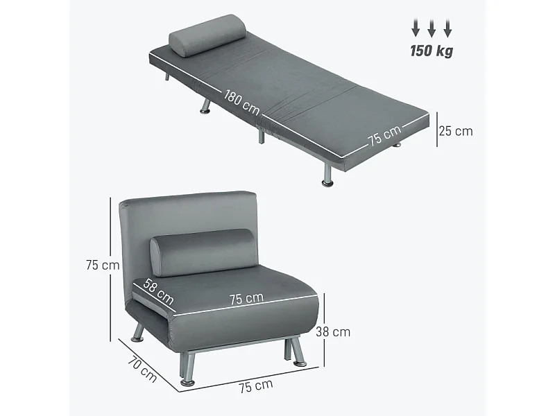 Poltrona dobrável com função de cama, cadeira reclinável dobrável em veludo, encosto ajustável, 75 x 70 x 75 cm, cinza