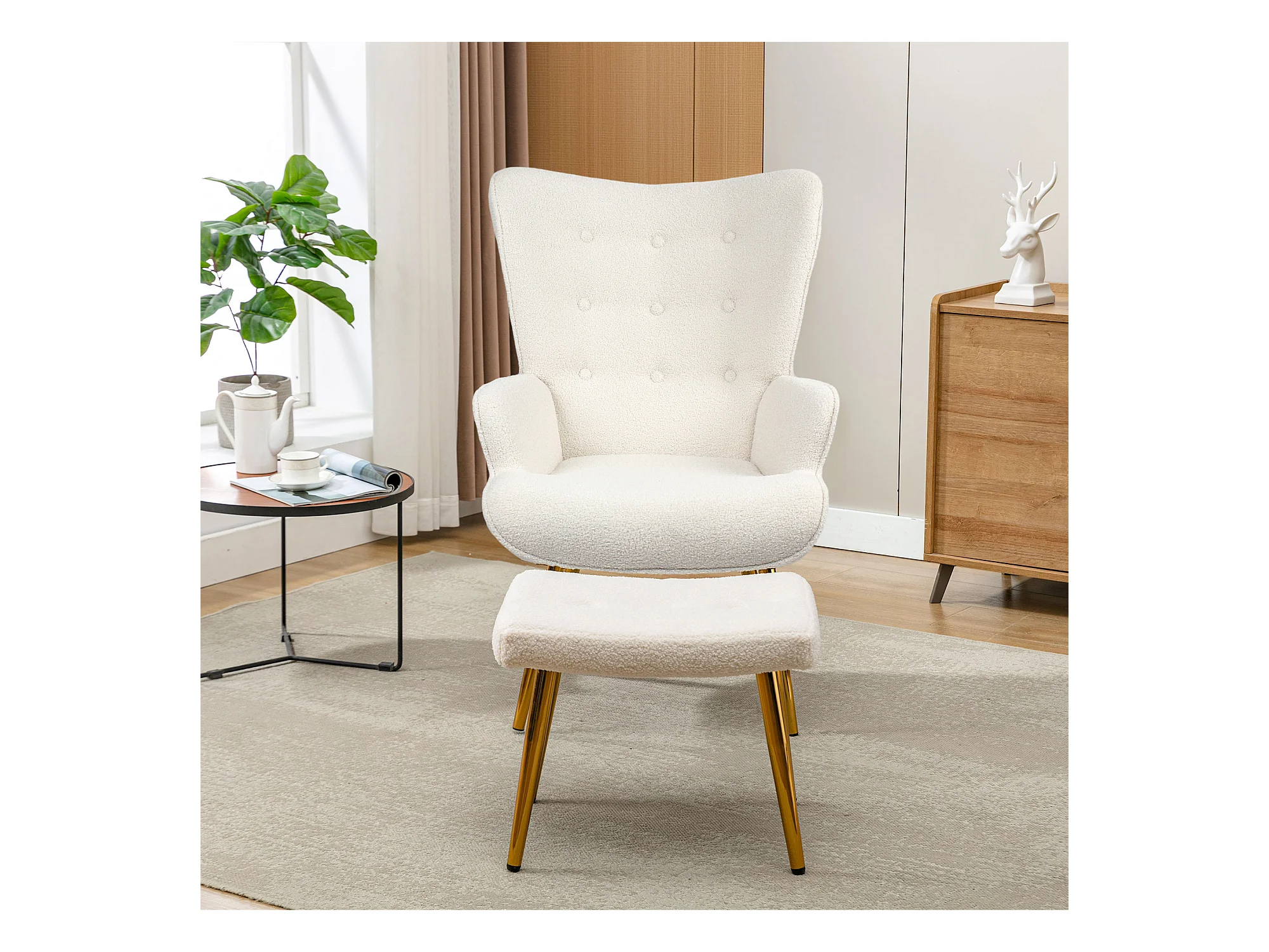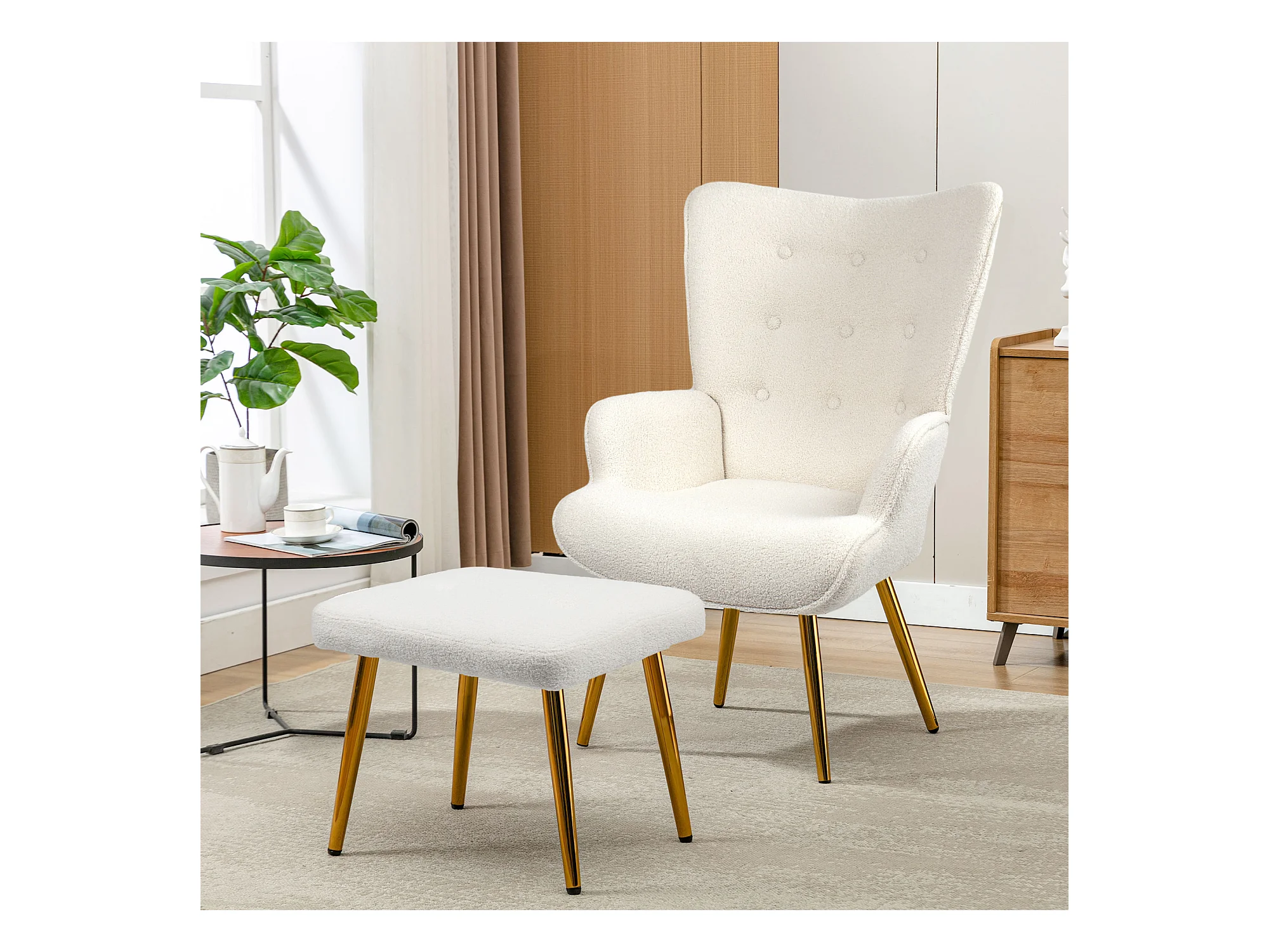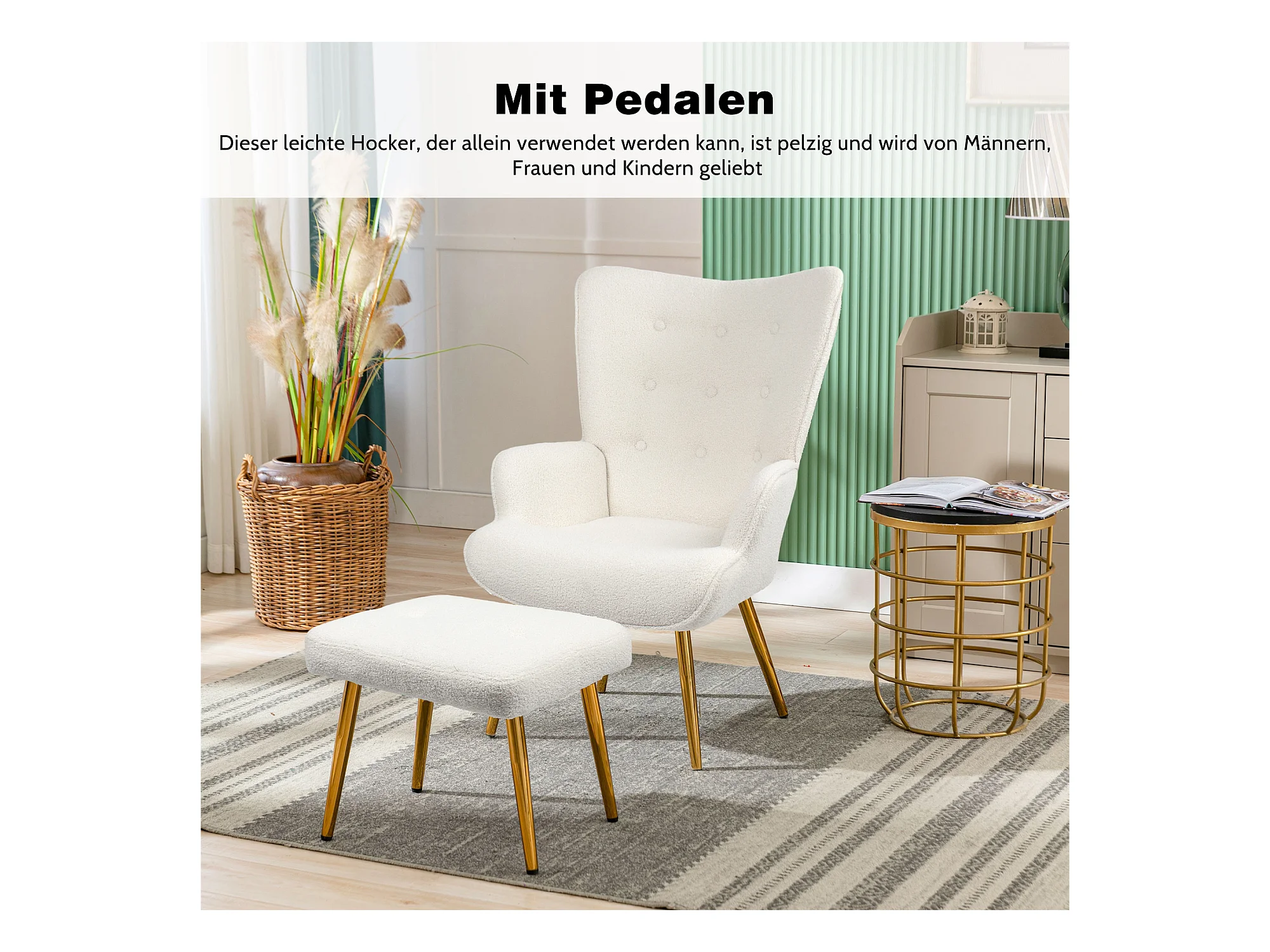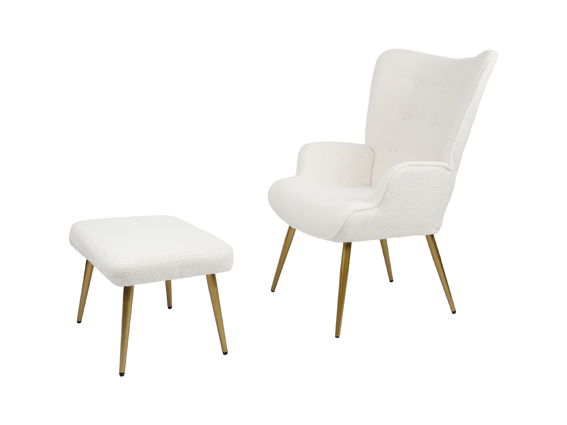 Poltrona escandinava com pufe, reclinável, lã tingida, estofada, com pernas douradas, cadeira de TV, cadeira de leitura para quarto, sala de estar, branca