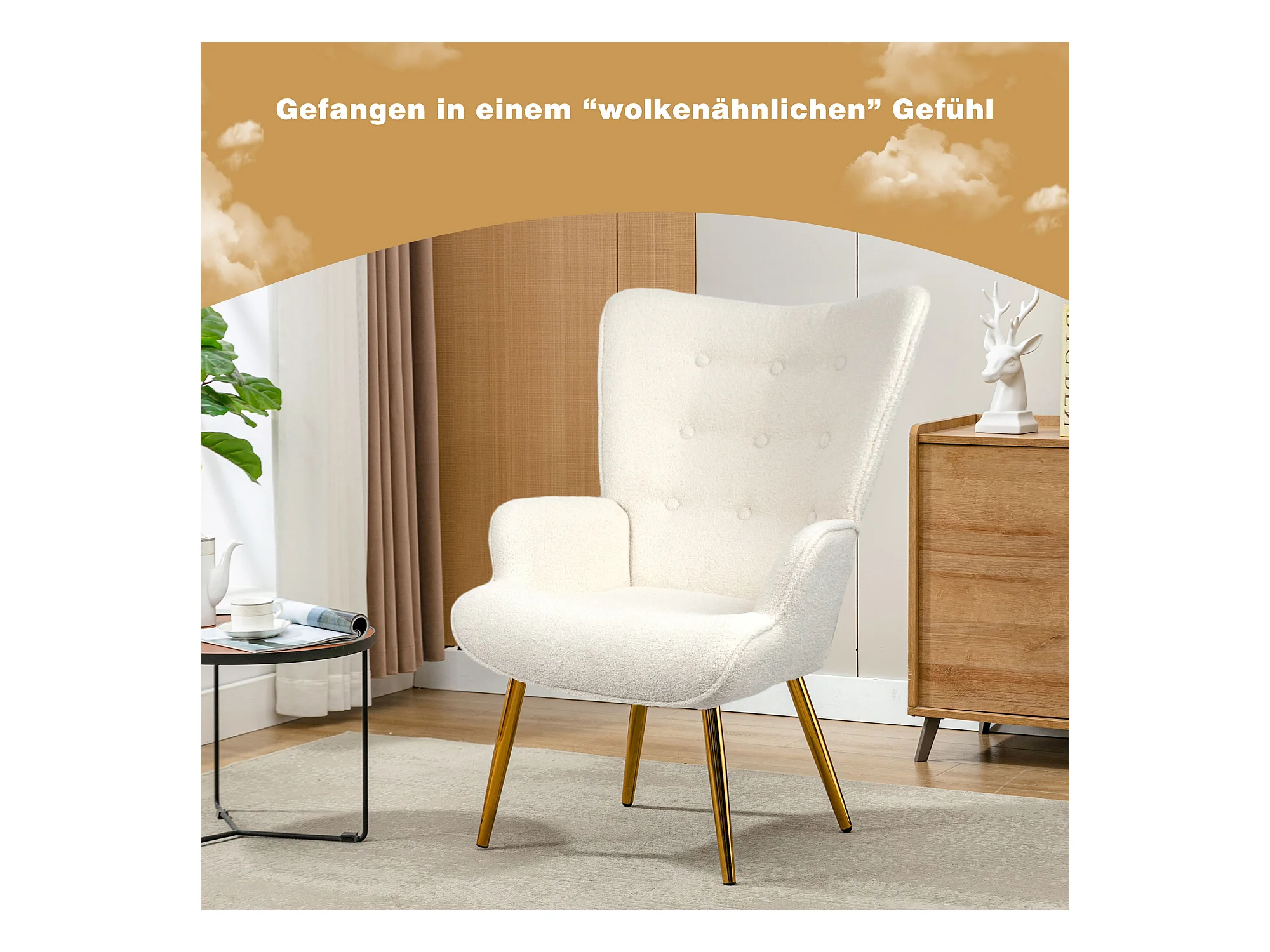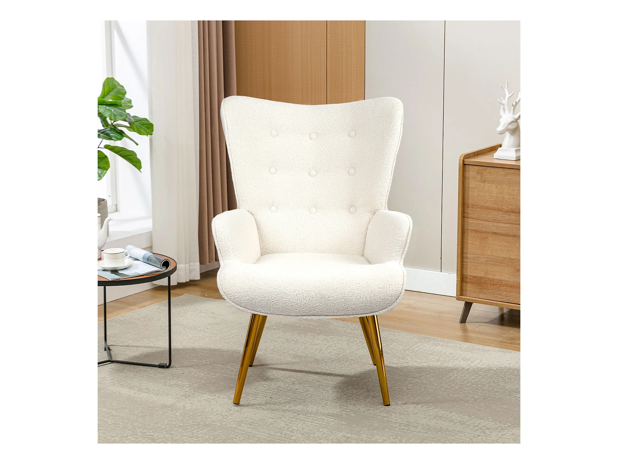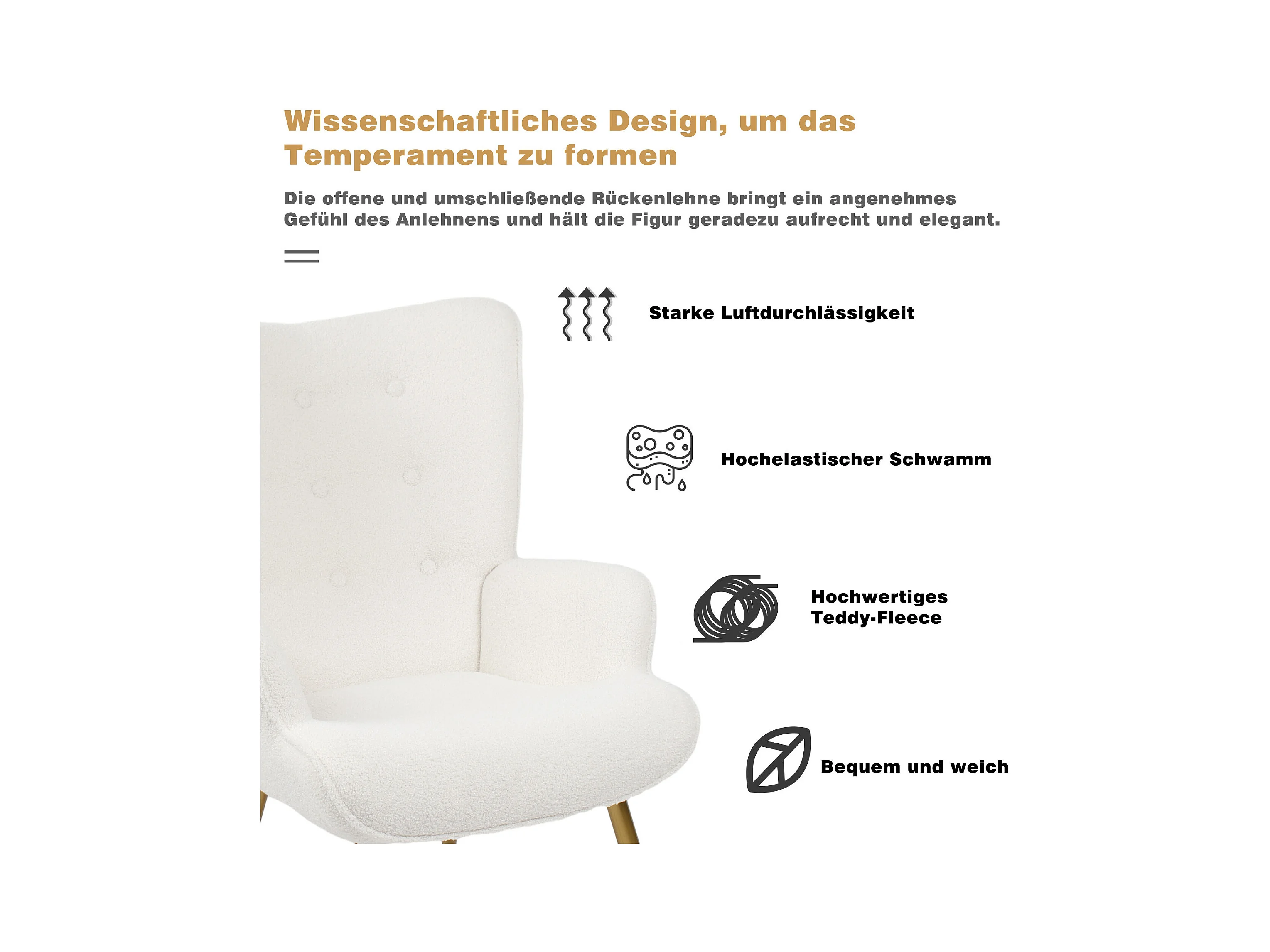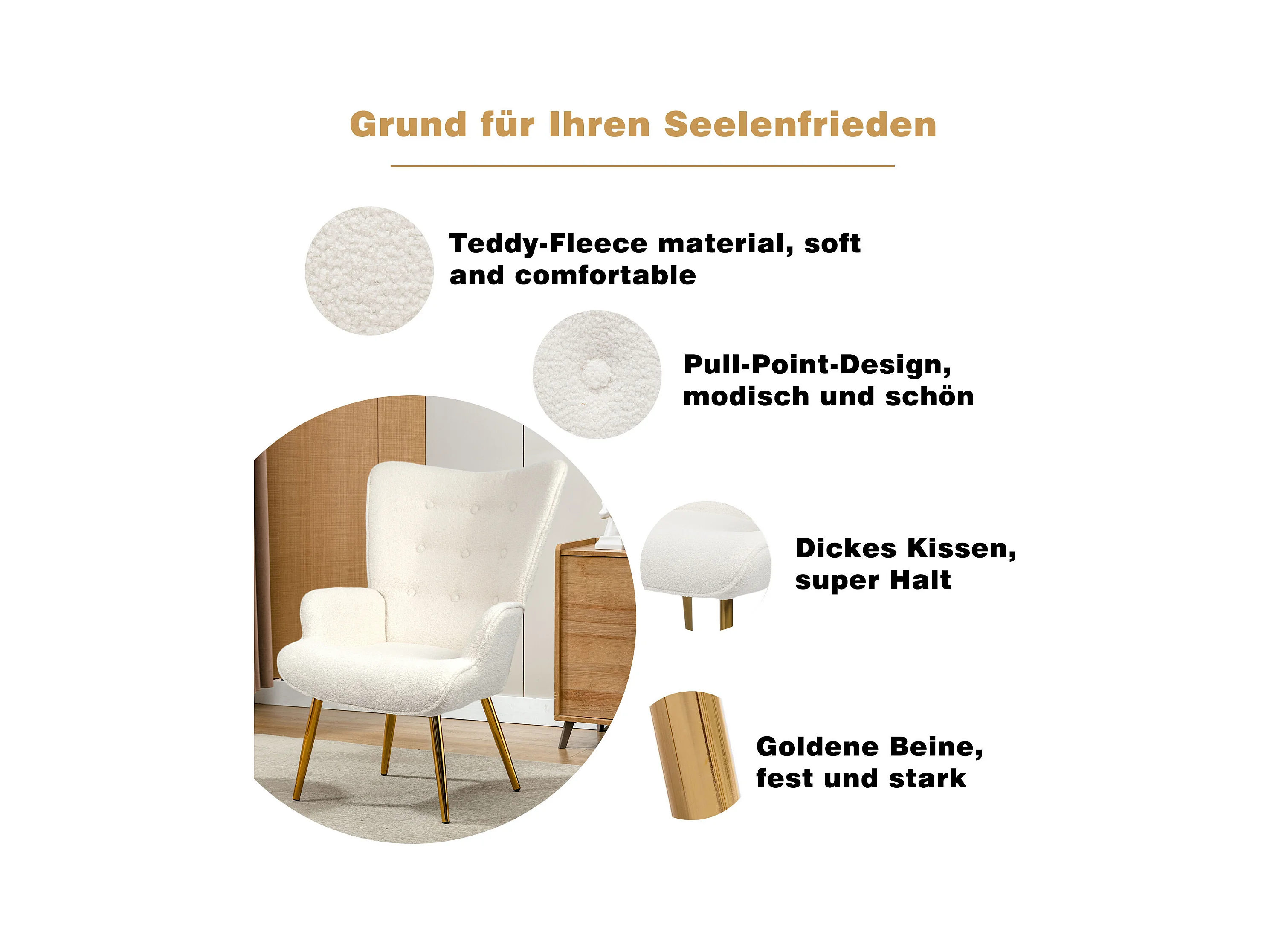 Poltrona escandinava com pufe, reclinável, lã tingida, estofada, com pernas douradas, cadeira de TV, cadeira de leitura para quarto, sala de estar, branca