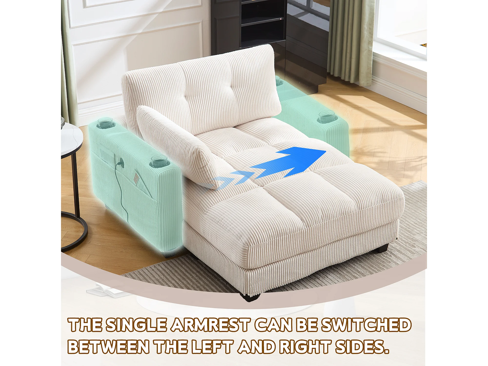 Poltrona estofada em veludo bege com braços acolchoados, apoio de cabeça, porta-copos e bolso lateral, ideal para sala e quarto