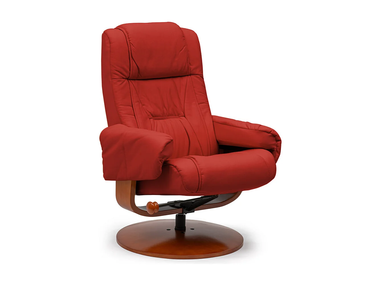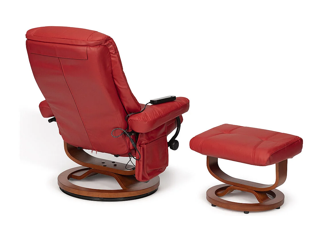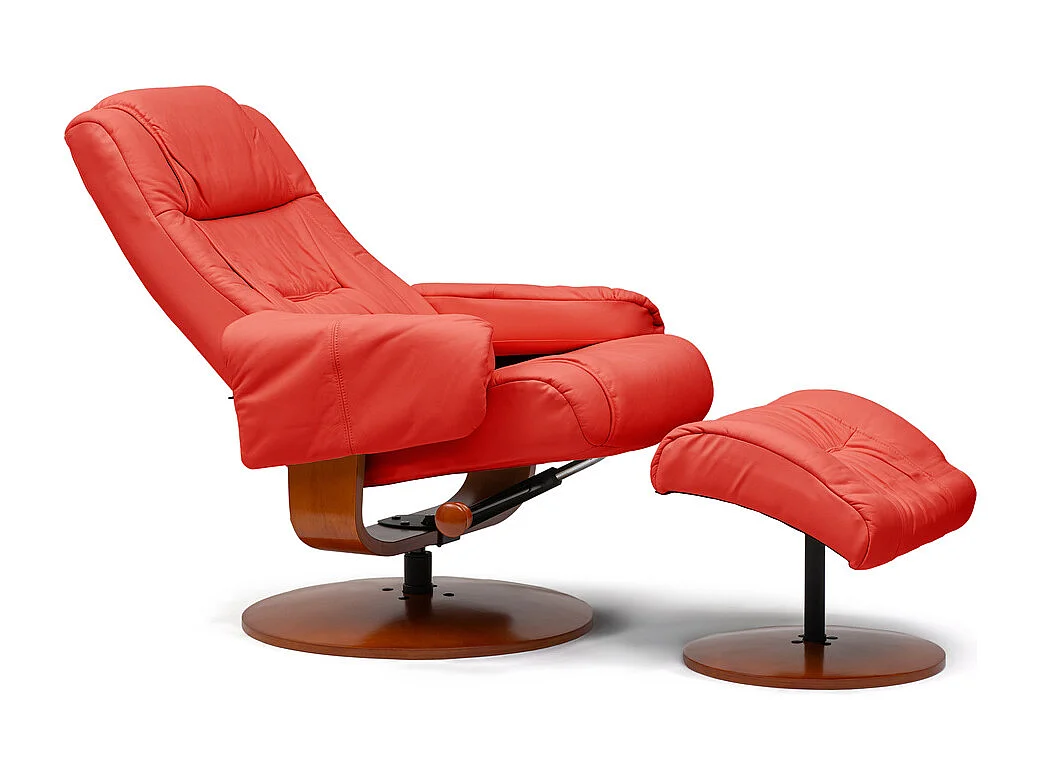 Poltrona reclinável com estrutura de madeira Kemi 7232. Poltrona: 80 x 105 x 90 / 110cm (reclinado). Otomano: 54 x 40 x 40cm. Pele Vermelha.