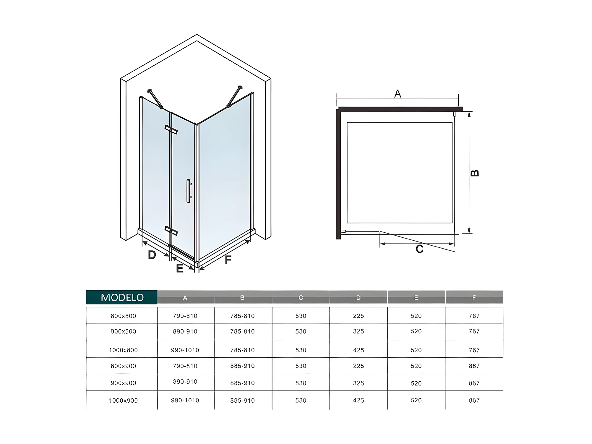 Cabine de duche quadrada Bater Perfil cromado Vidro Anticalcário 6mm (980-1000)x(980-1000)x1900mm-AICA