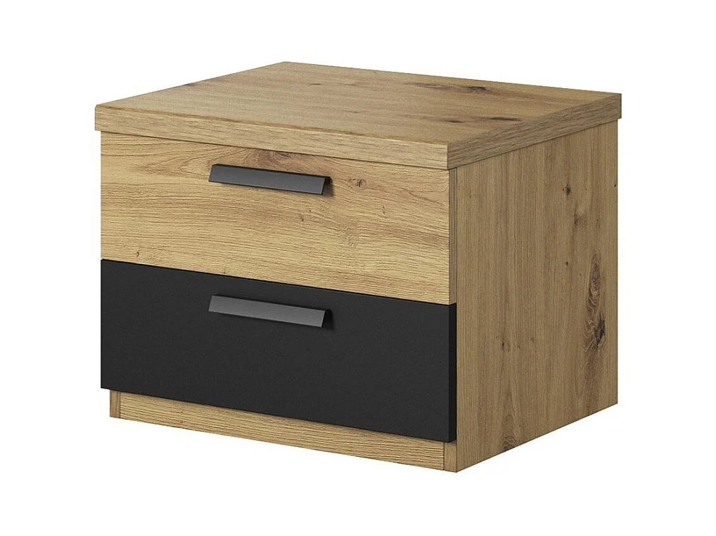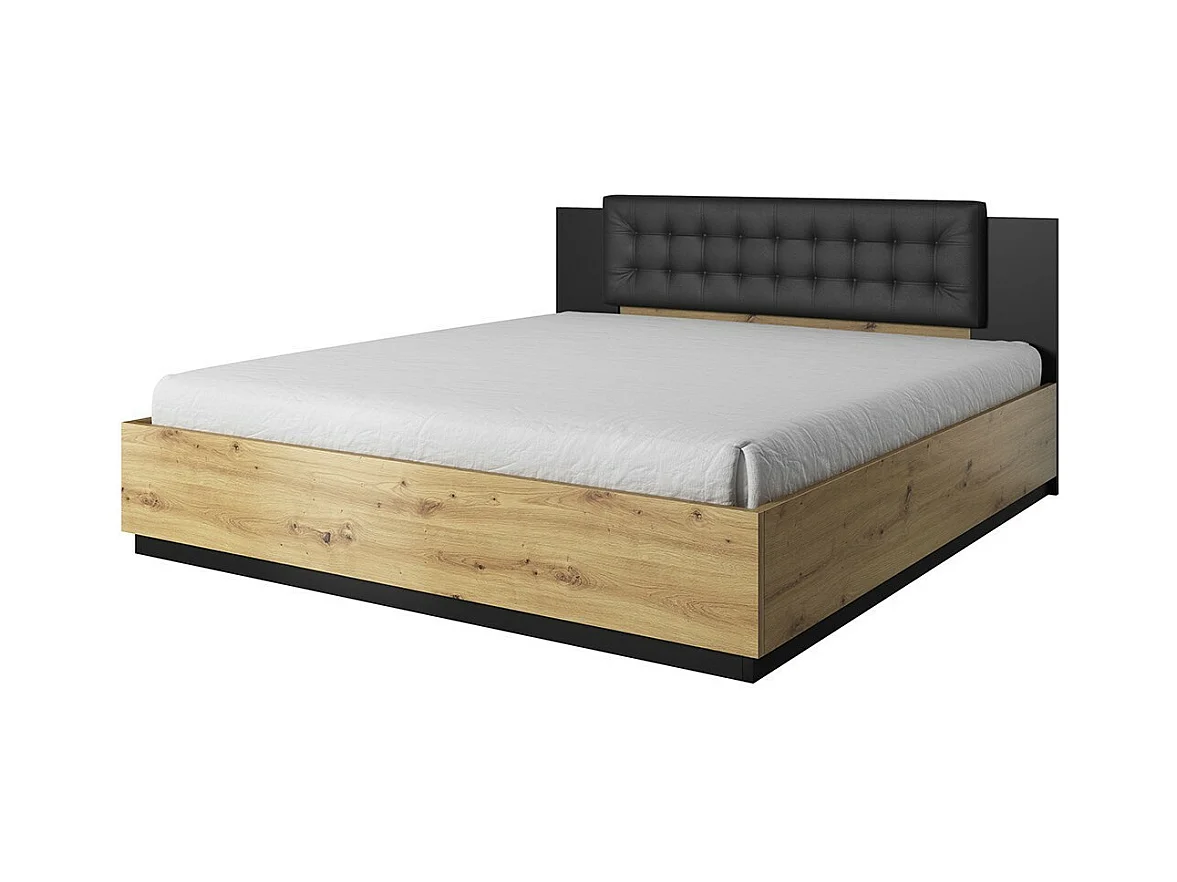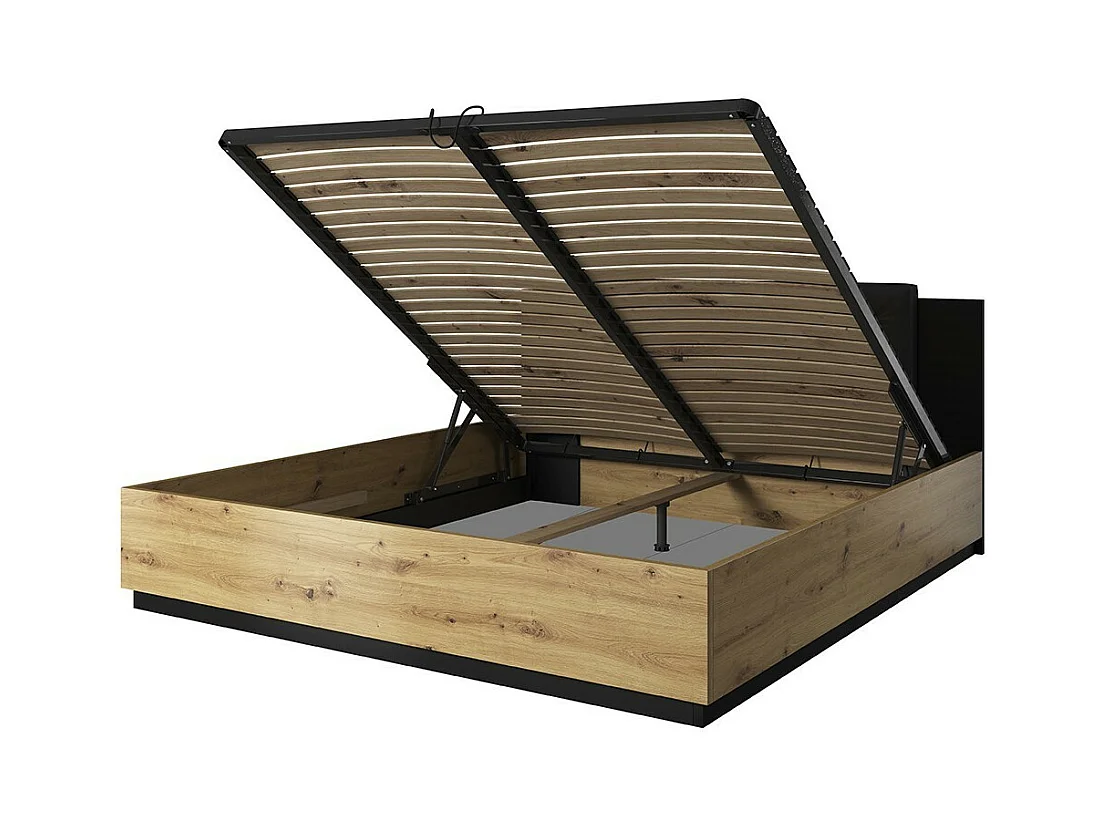 Quarto completo FOX: Cama baú 180x200, Armário, Cômoda e criados-mudos. Cor carvalho claro e preto.
