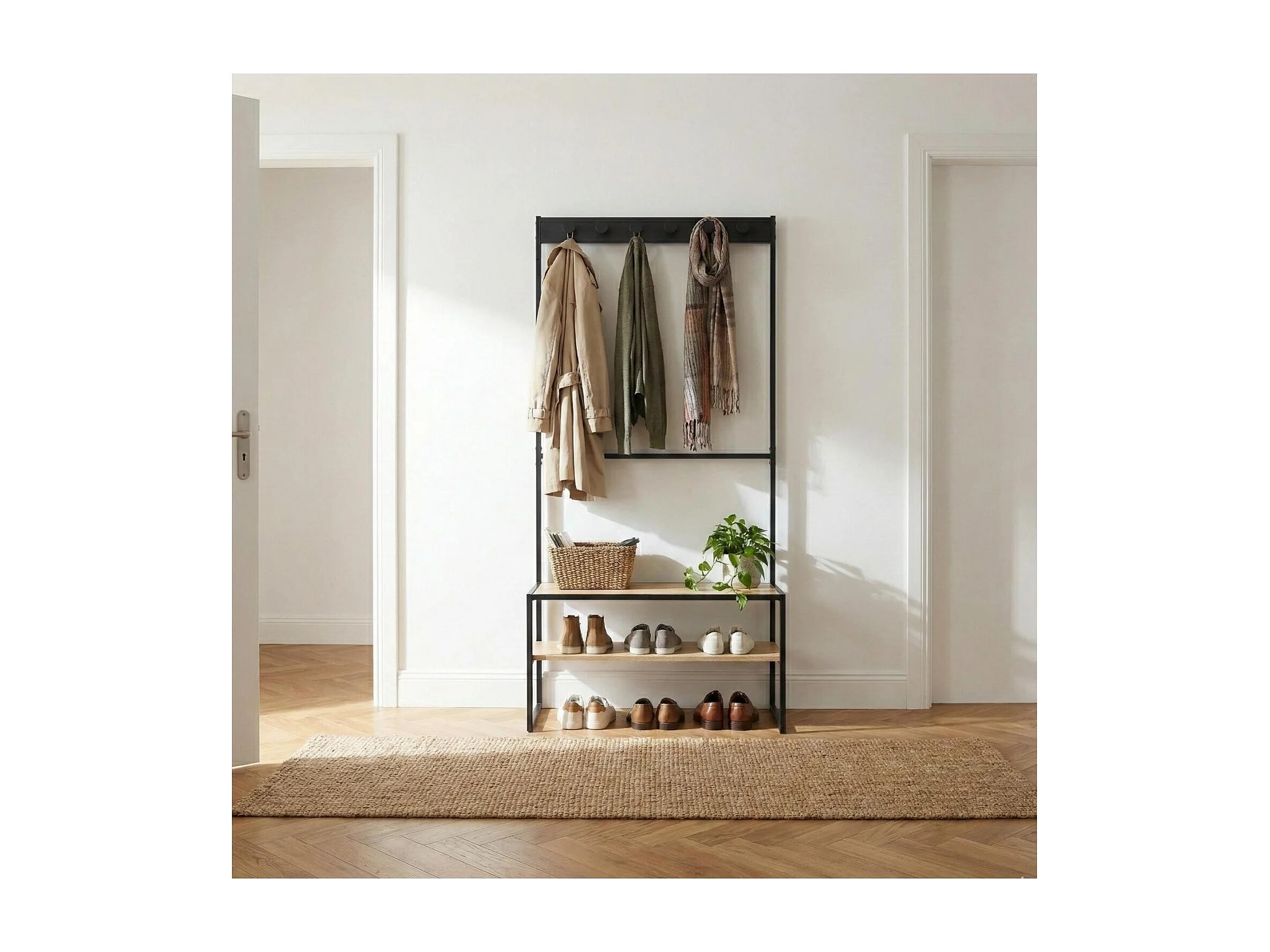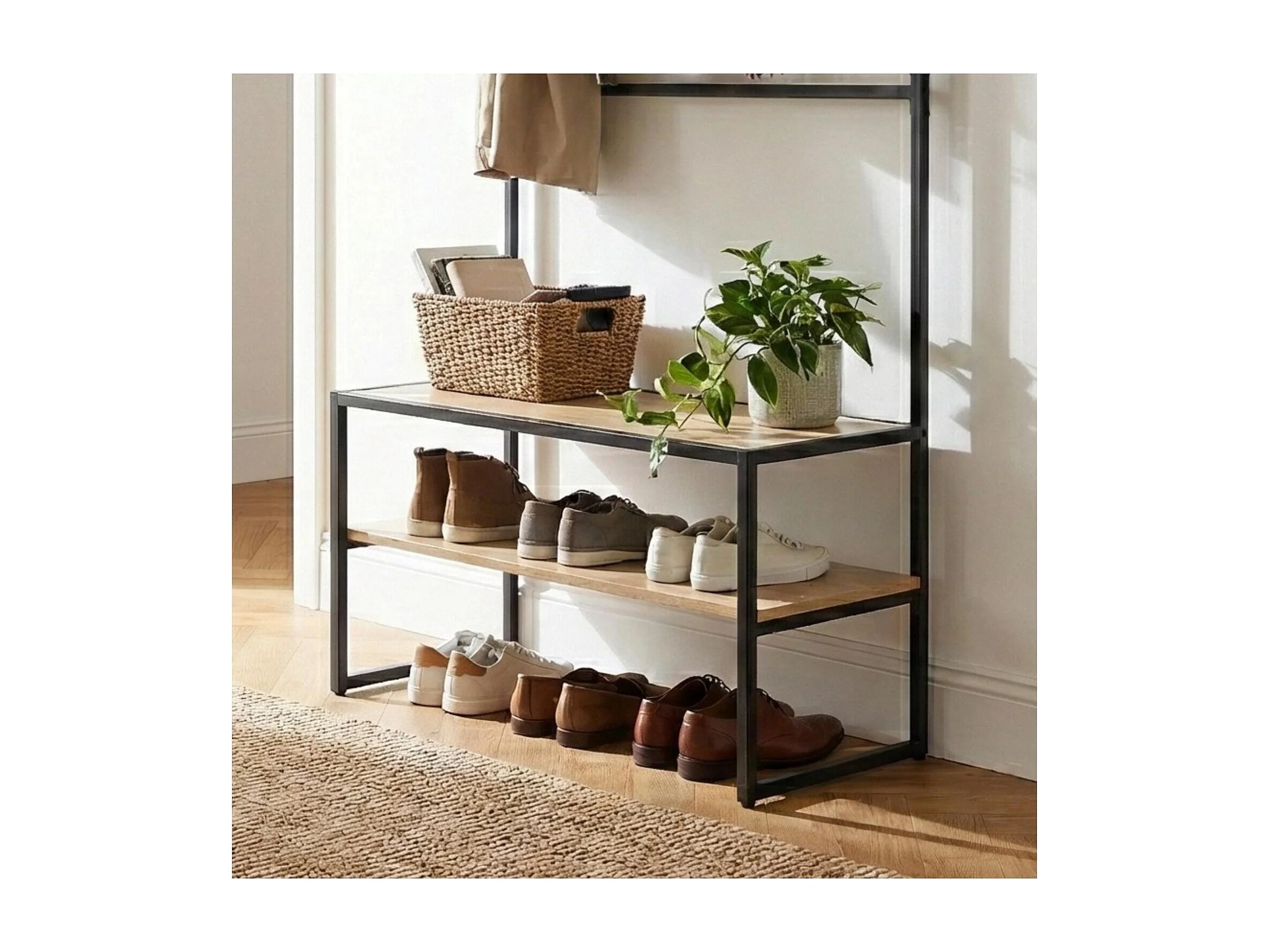 Conjunto de vestiário de entrada 110x38x186 cm - 3 portas e 2 gavetas - Com cabideiro - Prateleiras abertas - Bege e cinza