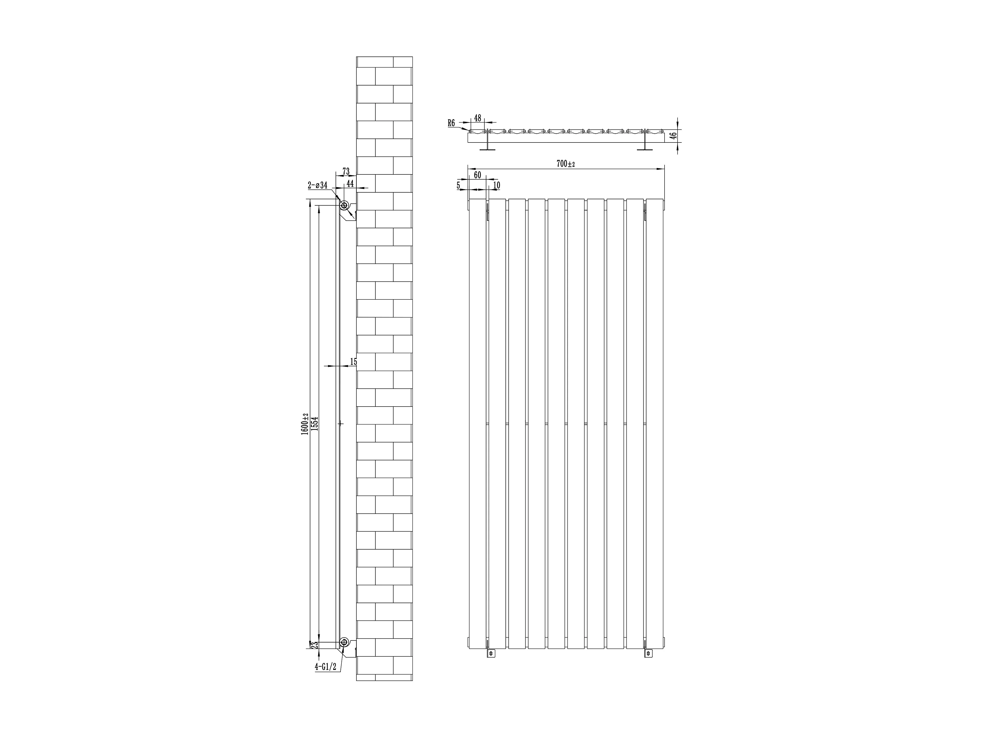 Radiador Plano Coluna Única 1600x700 mm - Preto, Aço Carbono 1,5 mm, 1568W, Alta Eficiência, Válvulas Termostáticas Incluídas, Fácil Instalação e Durável