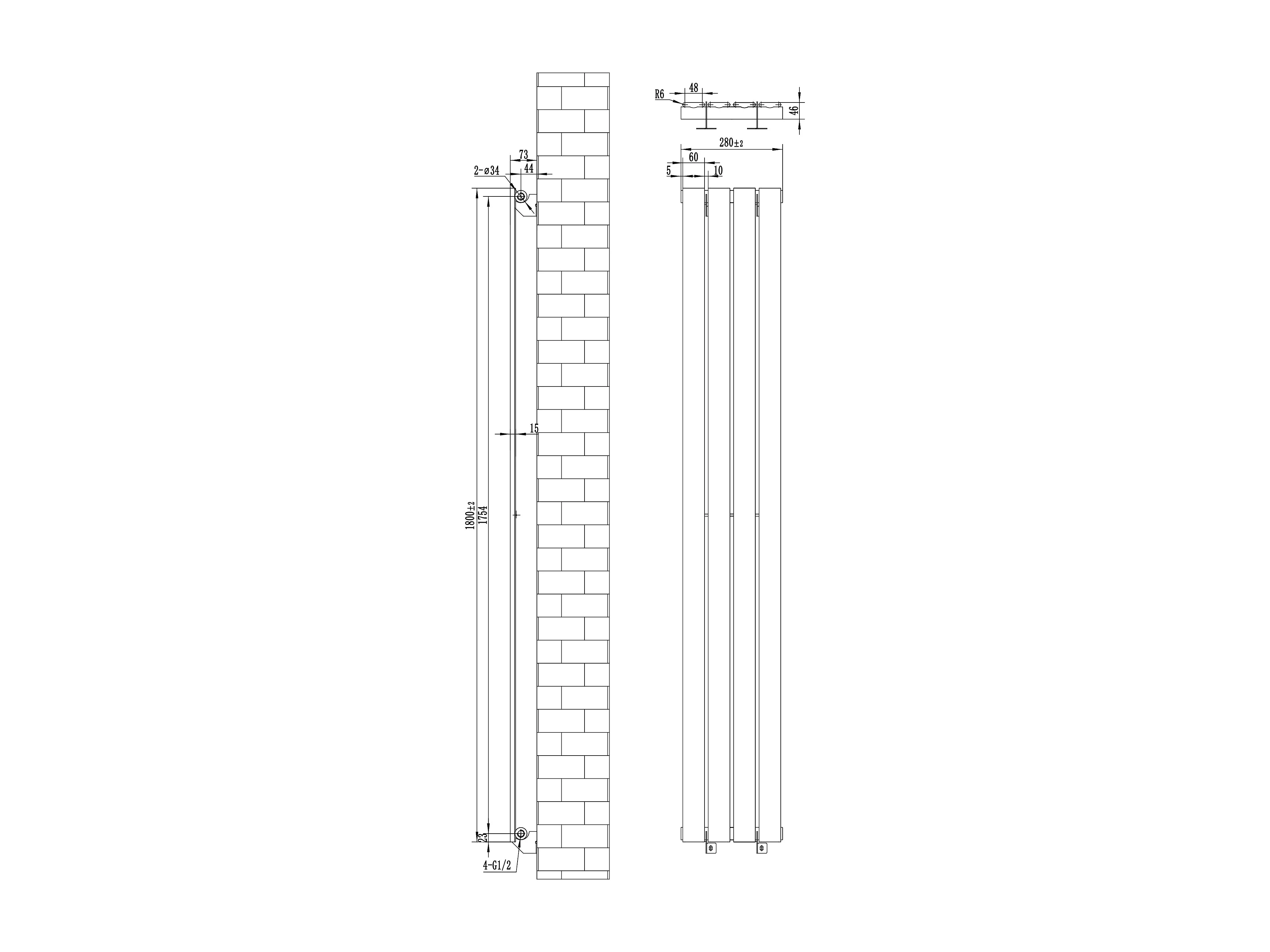 Radiador Plano Coluna Única 1800x280 mm - Preto, Aço Carbono 1,5 mm, 707W, Alta Eficiência, Válvulas Termostáticas Incluídas, Fácil Instalação e Durável