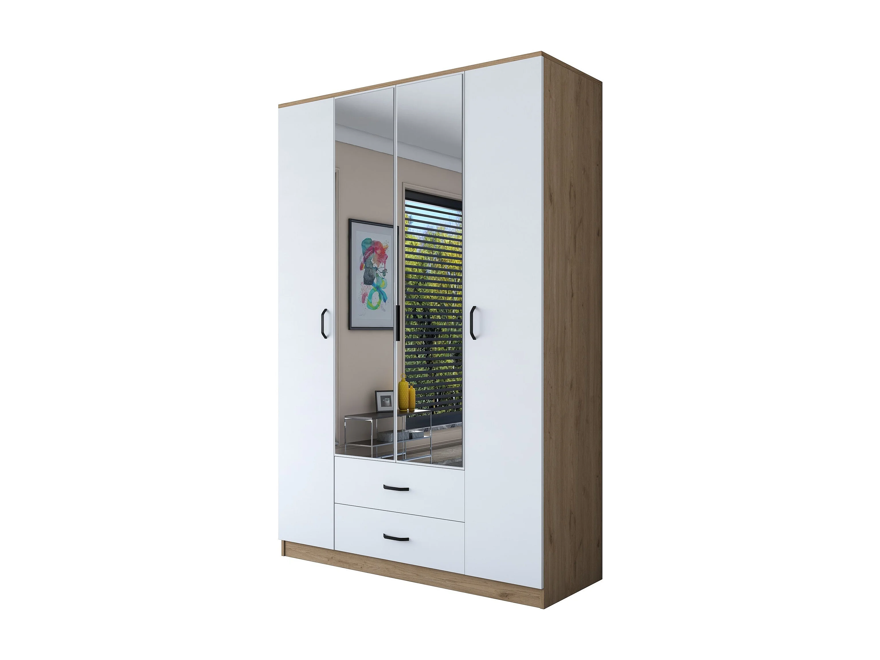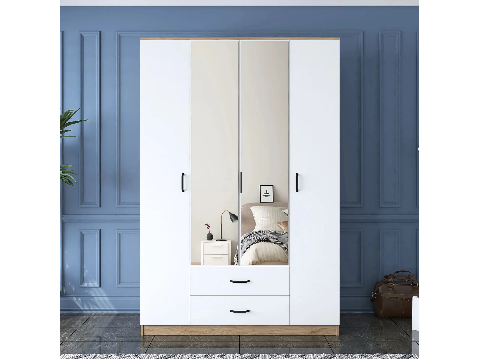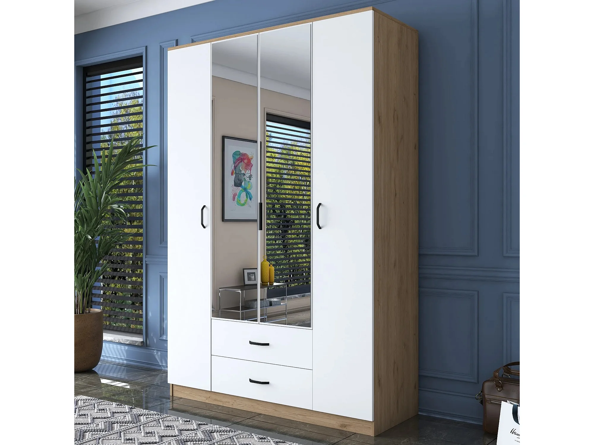 Roupeiro Freya com Espelho - 4 Portas e 2 Gavetas em Nogueira e Branco, 210x210x51.5cm