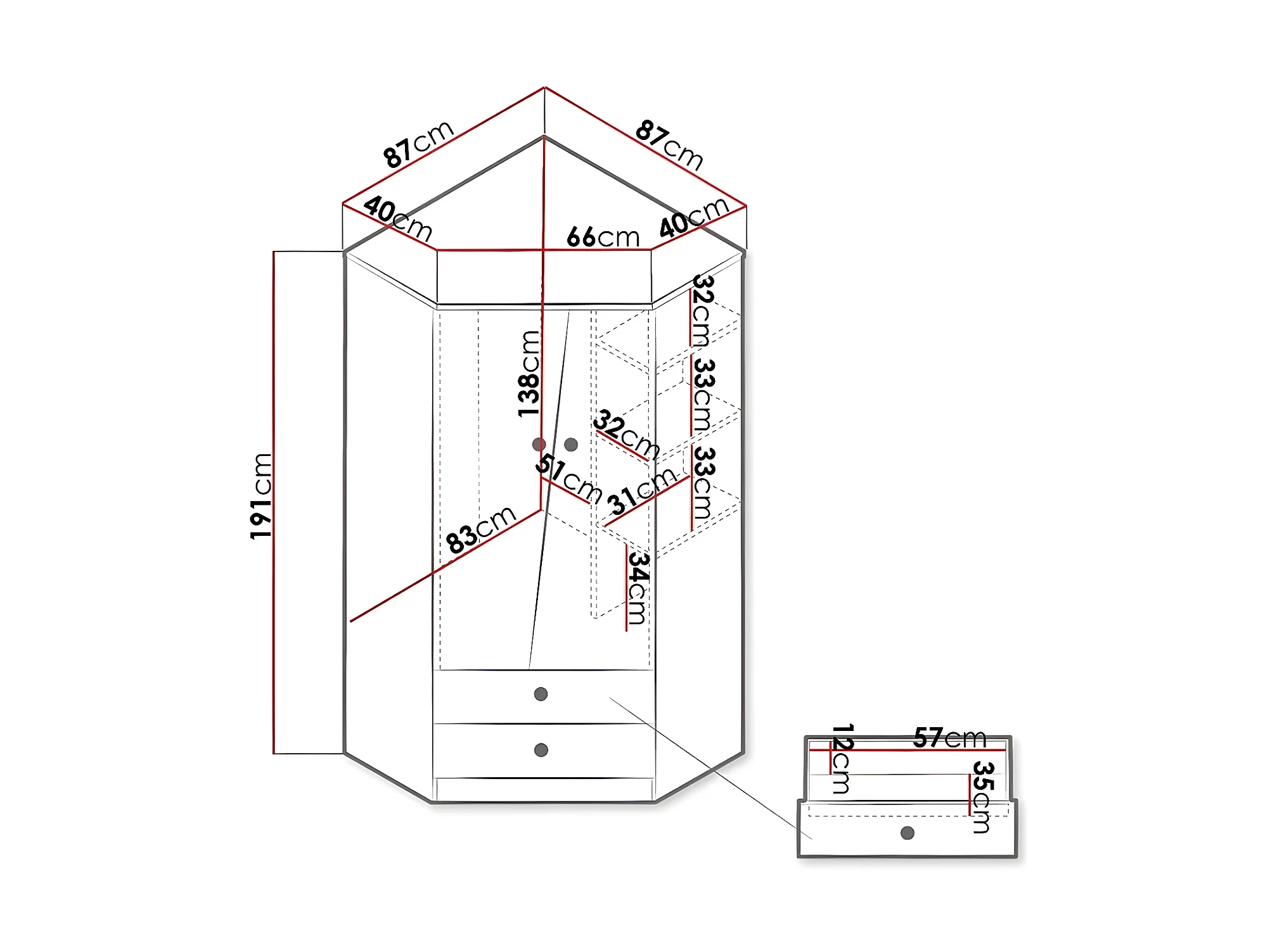 Roupeiro para cantos Akron F102, Número de prateleiras: 3, 190x87x87cm