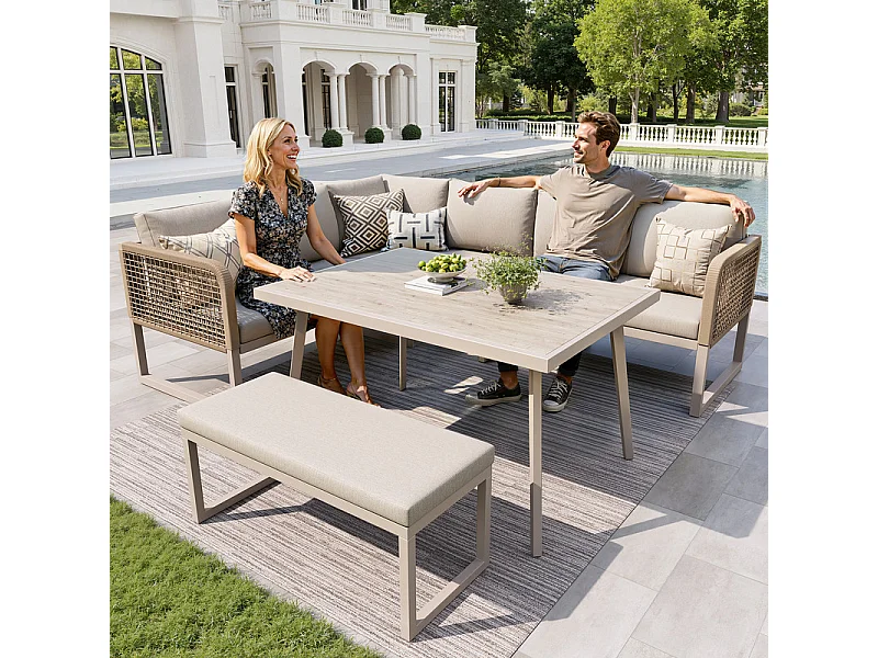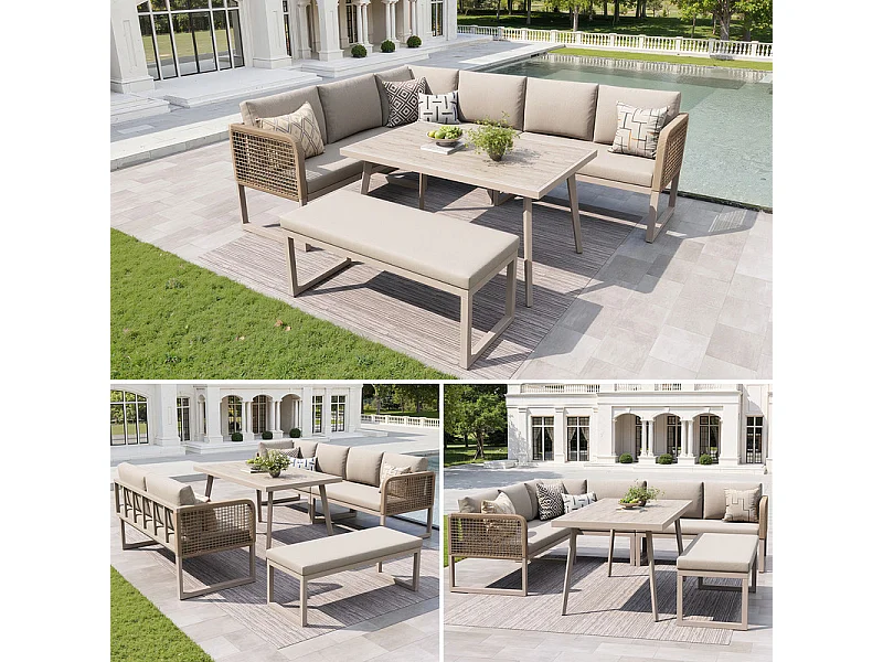 Sala de jardim de canto modular em metal - 6 a 8 lugares - com almofadas removíveis e laváveis - Bege