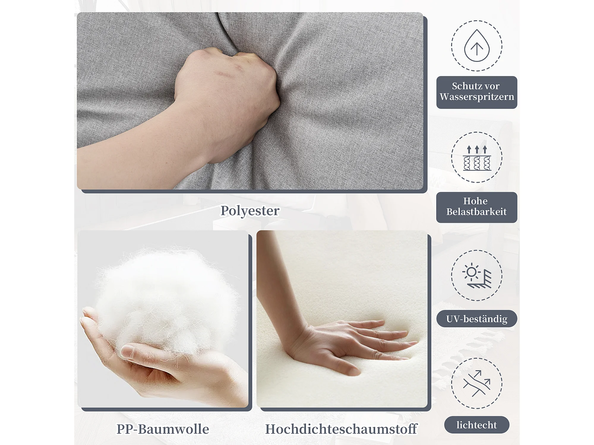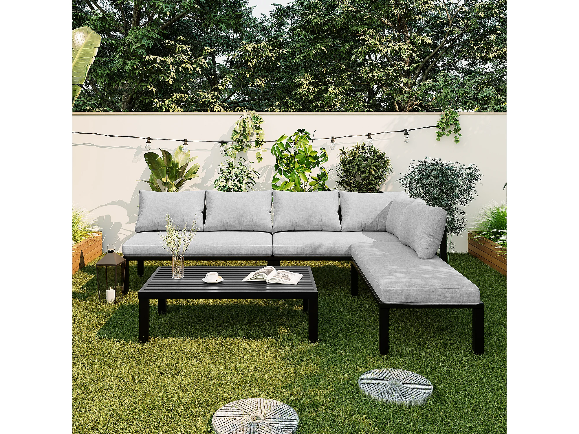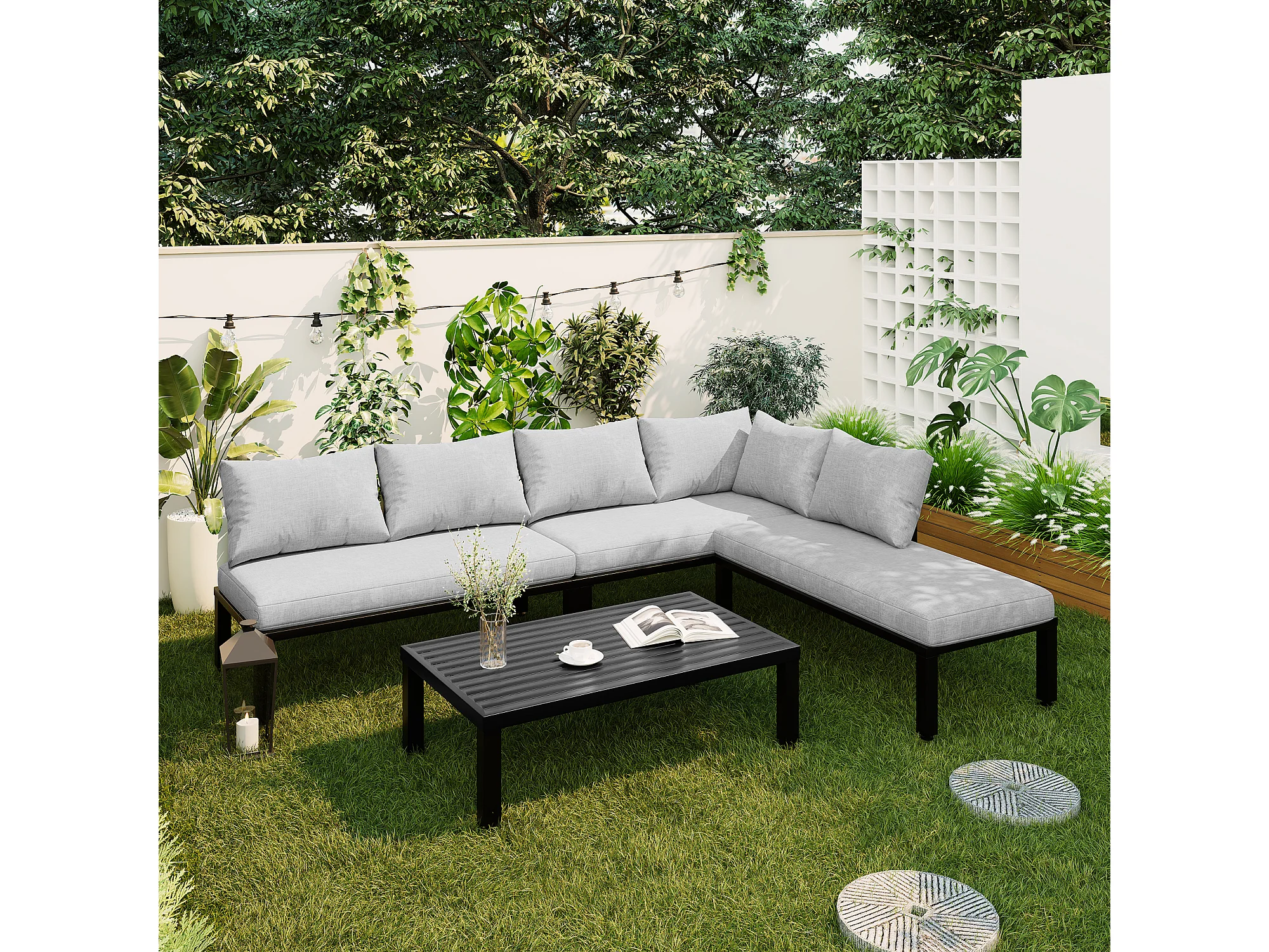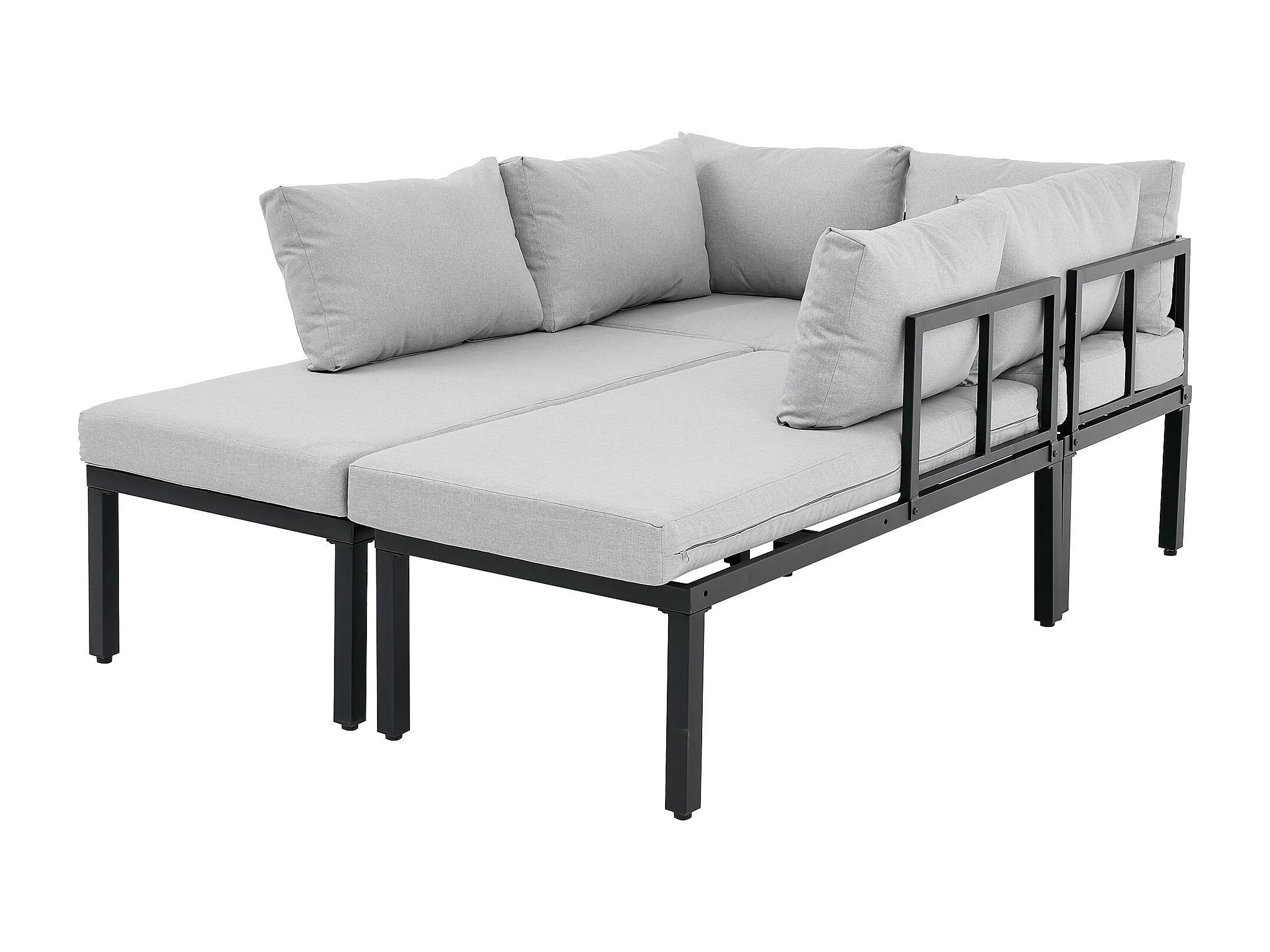 Sala de Jardim Modular 6 Lugares con Mesa de Centro - Sofá de Canto con Encosto Removível - Estrutura de Aço Galvanizado - Cinza