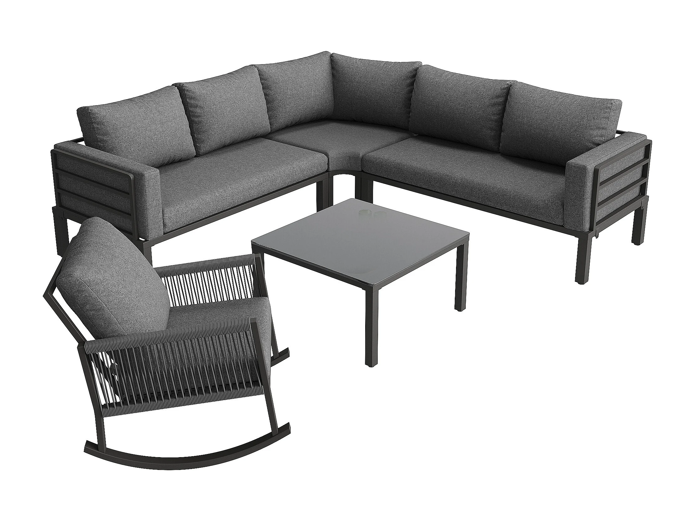 Sala de Jardim Modular 6 Lugares con Sofá de Canto e Cadeira de Balanço - Estrutura Metal e Corda Trançada - Mesa de Vidro - Cinza