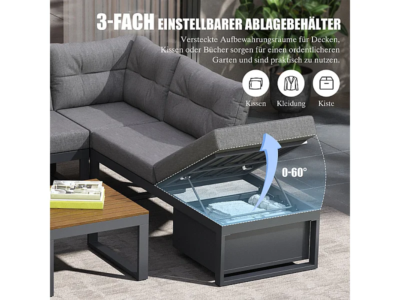 Sala de jardim modular em ferro: 1 sofá de canto elevável + 2 mesas de centro - 3 níveis ajustáveis + arrumação - Cinzento
