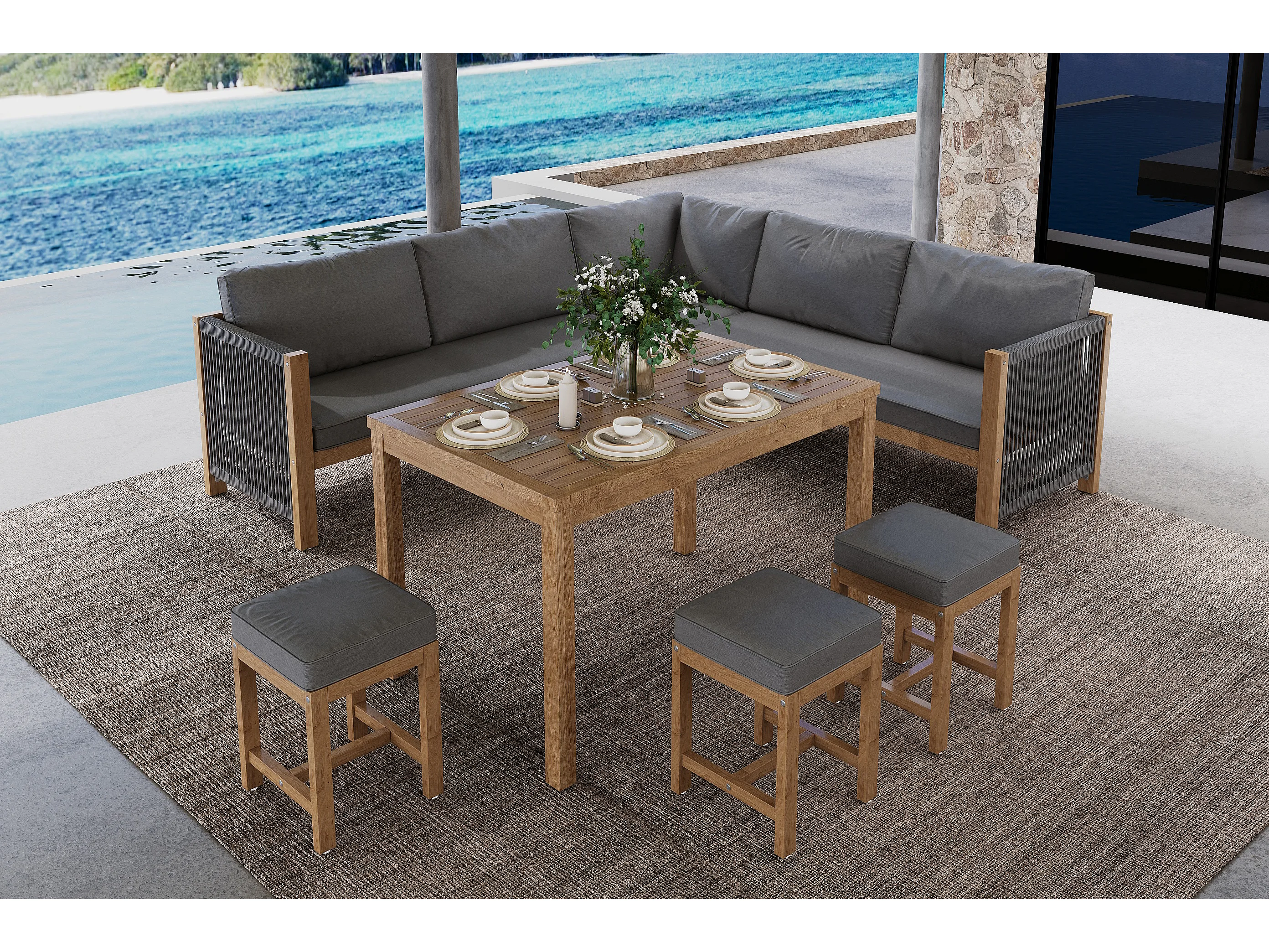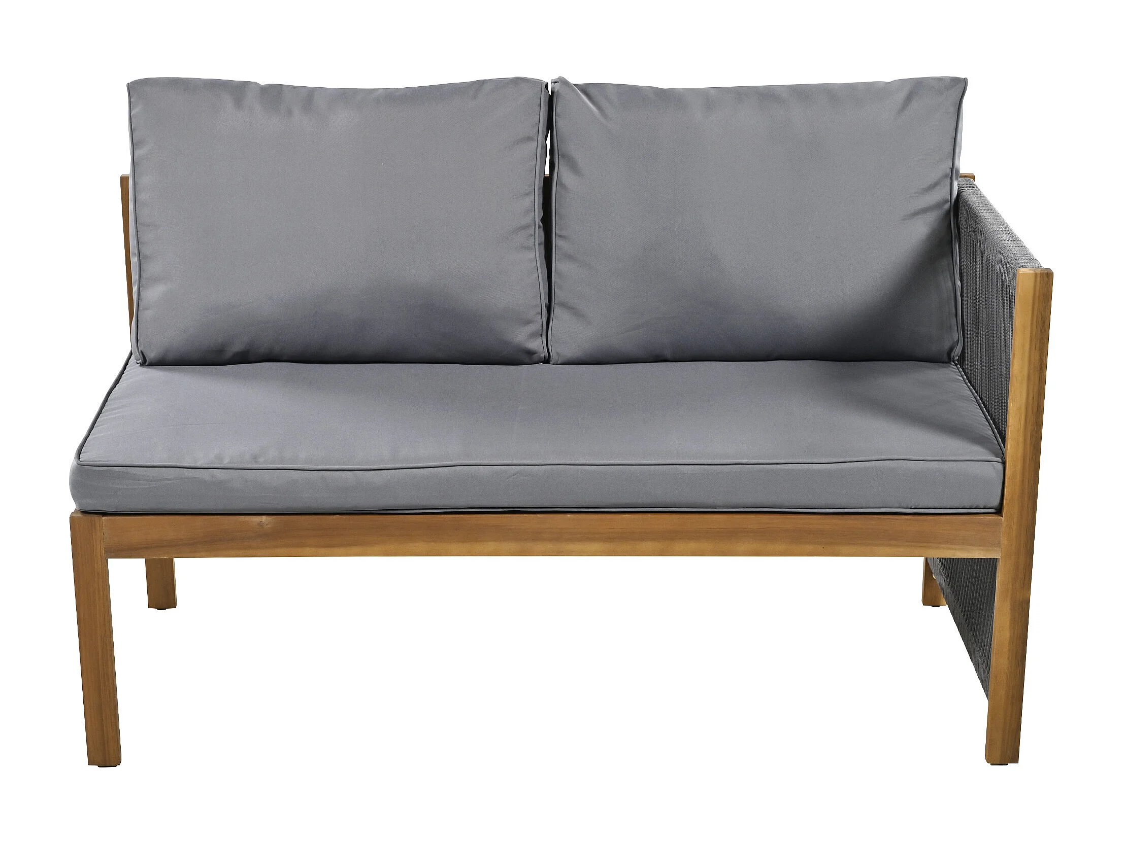Sala de jardim para 7-8 pessoas - 2 sofás, 3 banquetas e 1 mesa de jantar - estrutura em Madeira de acácia - Cinza