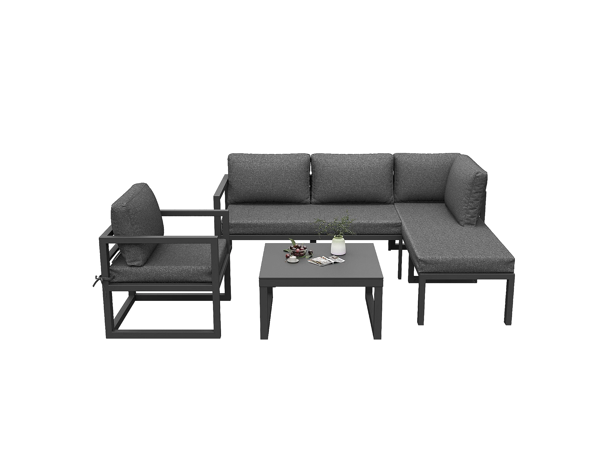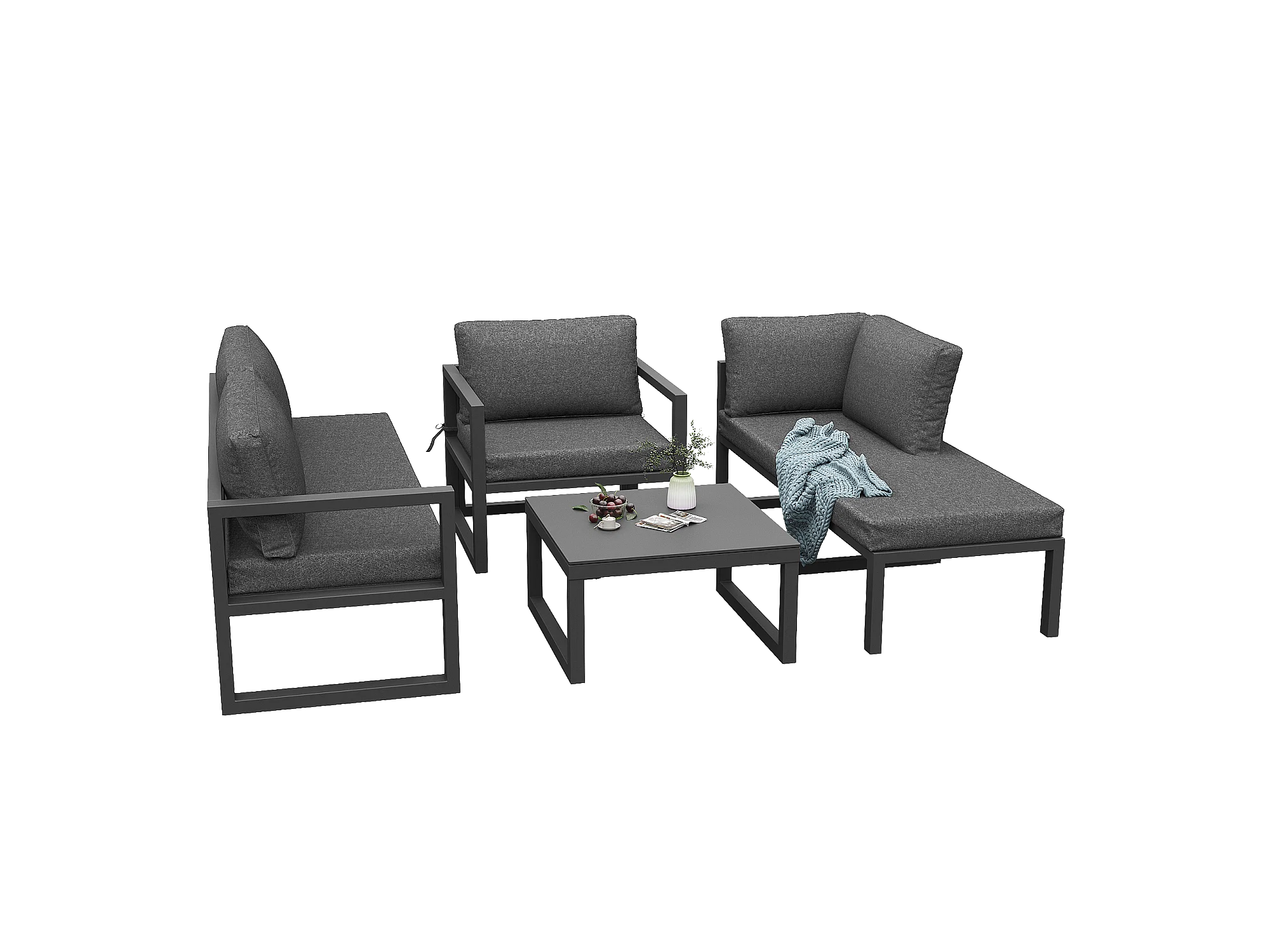 Salão de jardim em corda, para 4 pessoas, canapé de canto - em ferro galvanizado, pés ajustáveis, em vidro temperado com padrão marmoreado, cinza