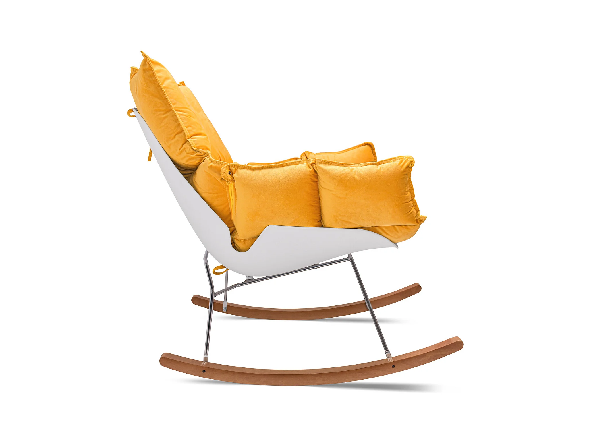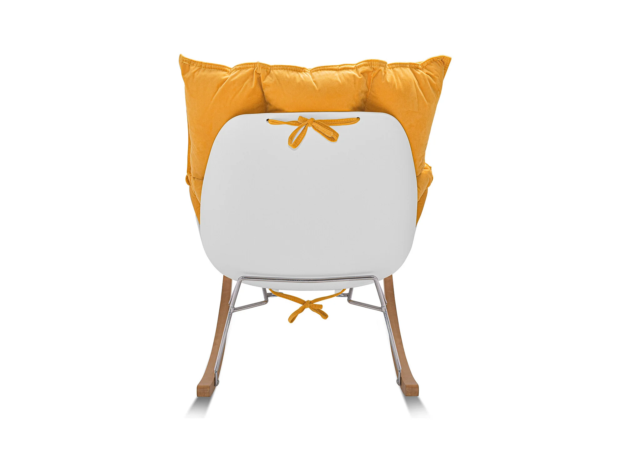 Santiago - Poltrona de Balanço Design em Pp e Madeira de Pinho. Cadeira de Baloiço com Almofada de Veludo Amarelo Delia Acolchoada e Acolchoada