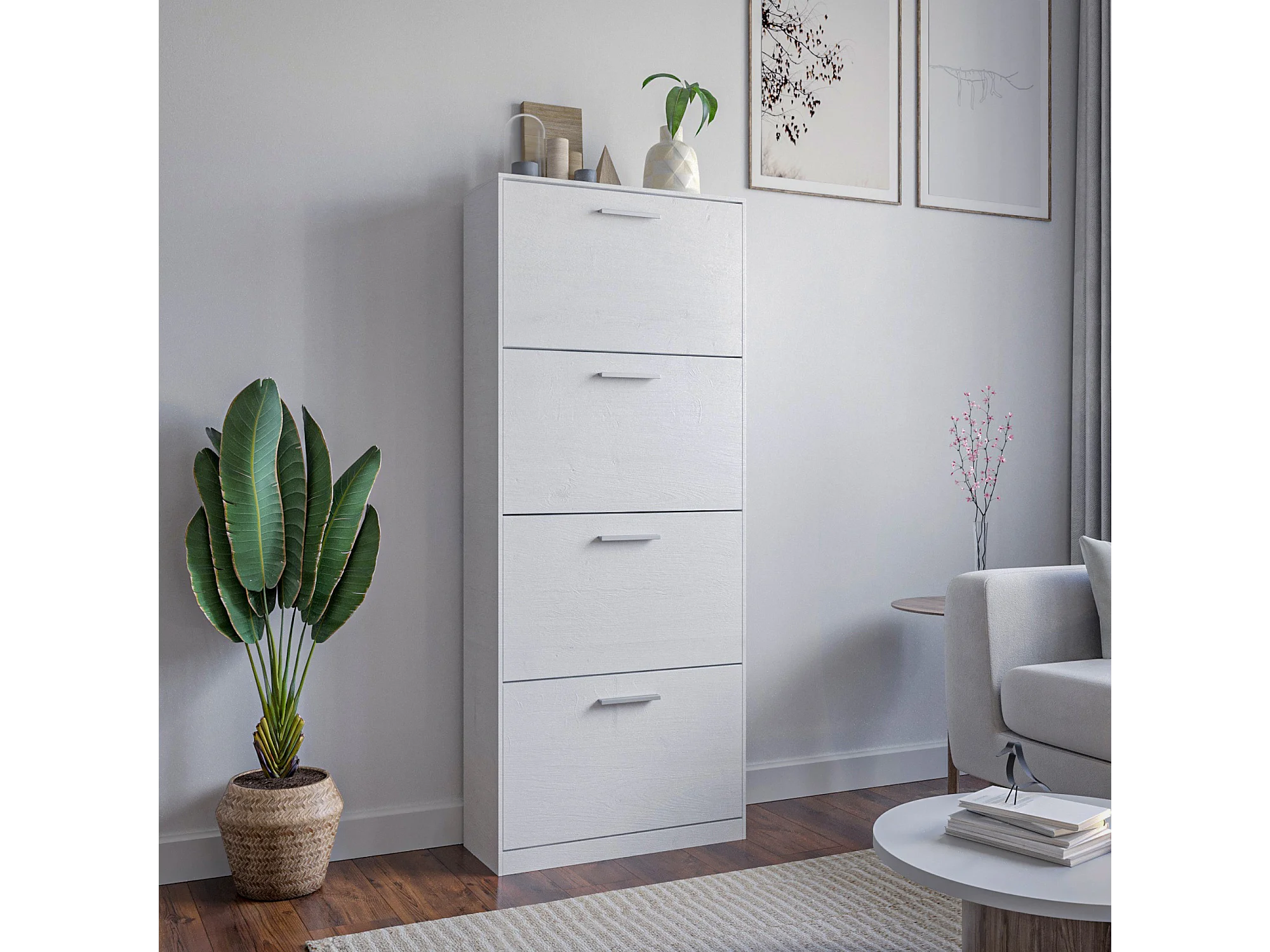 Sapateira de entrada com economia de espaço 4 portas rebatíveis, armário fino de madeira e melamina 63x24x150h, Branco - ZIK