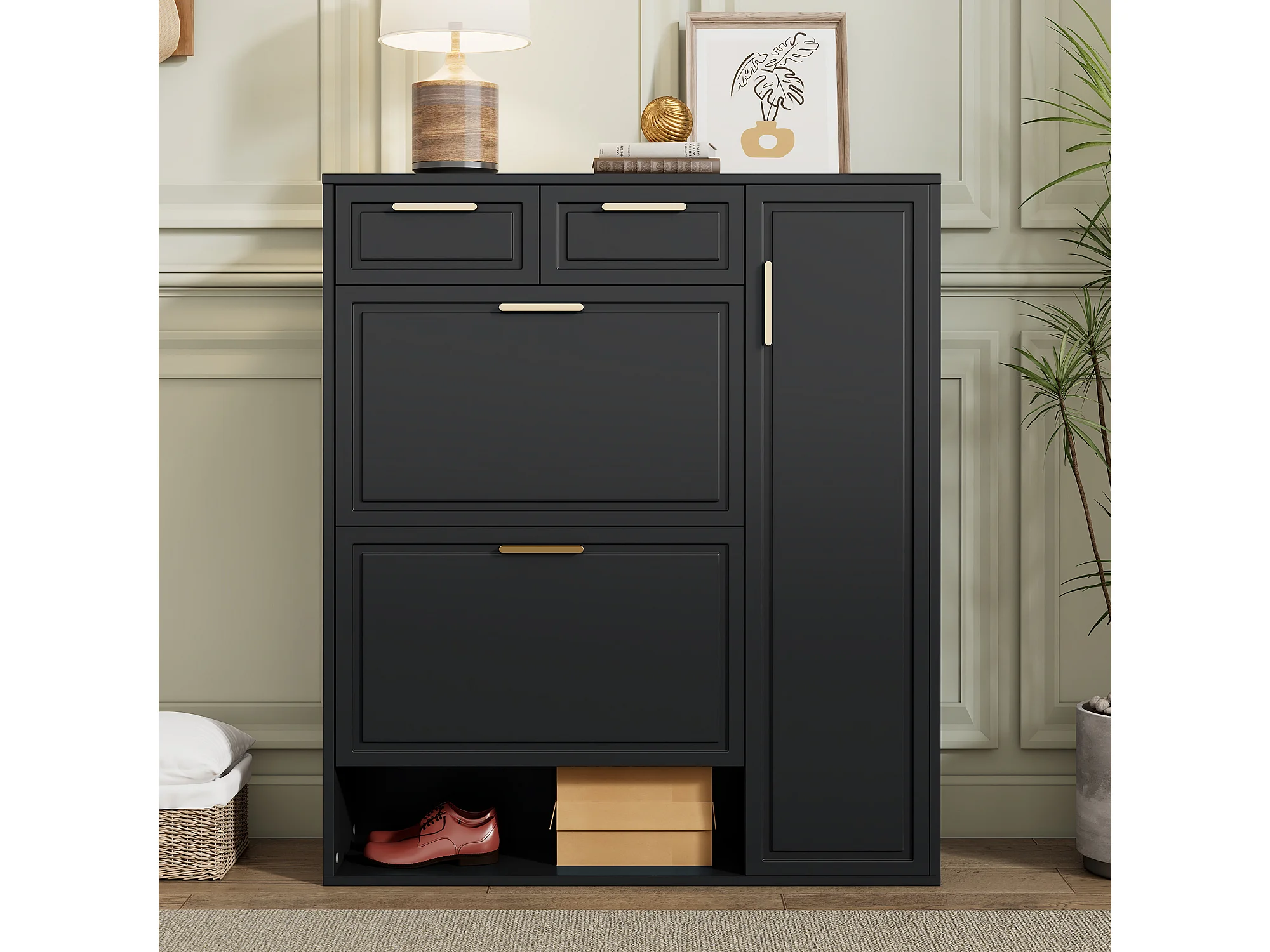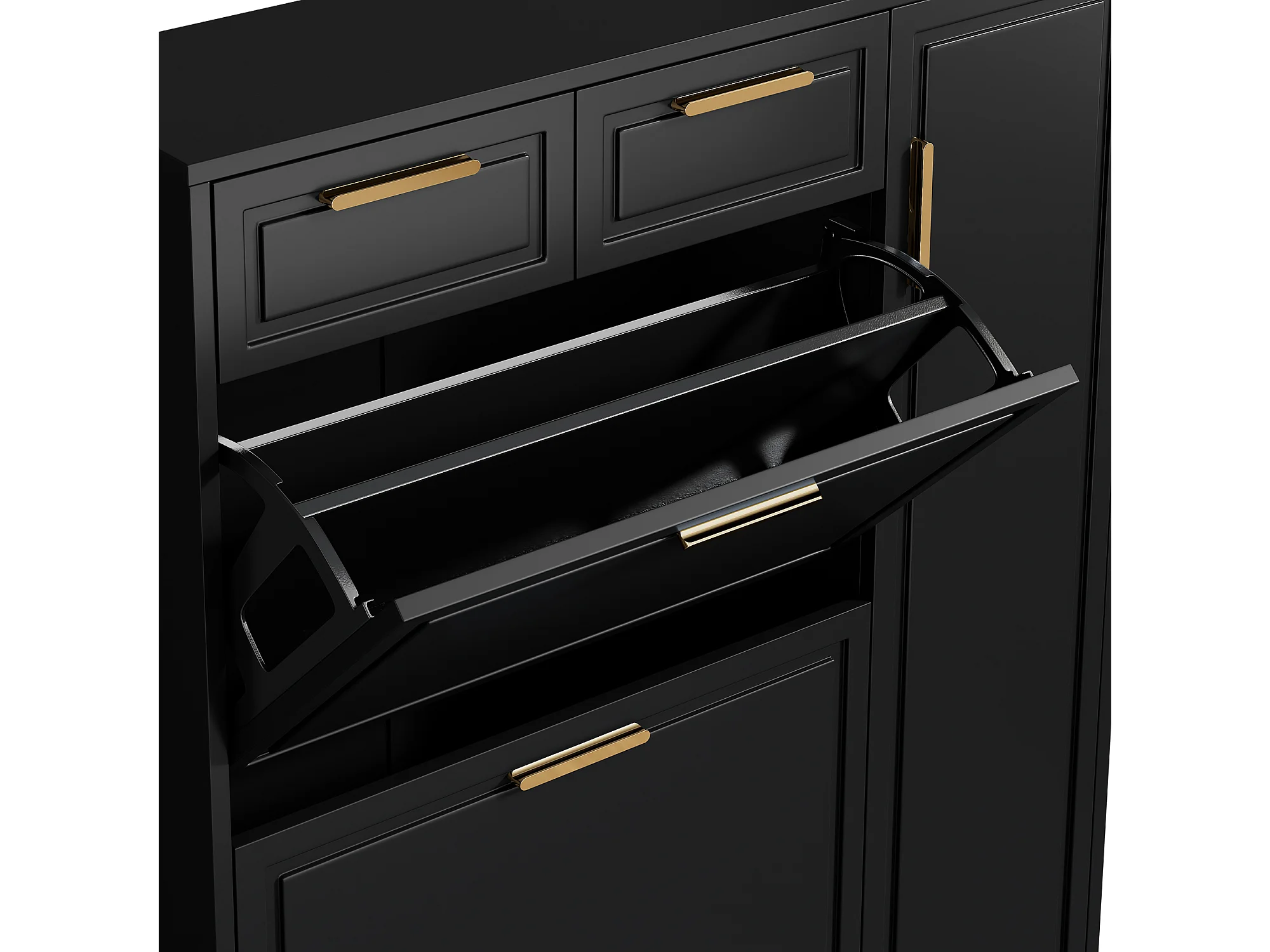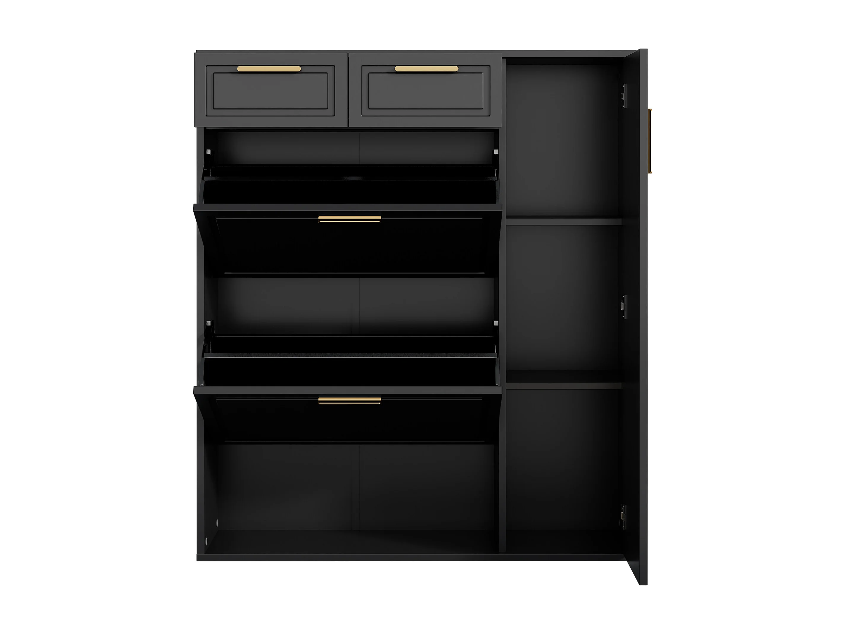 Sapateira preta 95x24x107cm em MDF com gavetas e prateleiras reguláveis para uma entrada moderna
