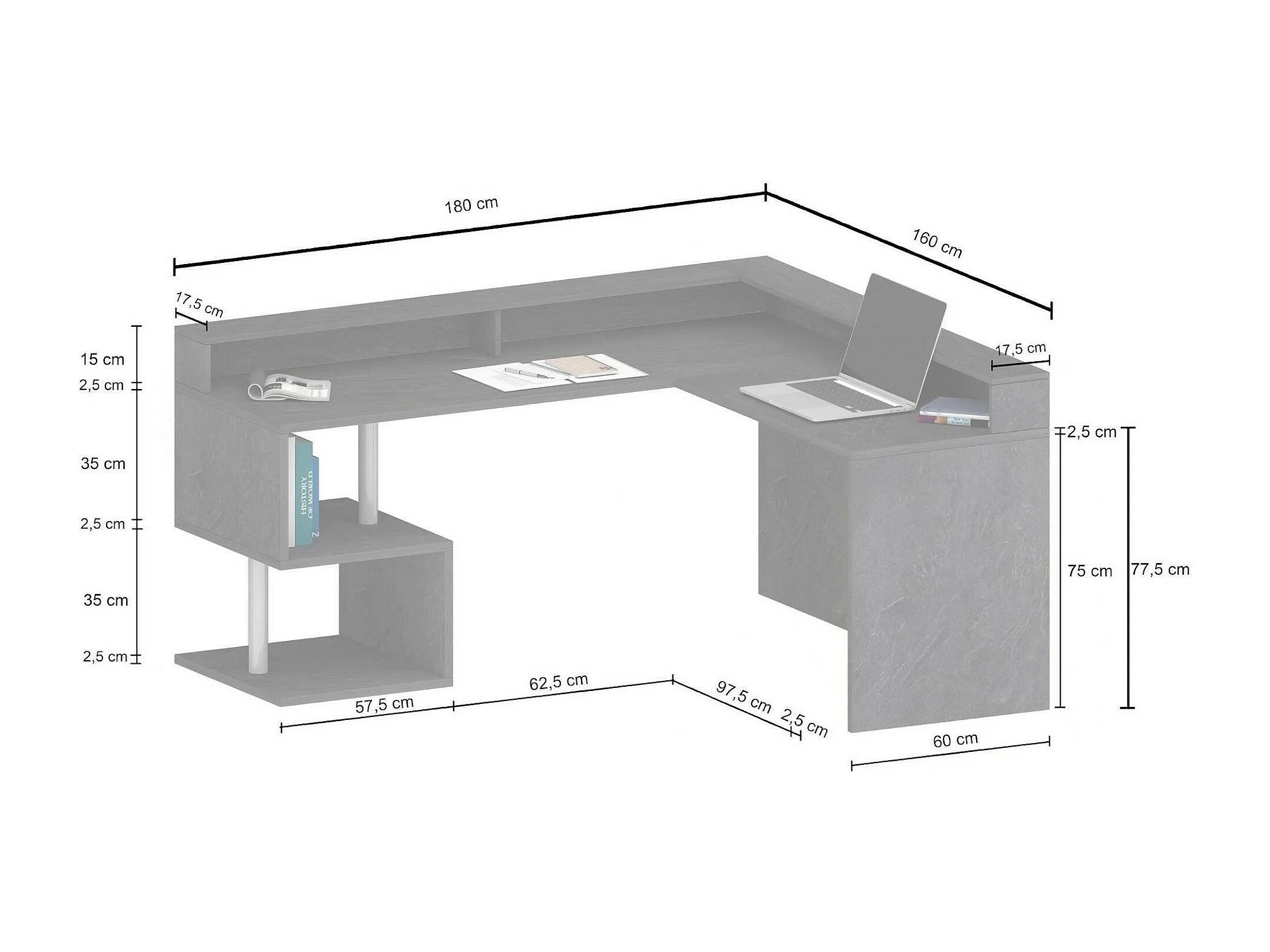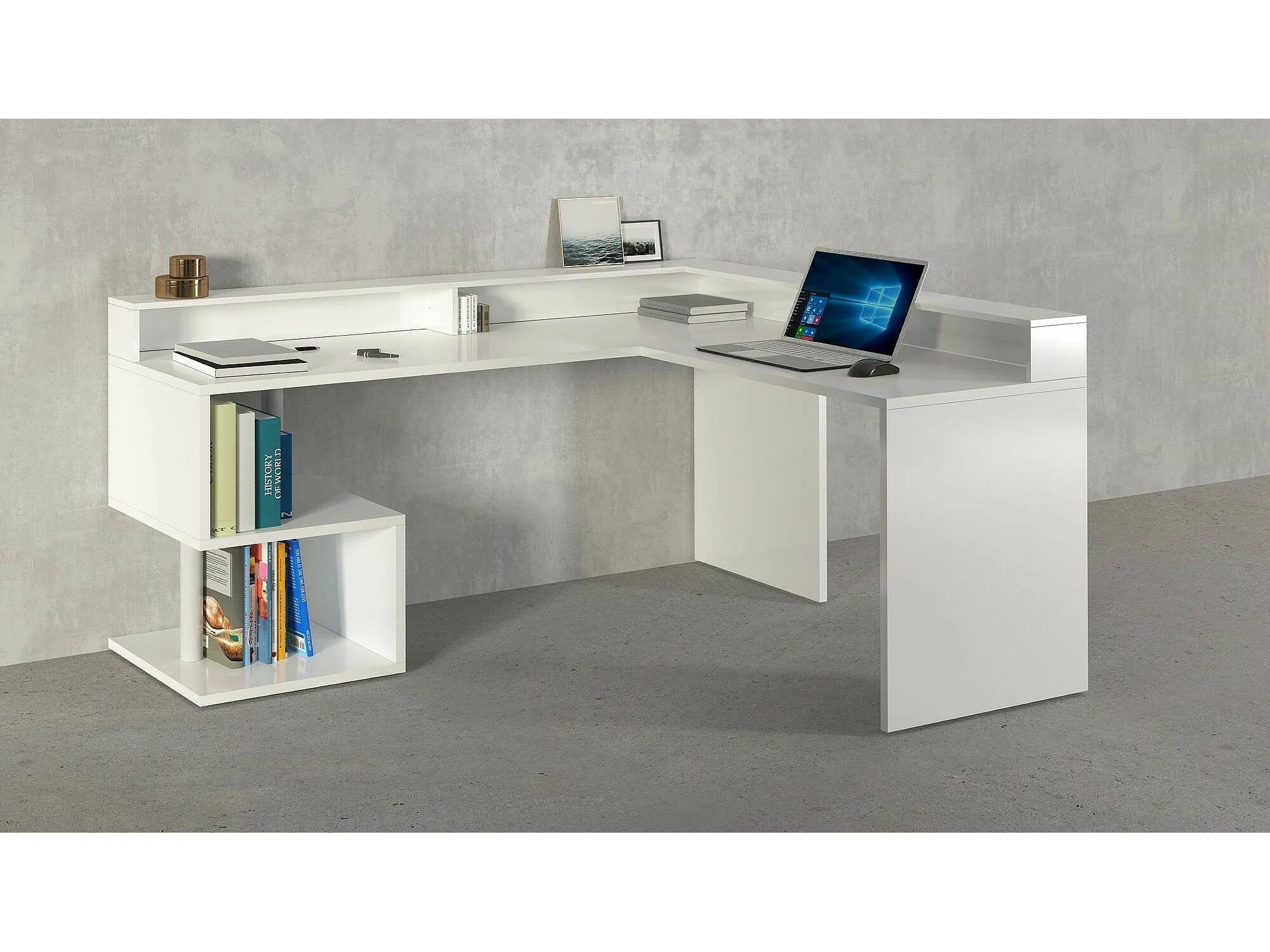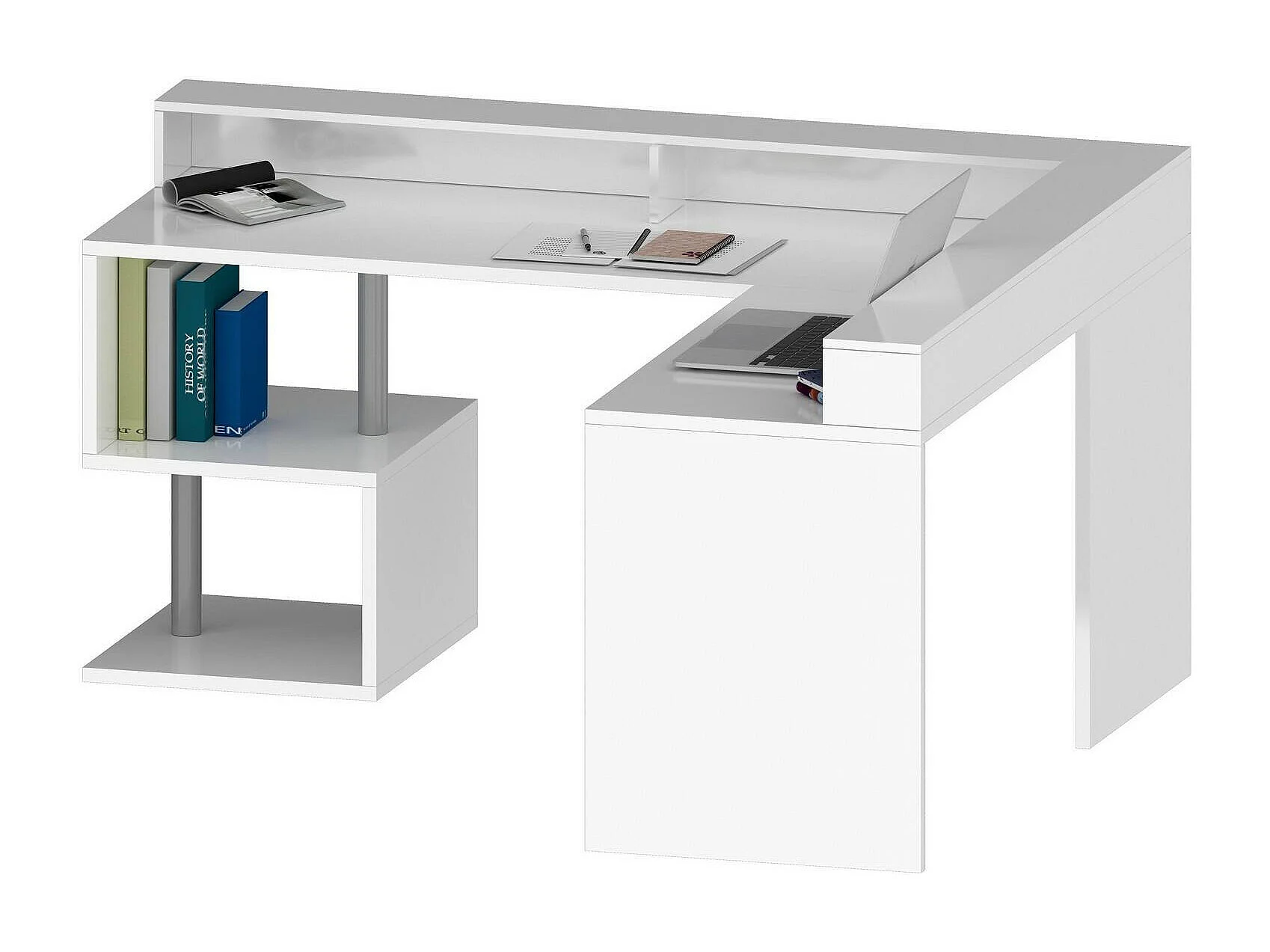 Secretária DcharPentie, Mesa de canto com prateleiras de armazenamento, Mesa de escritório multiuso com salto, 180x60h93 cm, Branco