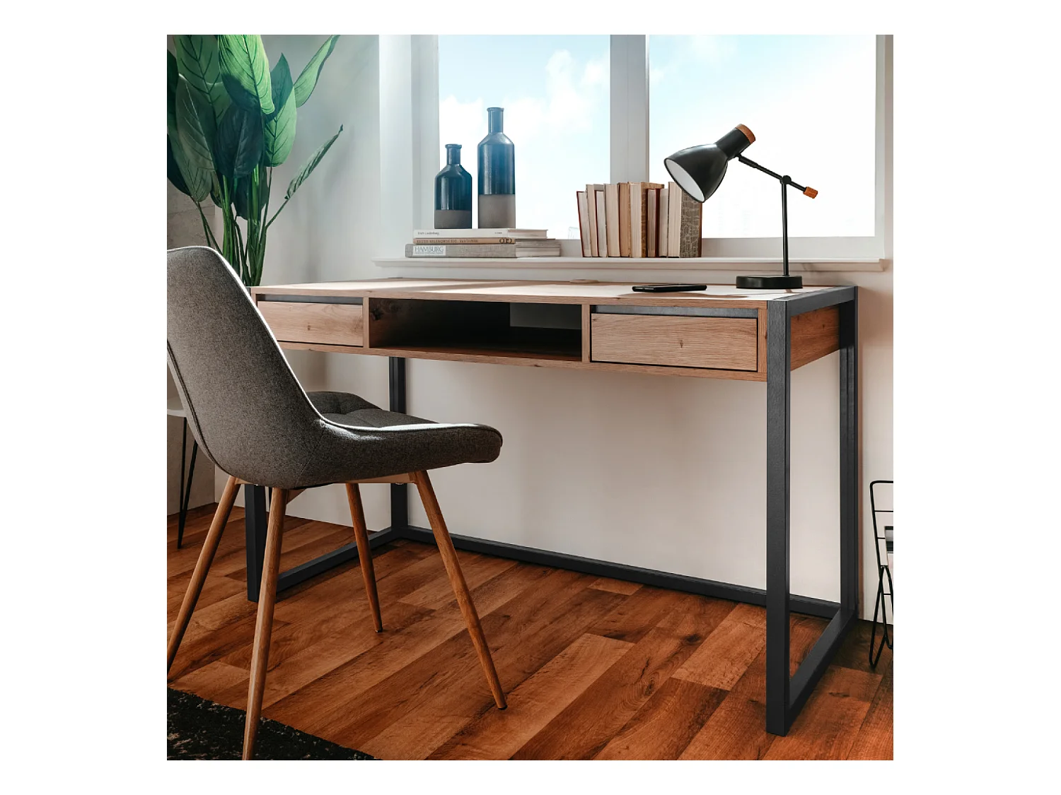 Secretária industrial de madeira e preto KOTOR com 2 gavetas e 1 prateleira de arrumação