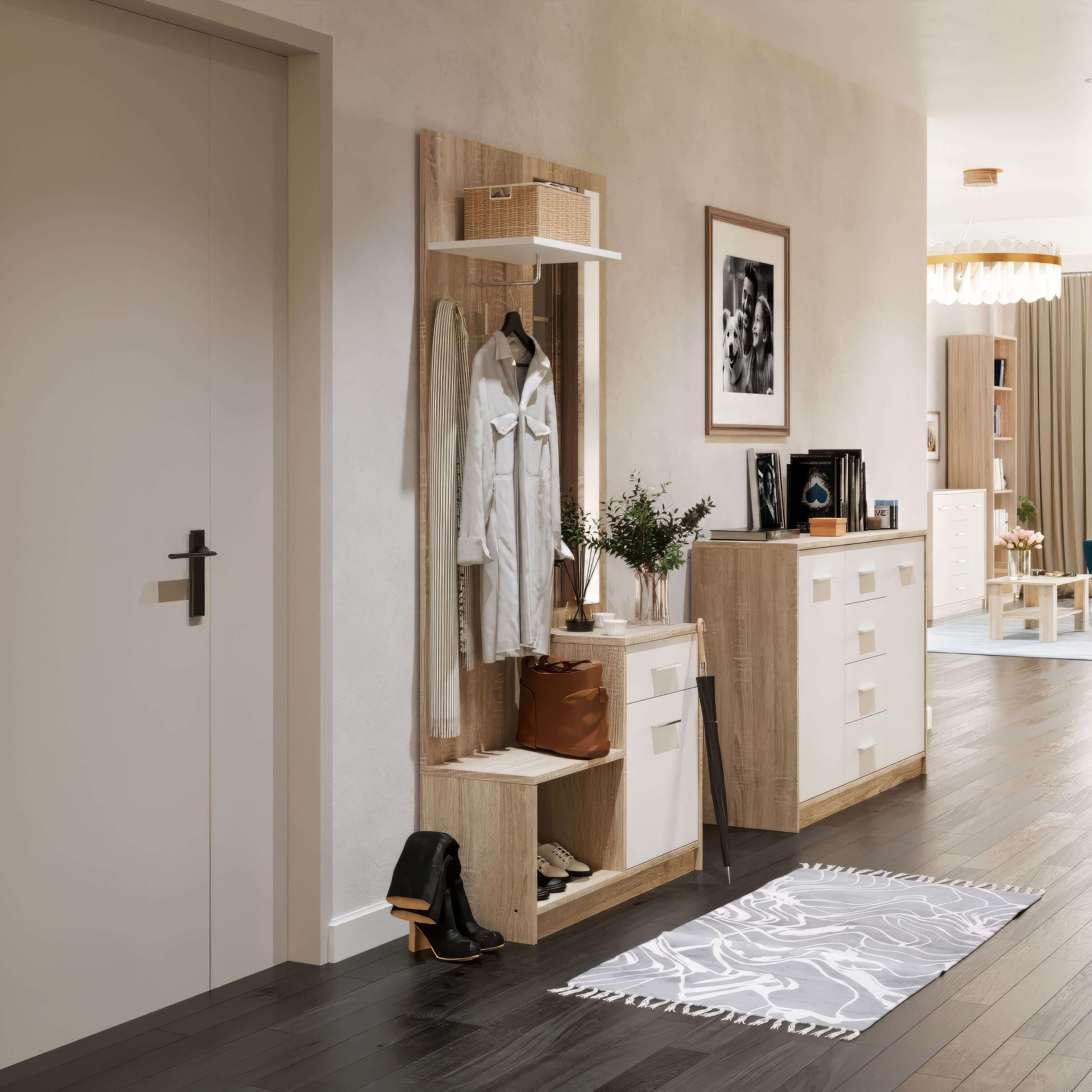Conjunto de móveis para hall de entrada: Espelho + armário para sapatos + cabideiro + armário de armazenamento – Branco laqueado – KLEANKIN