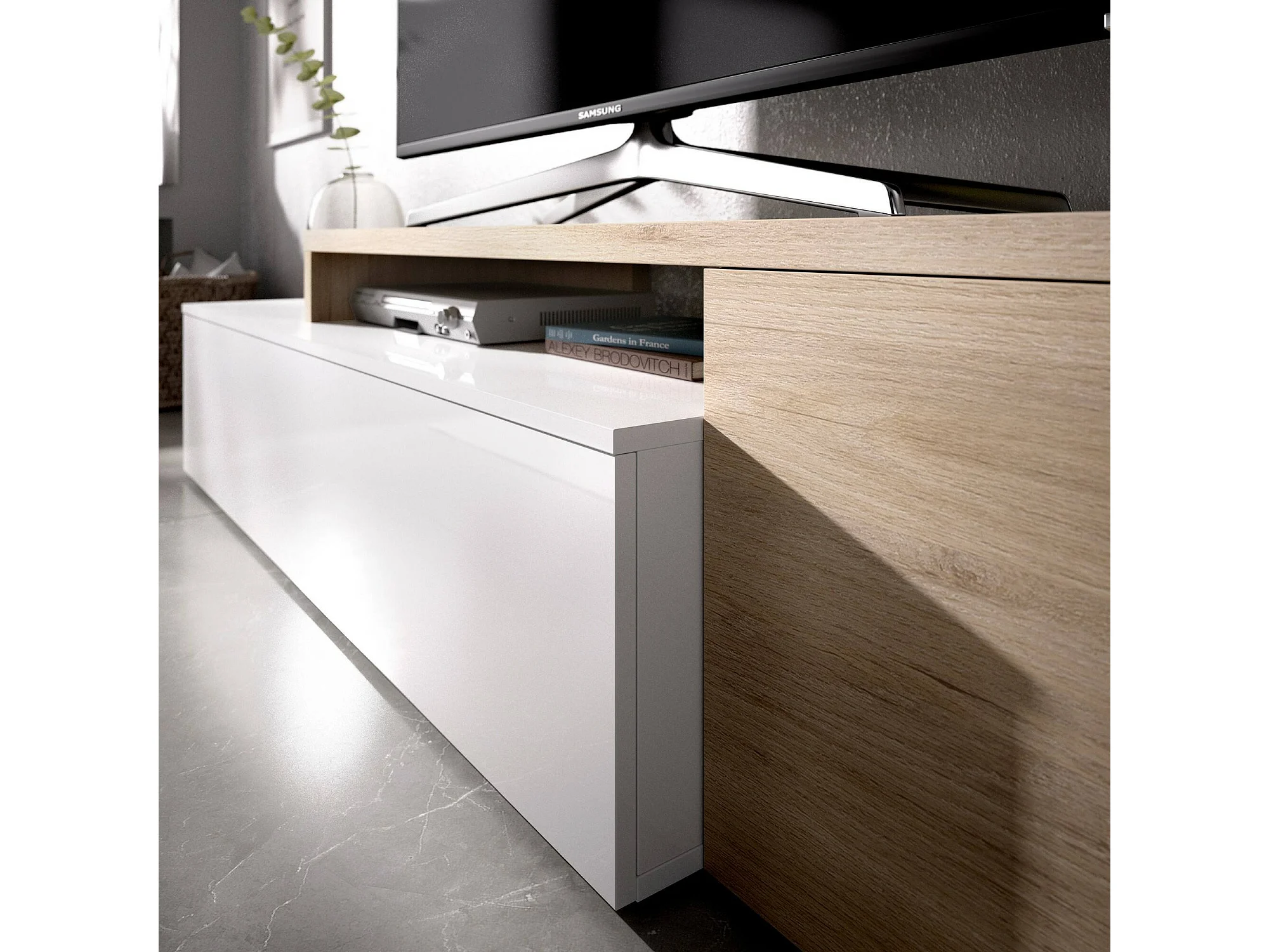 Sistema de parede Baker, conjunto modular de sala de canto, móvel de sala de TV multiposições, 201x41h180 cm, branco e carvalho