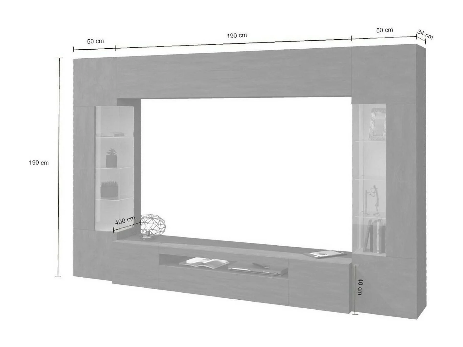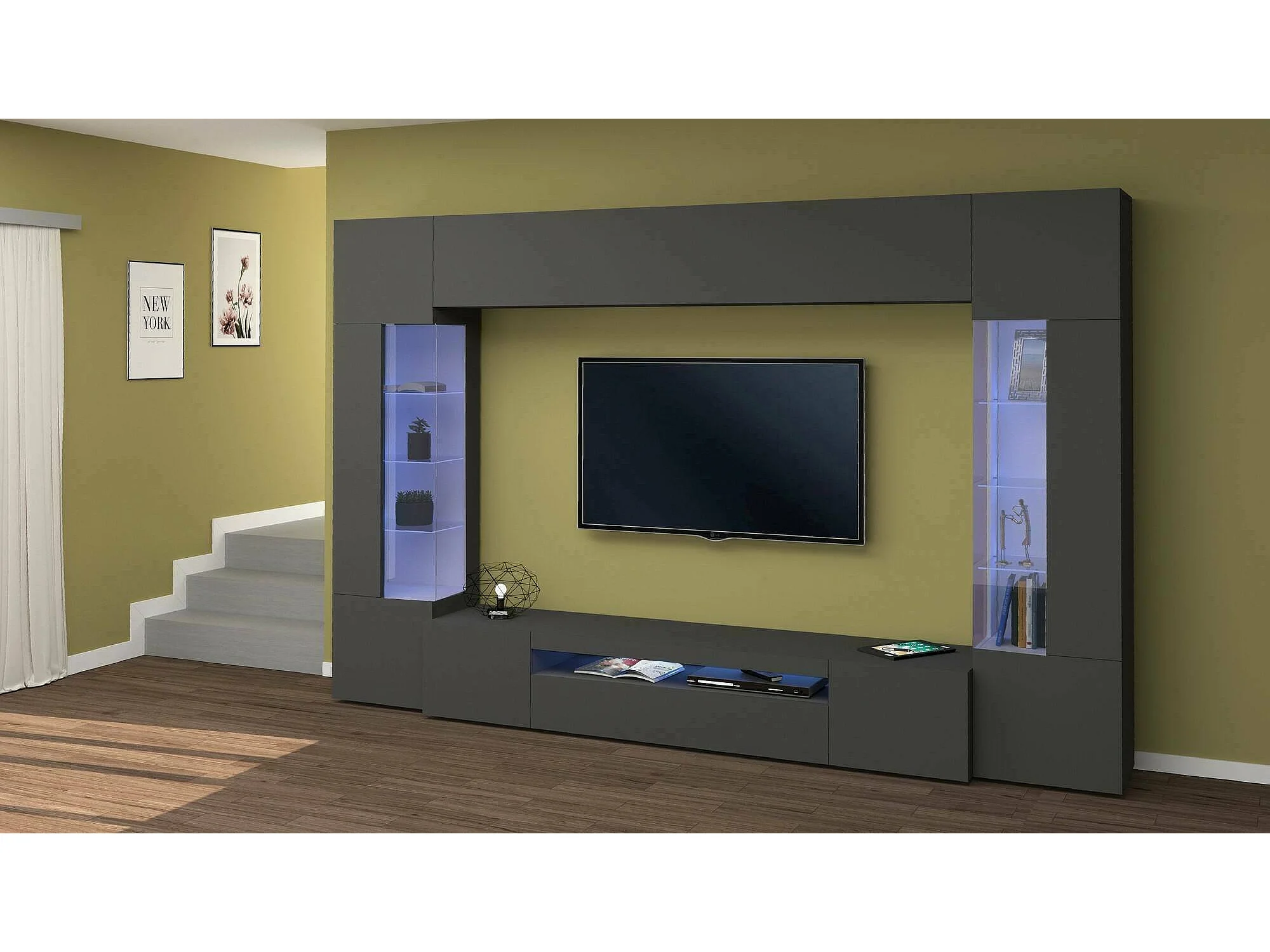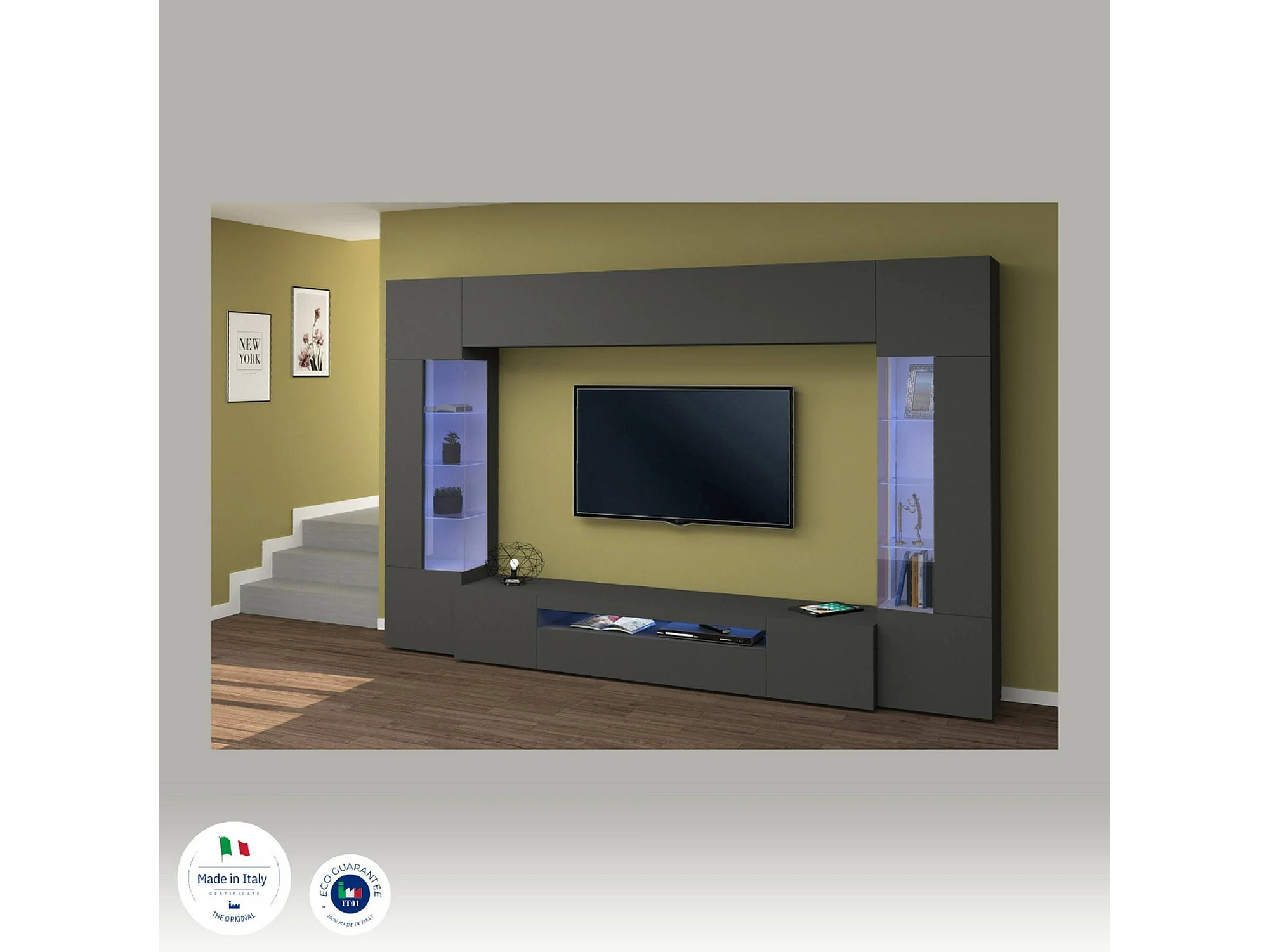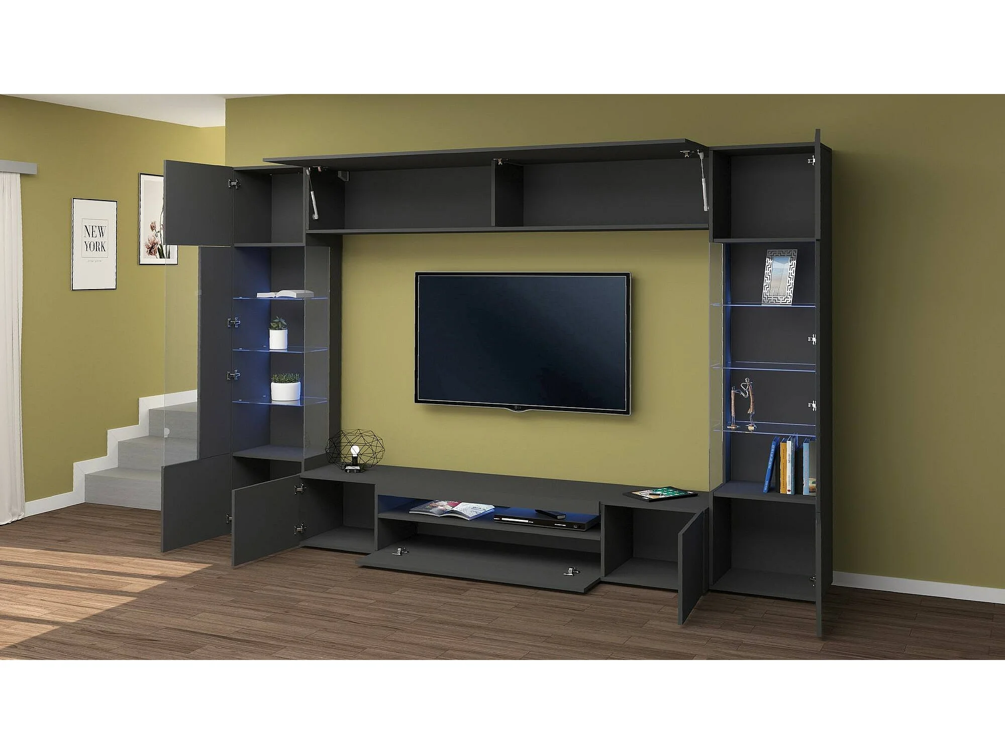 Sistema de parede Dberard, conjunto de sala de TV com 6 portas, móveis de sala multiuso com luz LED, 100% Fabricado na Itália, 290x40h191 cm, Antracite