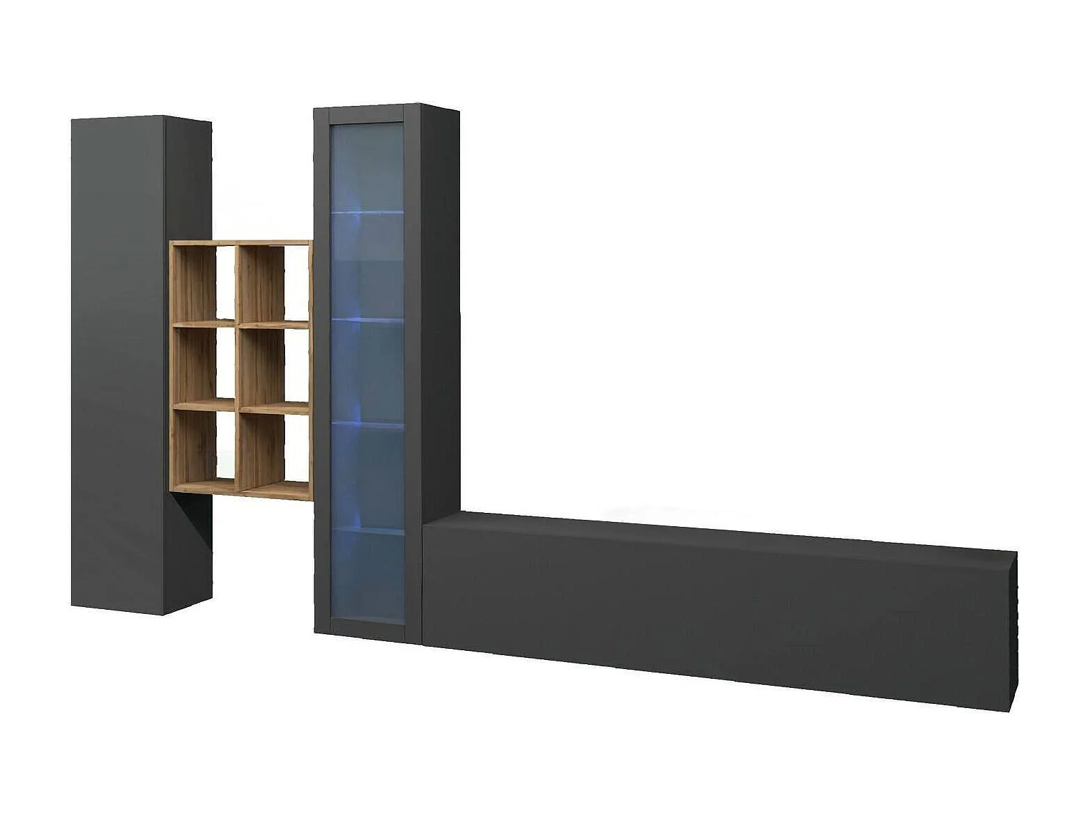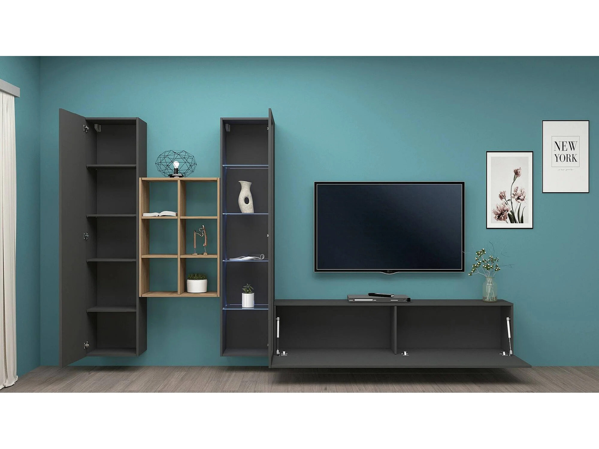 Sistema de parede Dcragn, conjunto de sala de TV com 3 portas, móveis de sala multiuso com vitrine e luz LED, 100% Fabricado na Itália, 320x30h180 cm, Antracite