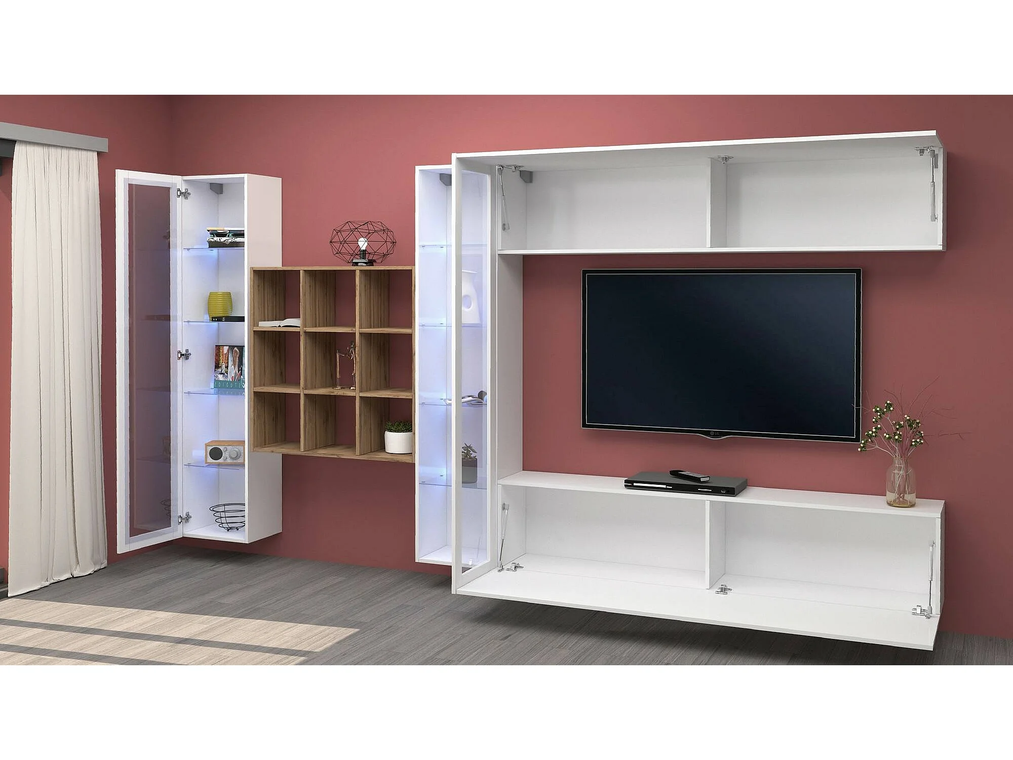 Sitema de parede Dfancon, conjunto de ala de TV com 4 porta, móvei de ala multiuo com vitrine e luz LED, 100% Fabricado na Itália, 350x30h180 cm, Branco brilhante