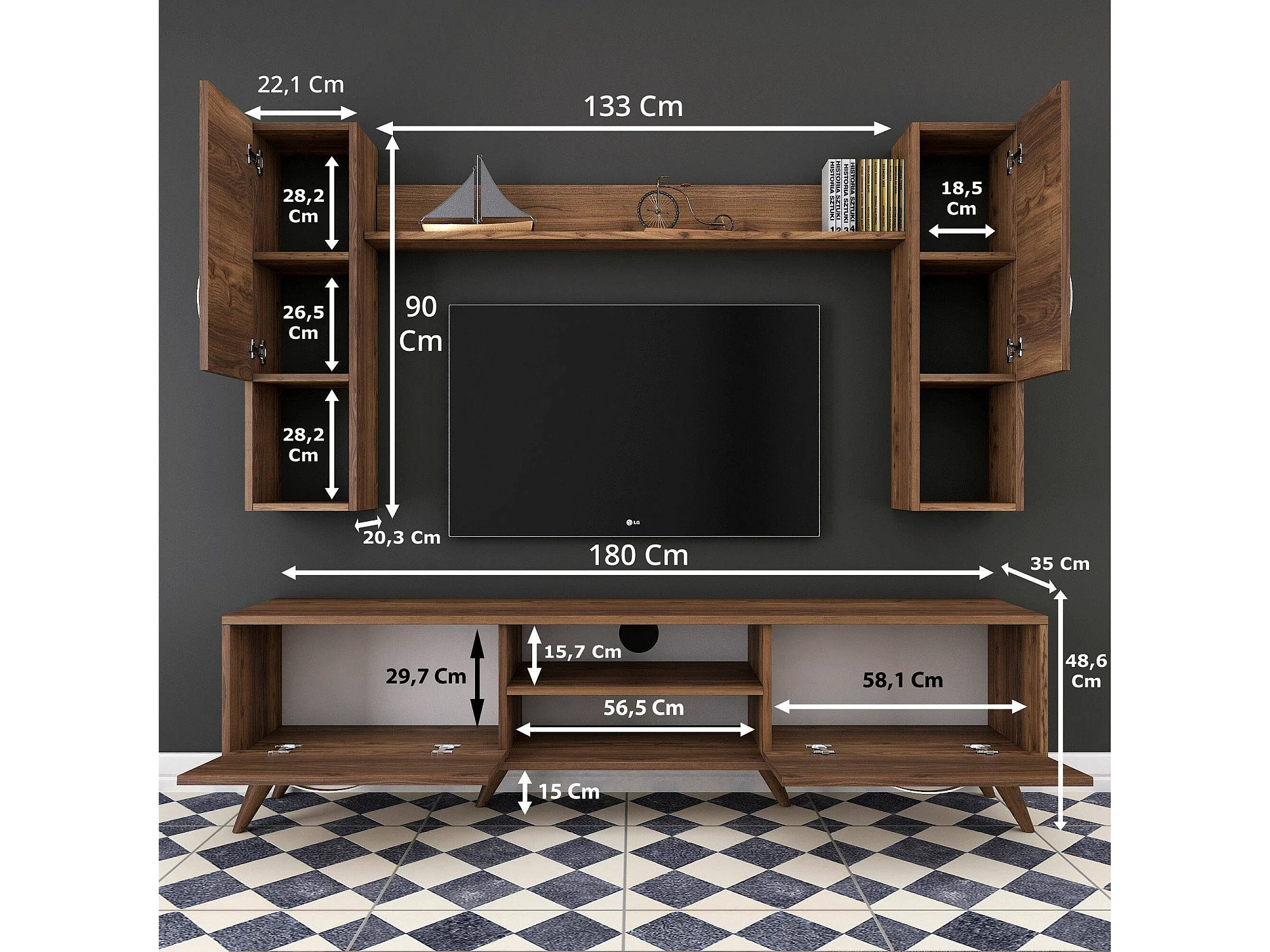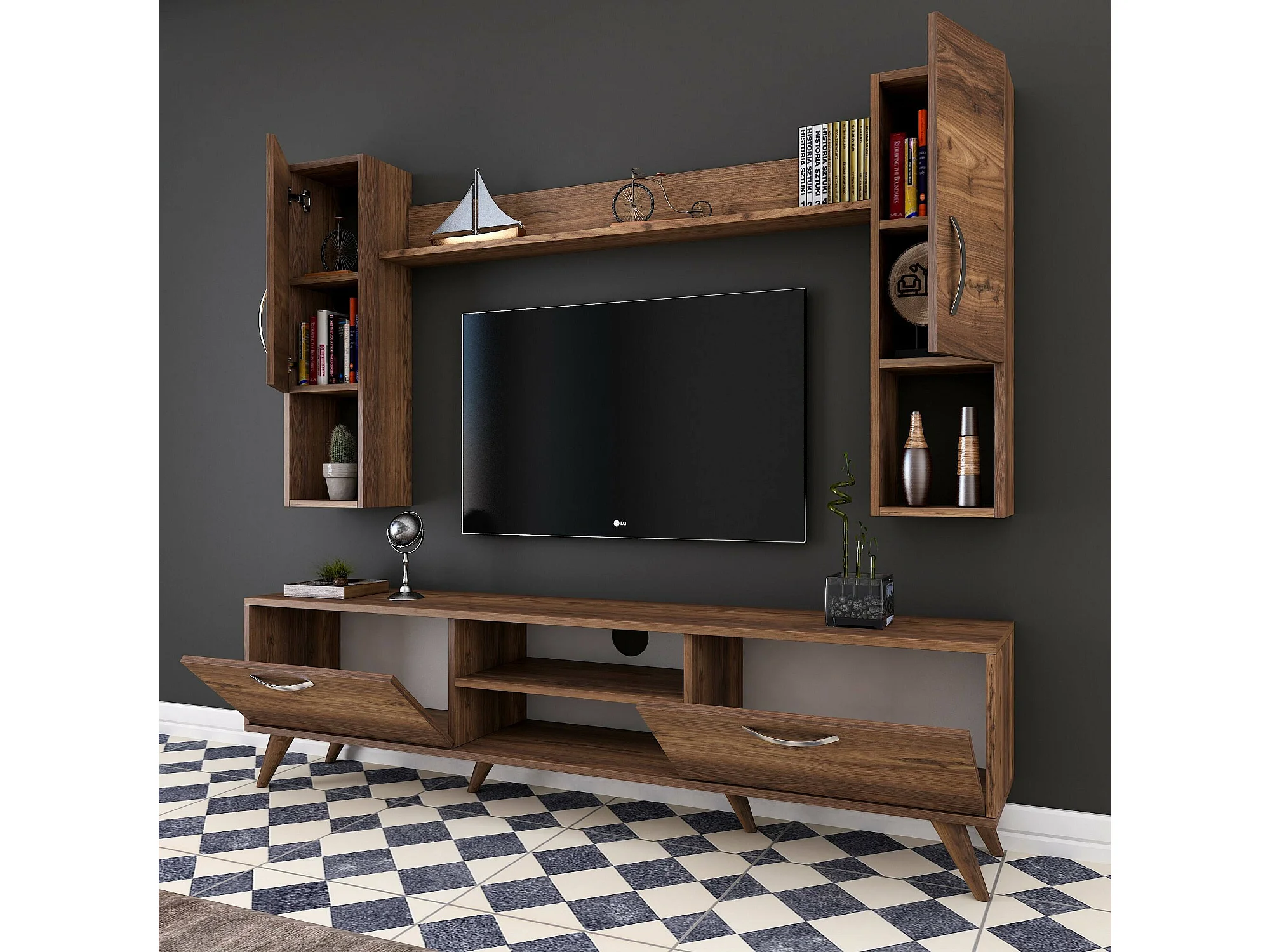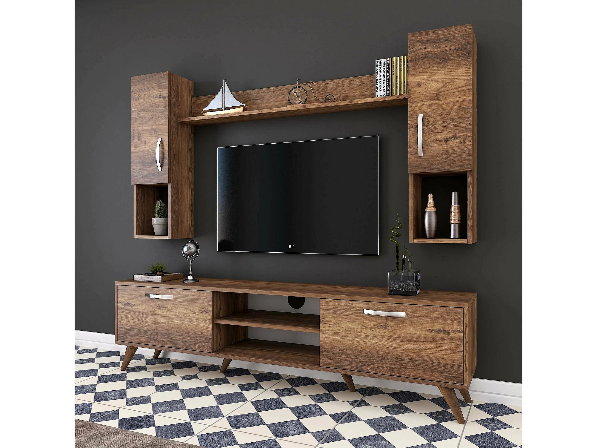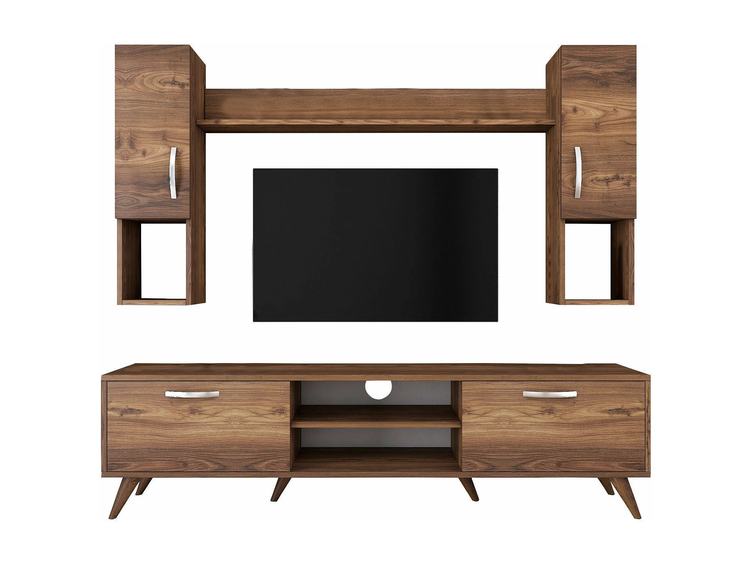 Sistema de parede Dmaranzan, Composição da sala, Mobiliário multiusos para sala, Móvel de TV, 180x35 h49 cm, Nogueira