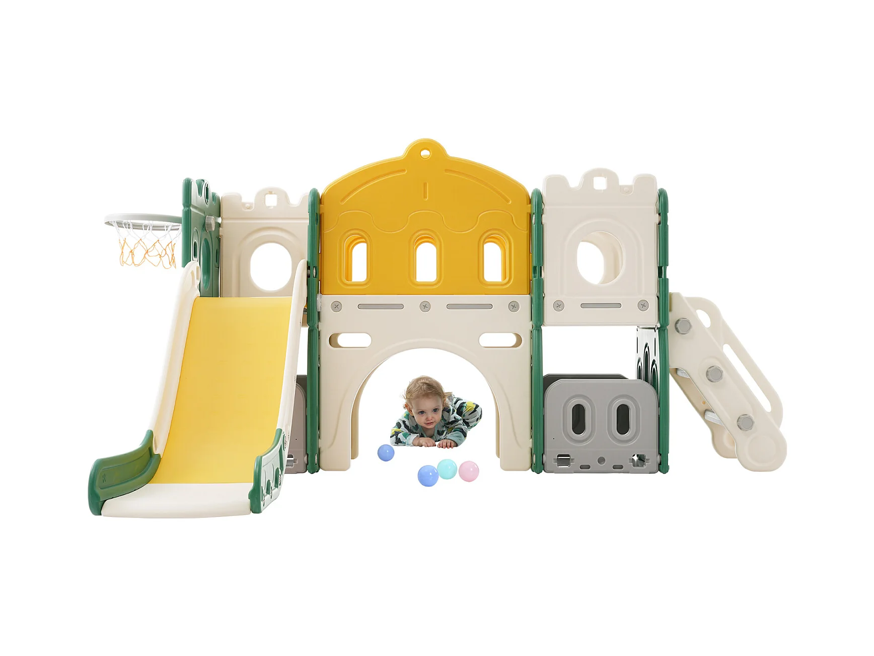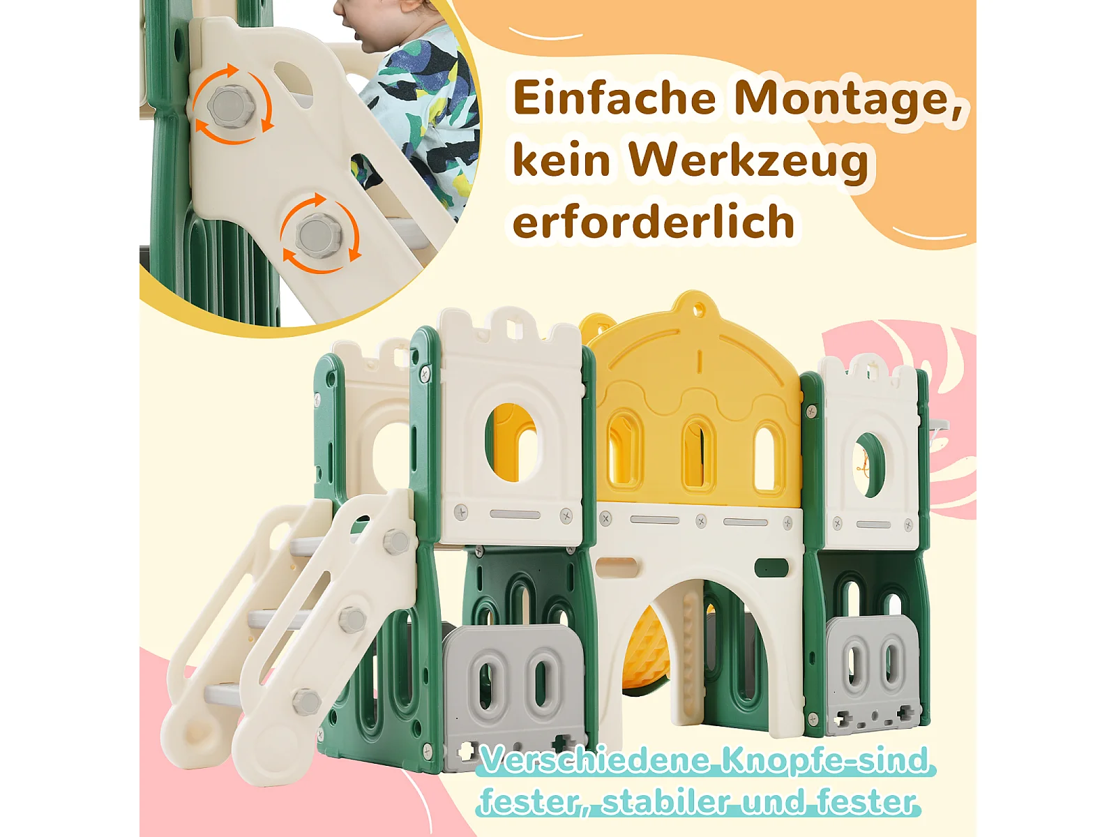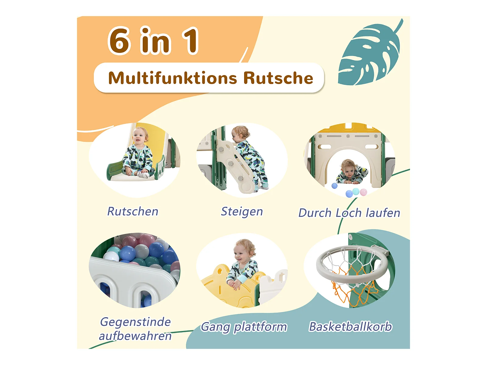 6 em 1 Kids Slide - Com cesto de basquetebol, escorrega, torre de escalada, HDPE (bolas do mar não excluídas) - Verde