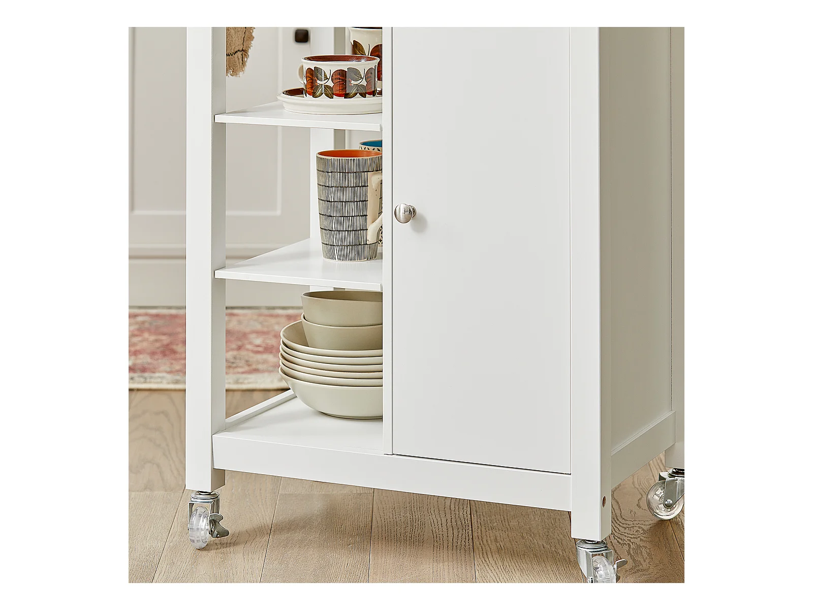 Carrinho Dmatte, Armário auxiliar de cozinha com rodas, Armário multiuso com 2 portas e 1 prateleira, 59x40h92 cm, Branco