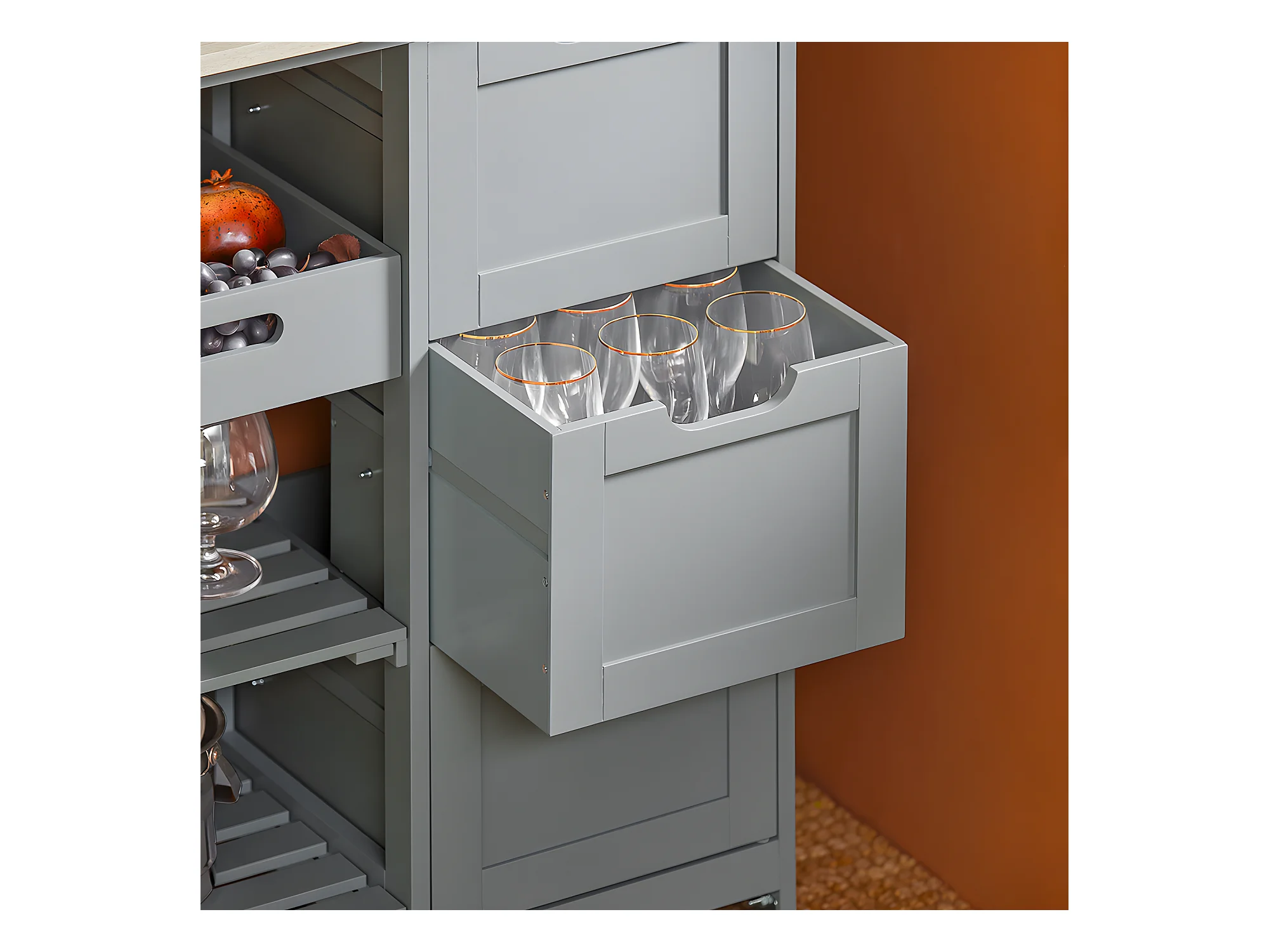 Ilha central de cozinha com 3 gavetas e portas de armazenamento - Tampo extensível - Pés em rodas ou em madeira - Cinza