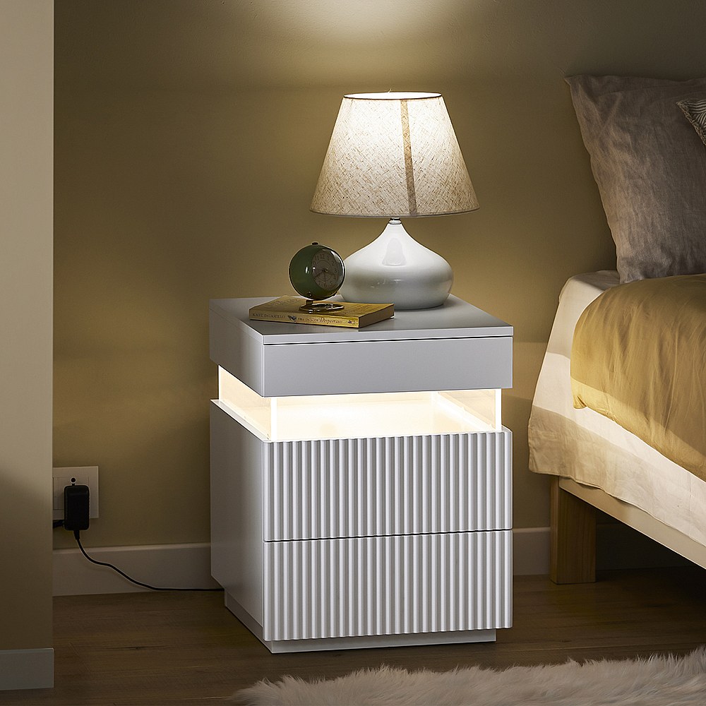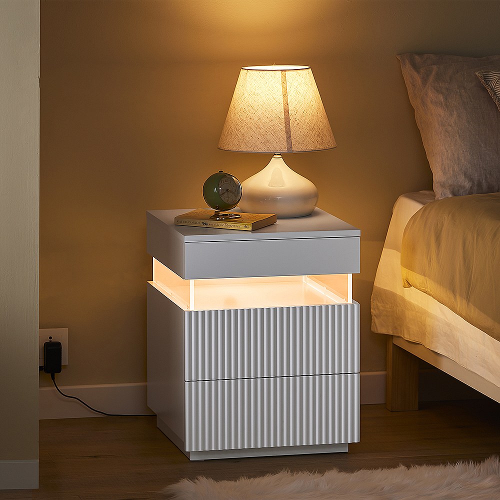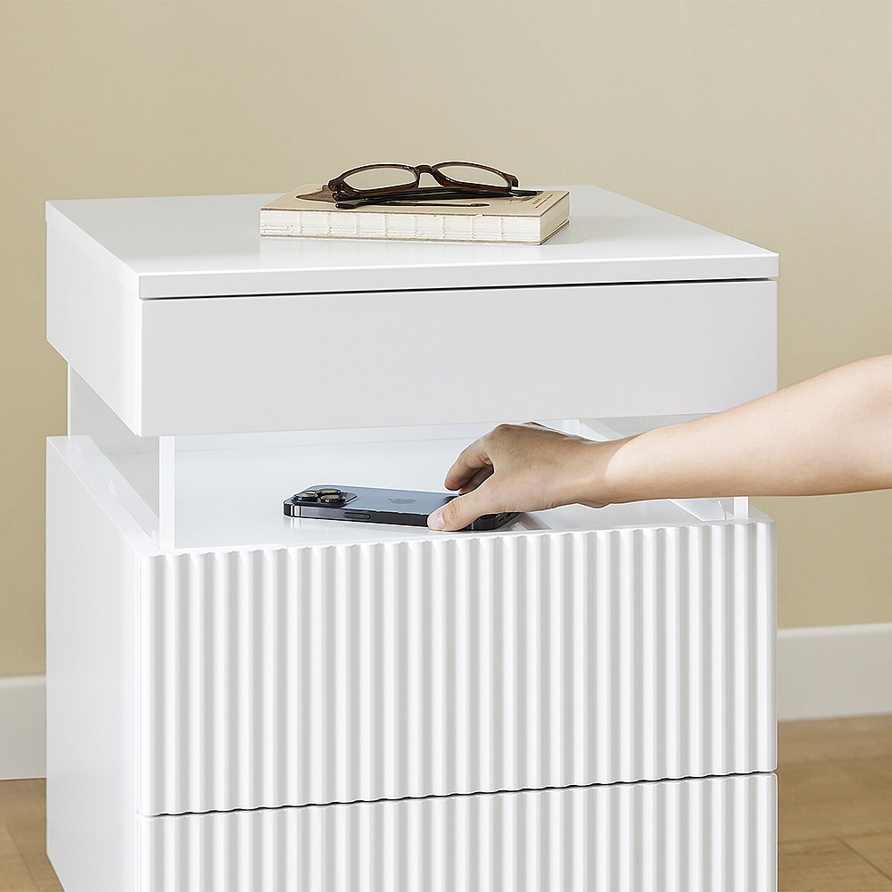 SoBuy Mesa de Cabeceira Moderna 3 Gavetas, Painéis de Acrílico LED, 3 Cores, Branco