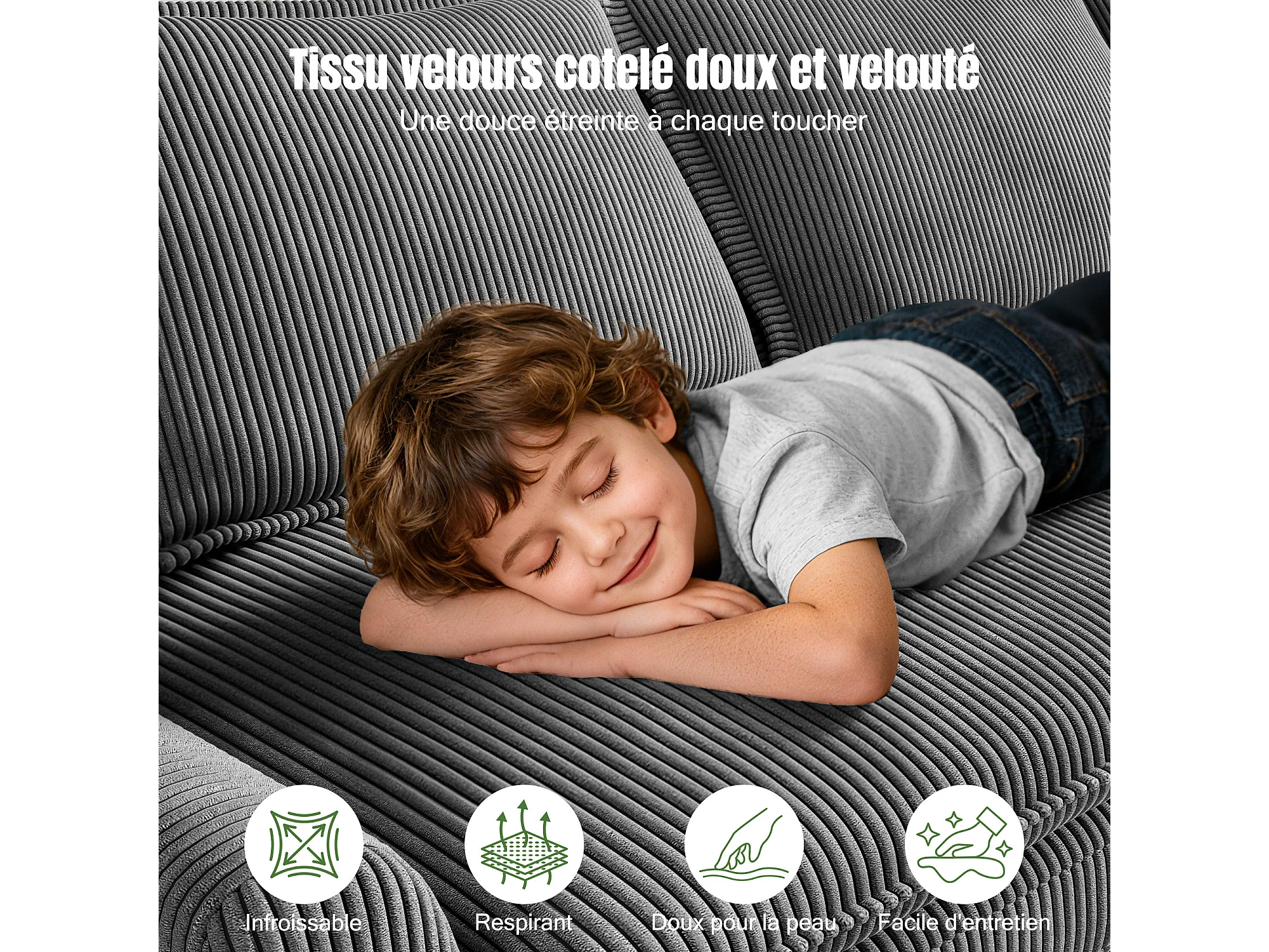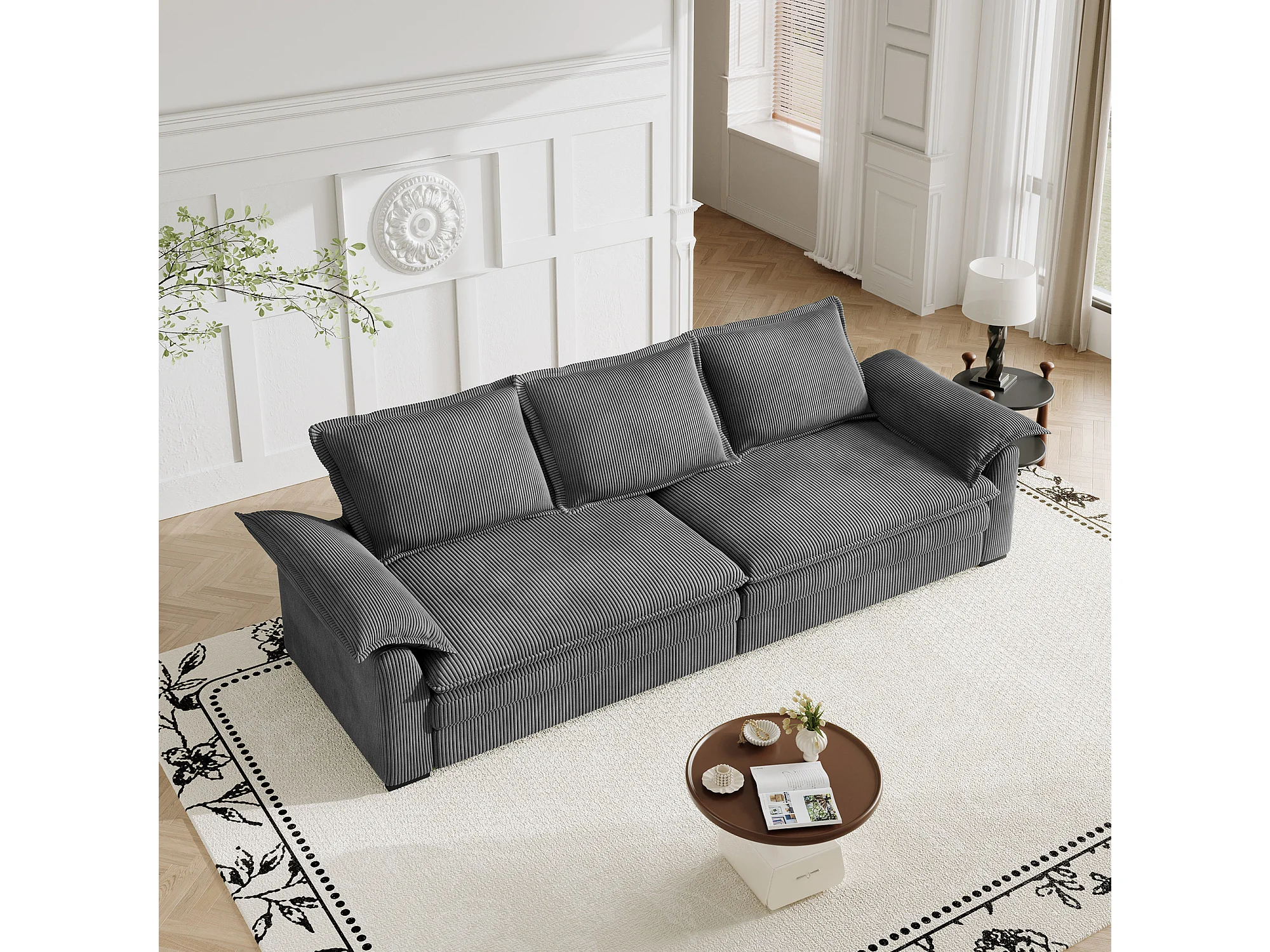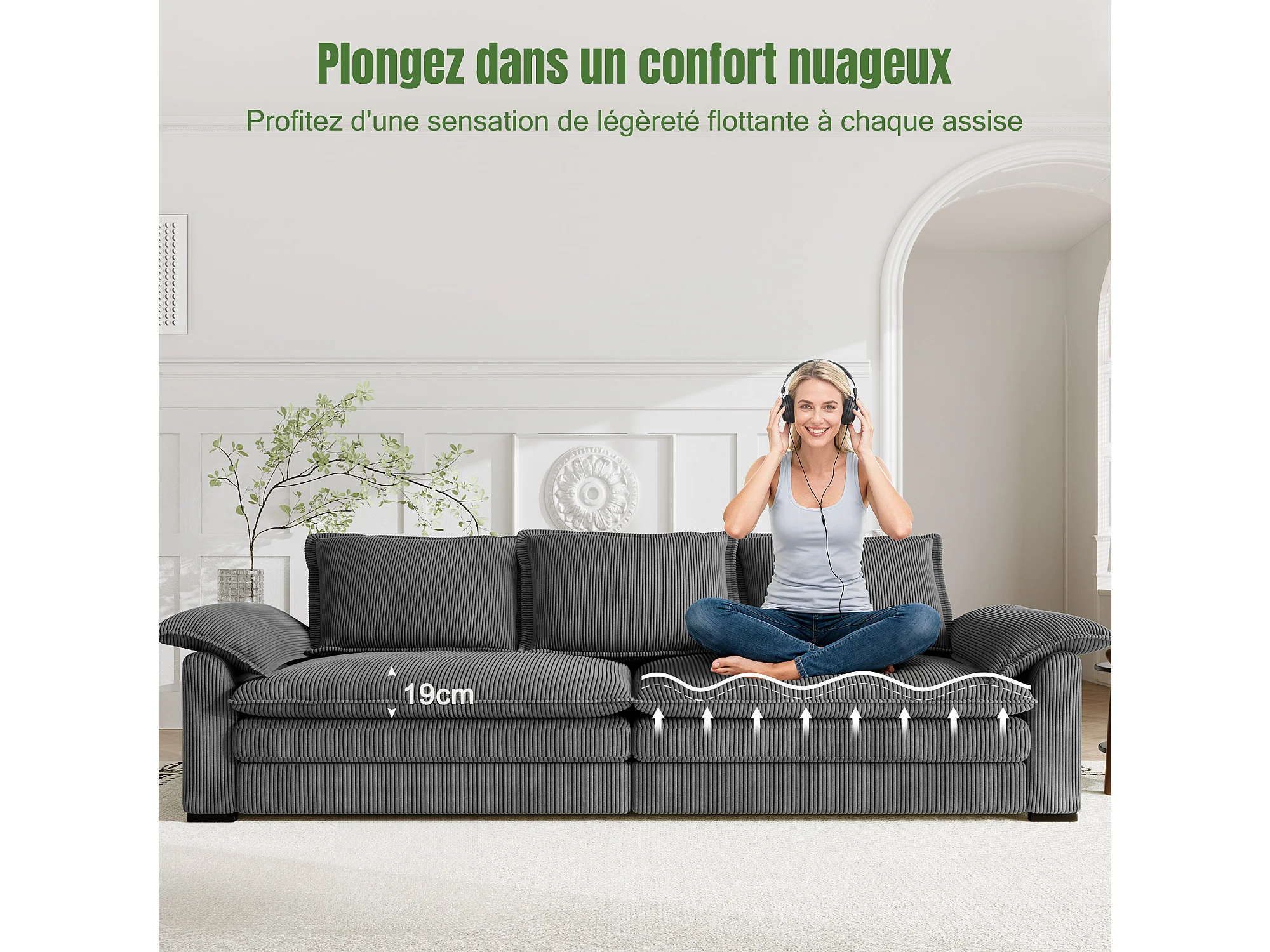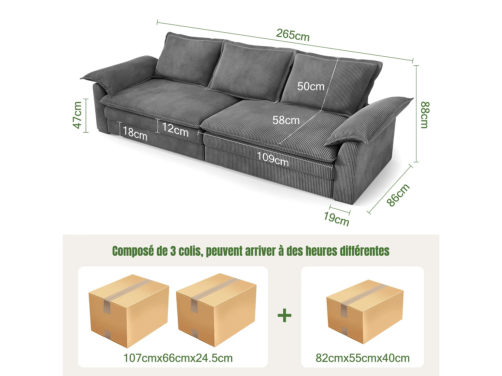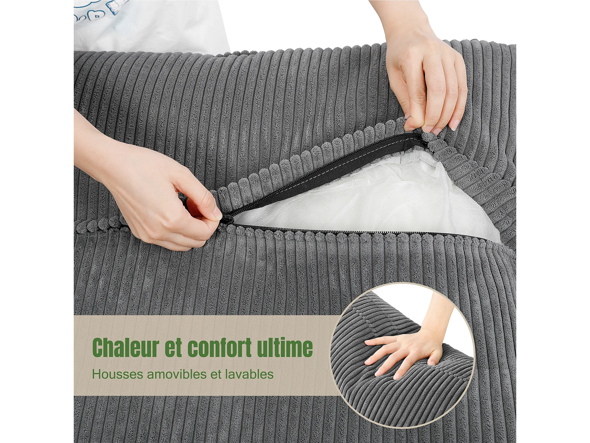 Sofá 3 lugares em veludo cotelê, com 2 almofadas de braço, removíveis e laváveis, 265x86x88cm, Bege