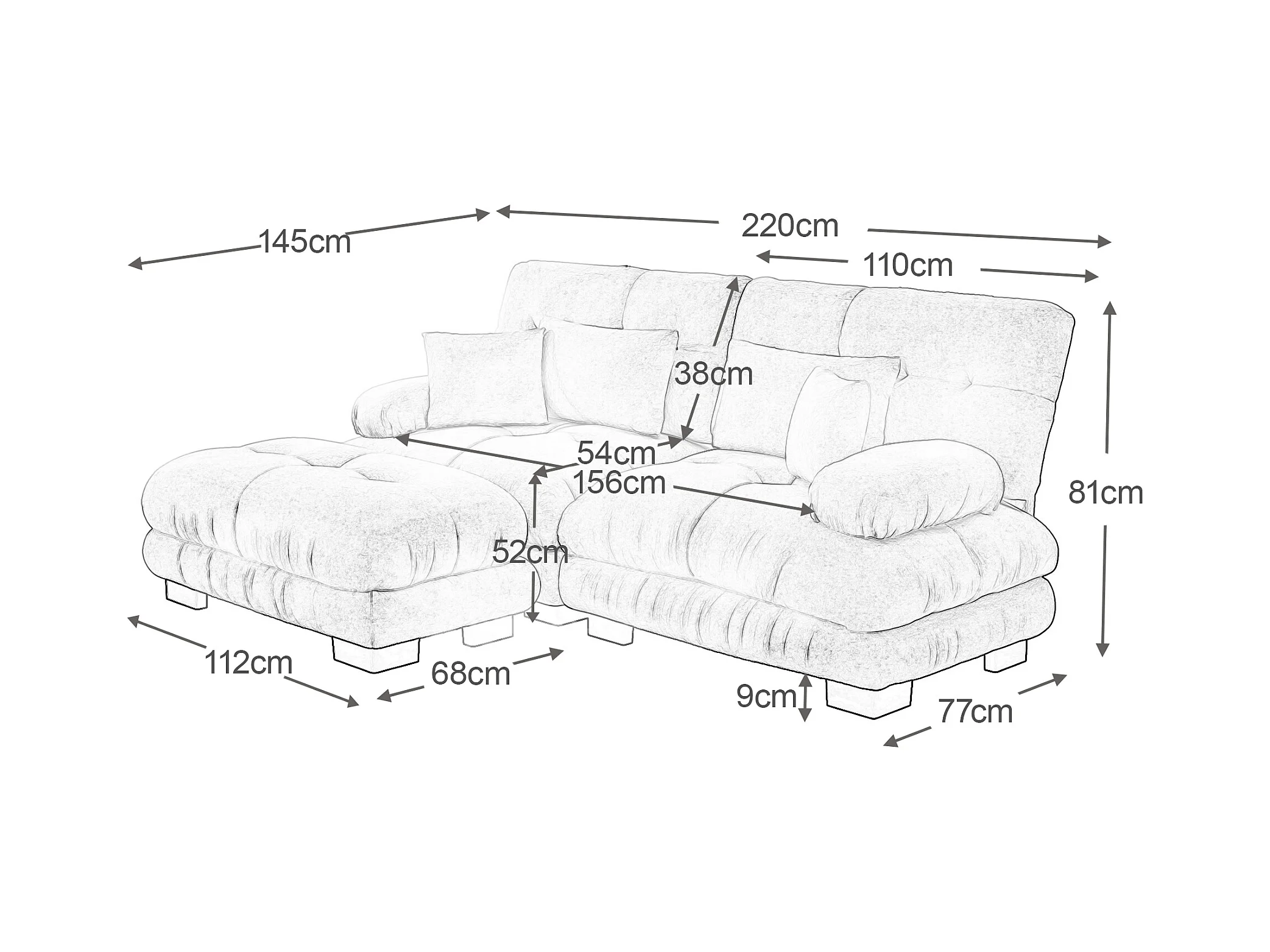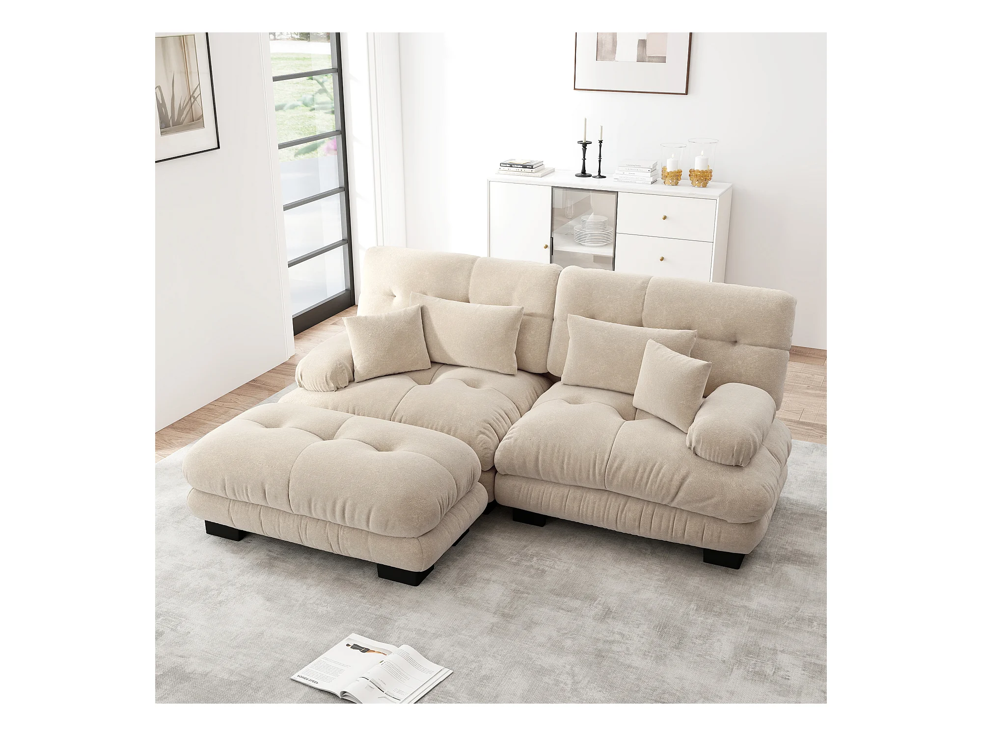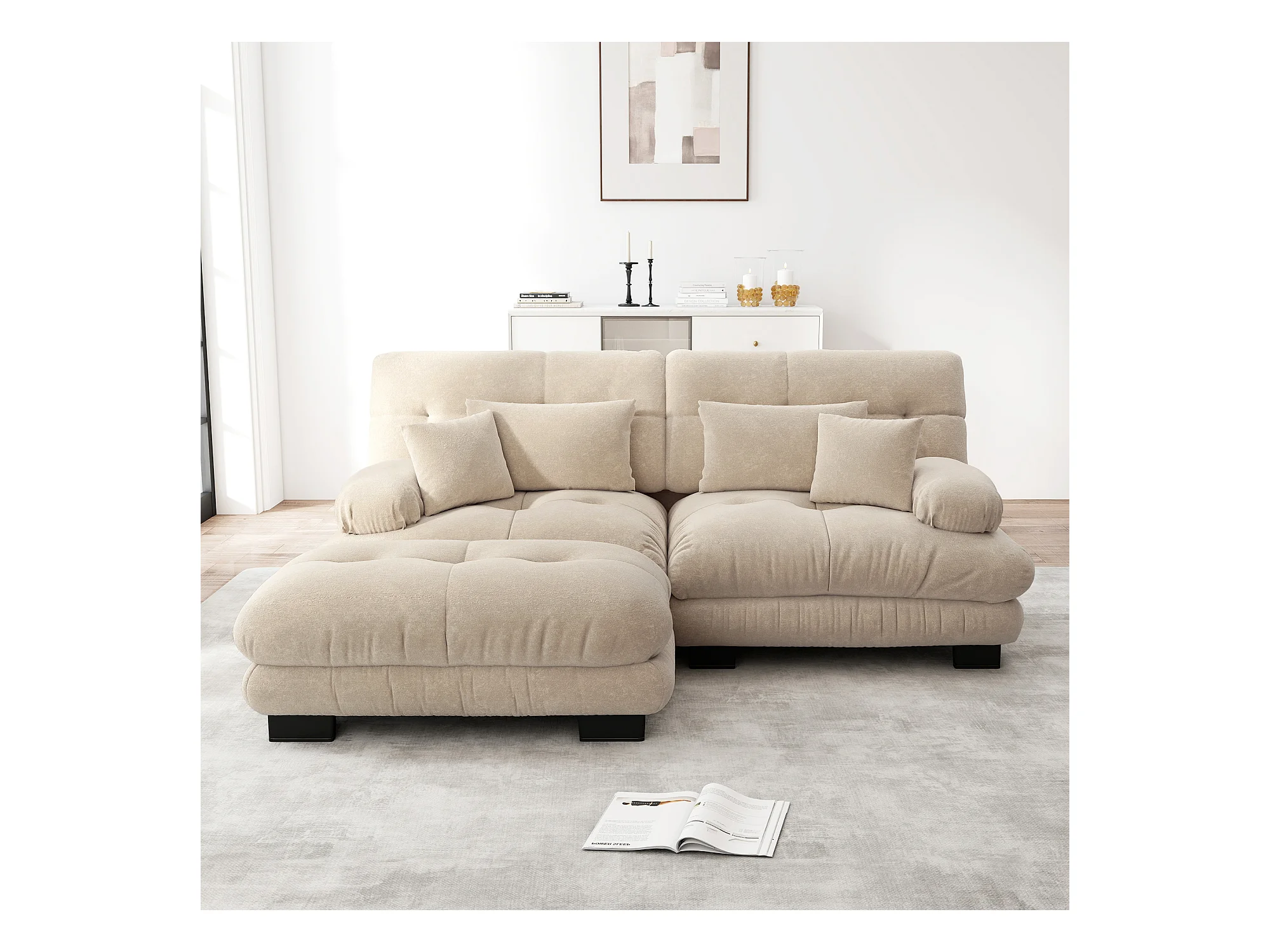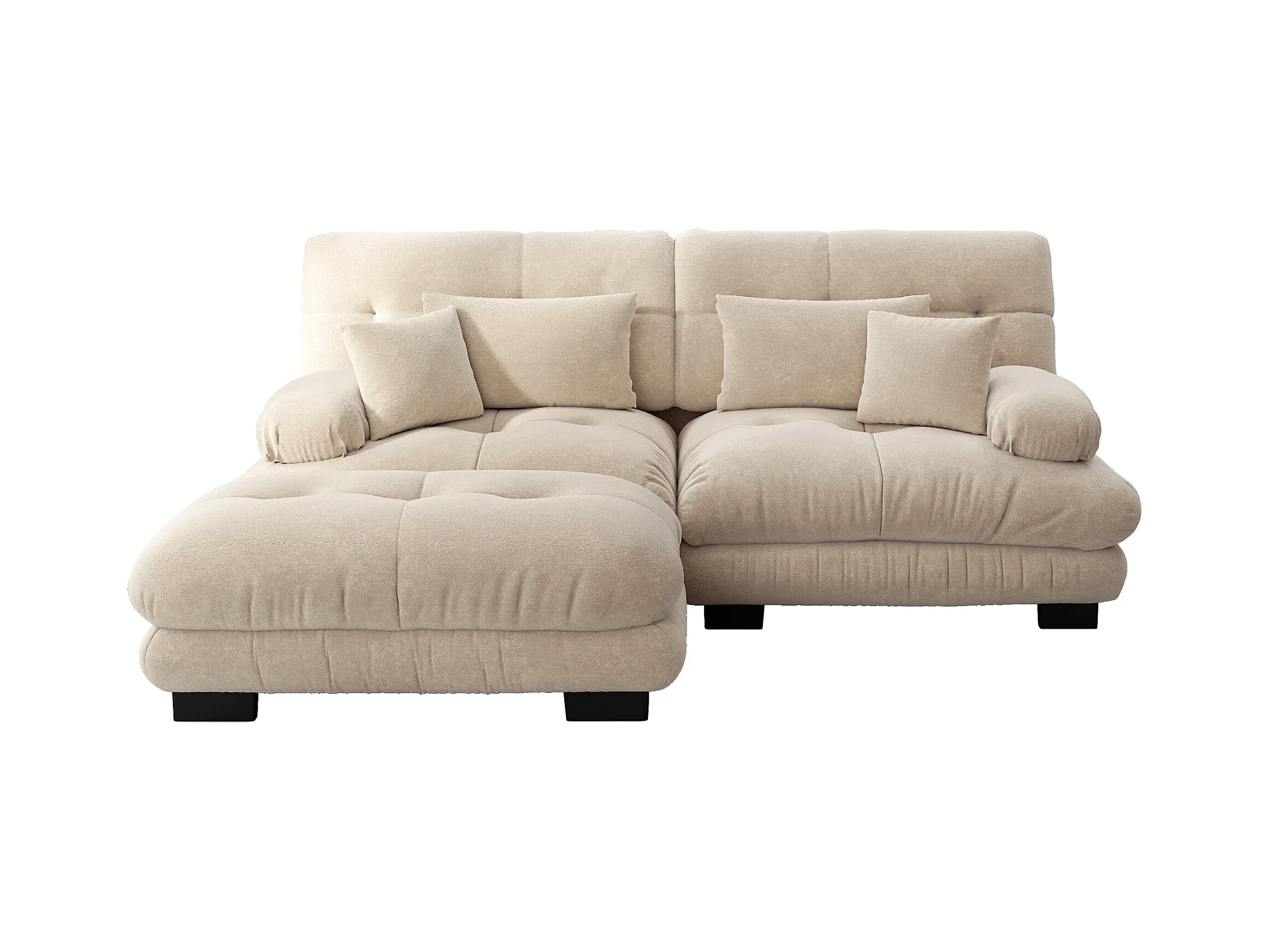 Sofá bege de 2 lugares - Sofá de canto com 2 almofadas lombares e 2 almofadas decorativas - apoios de braços e apoio para os pés - chenille