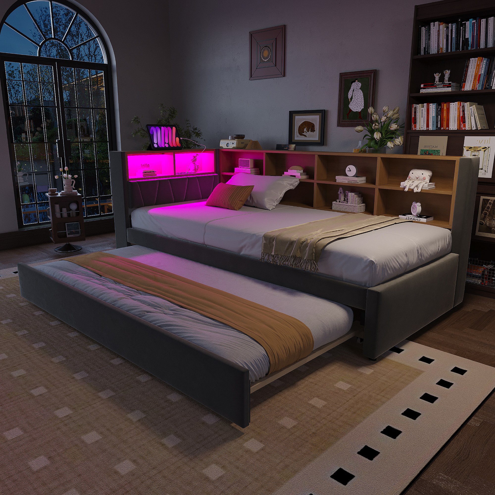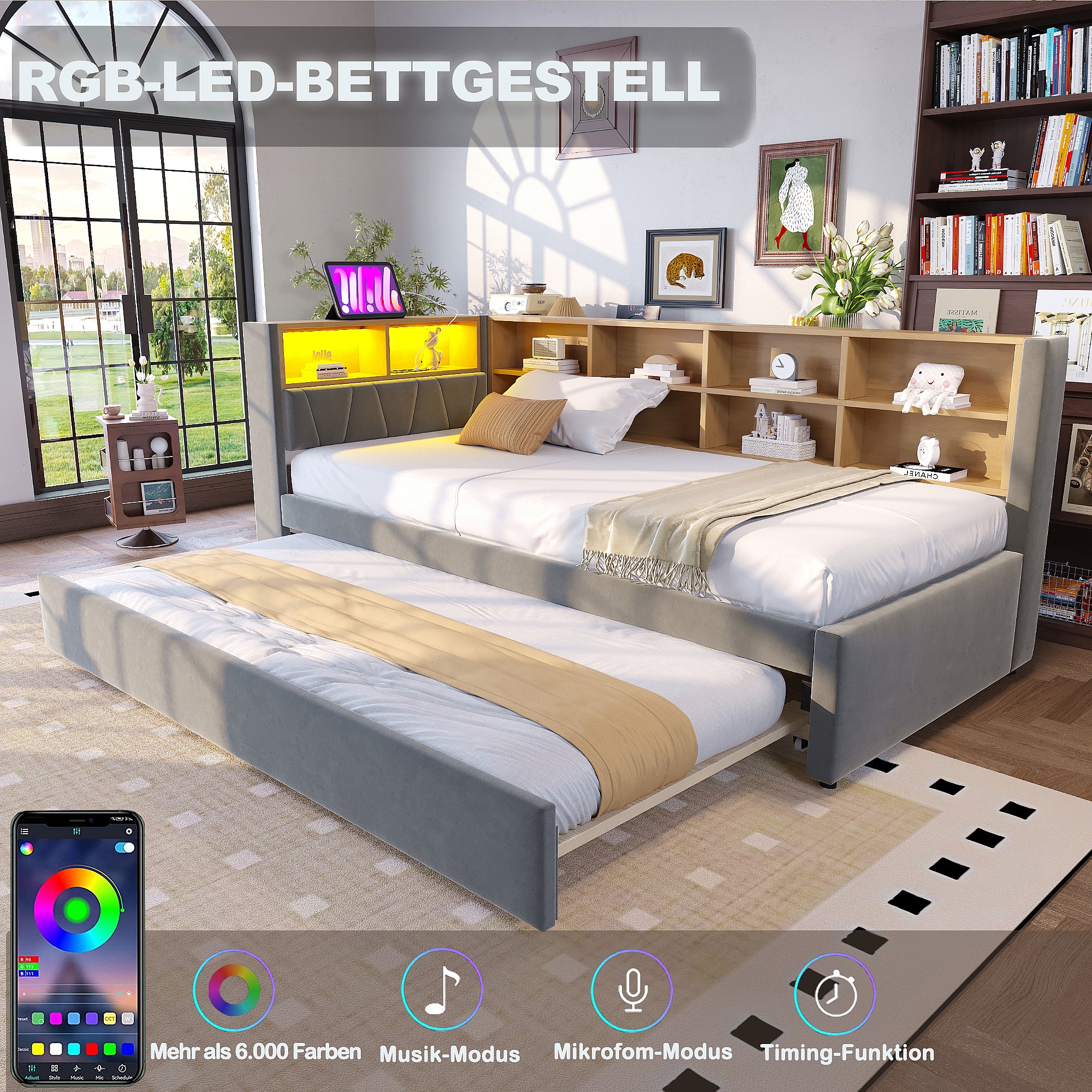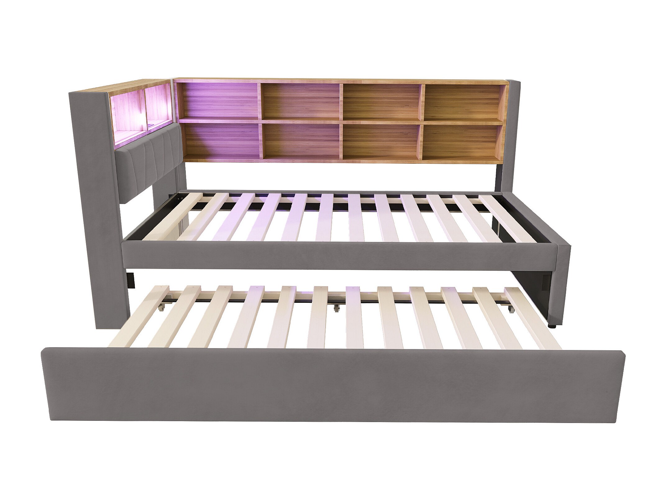 Sofá-cama 90 x 200 cm com cama de rodízio 90 x 190 cm - com LEDs + tomadas + prateleira de armazenamento - Flanela - cinza