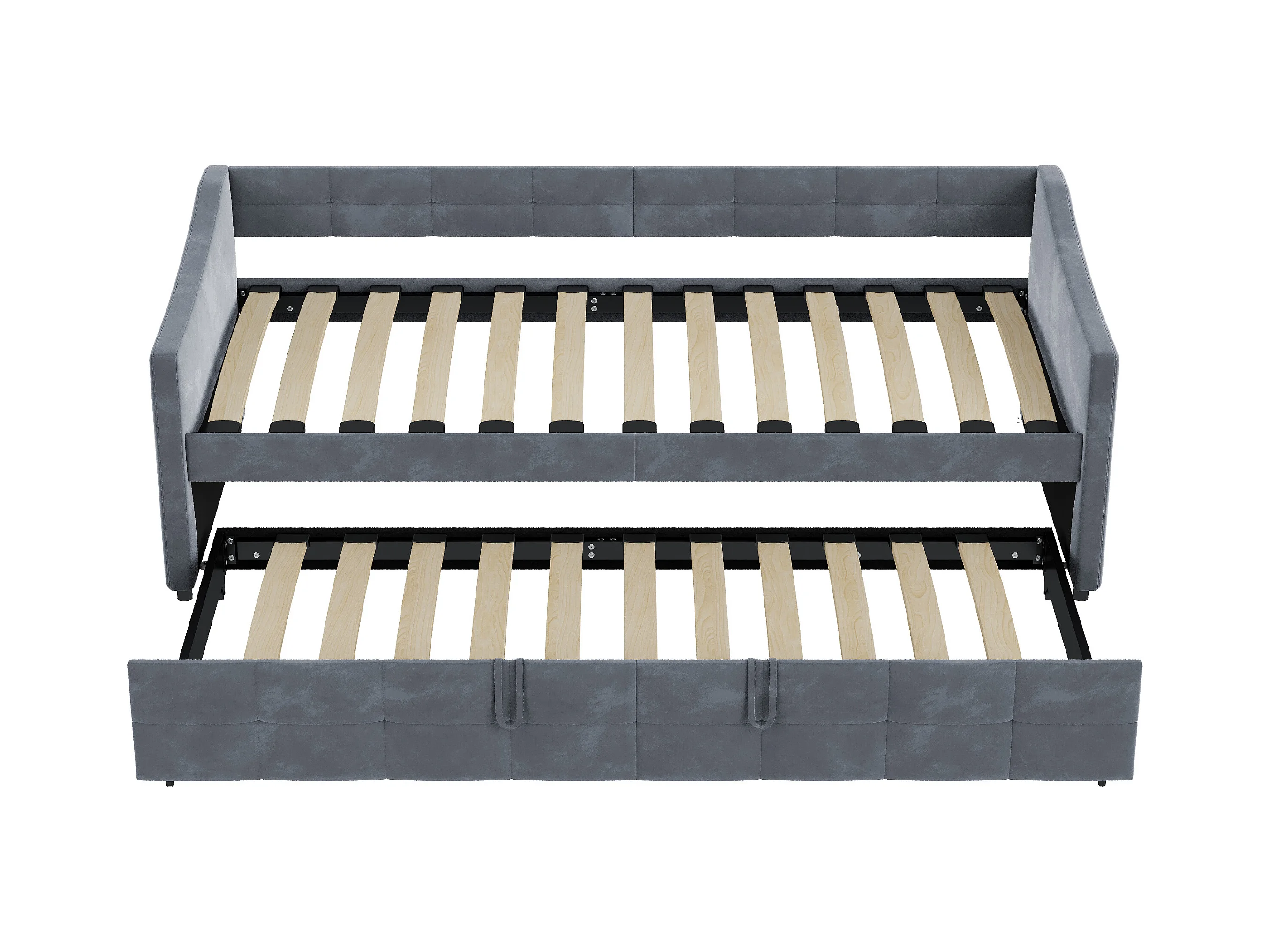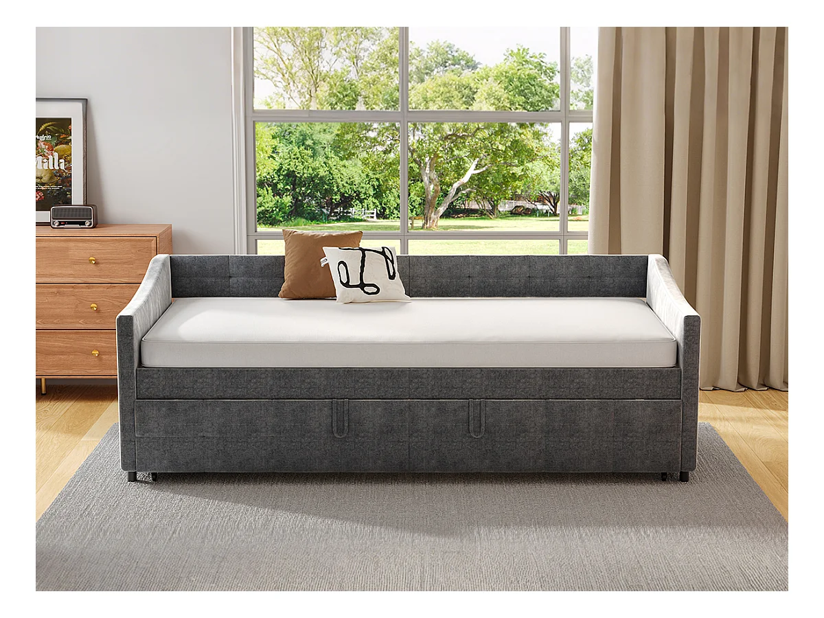 Sofá-cama 90x200 cm em veludo cinza, extensível 180x200 cm com cilindros hidráulicos, bolsos laterais e design moderno