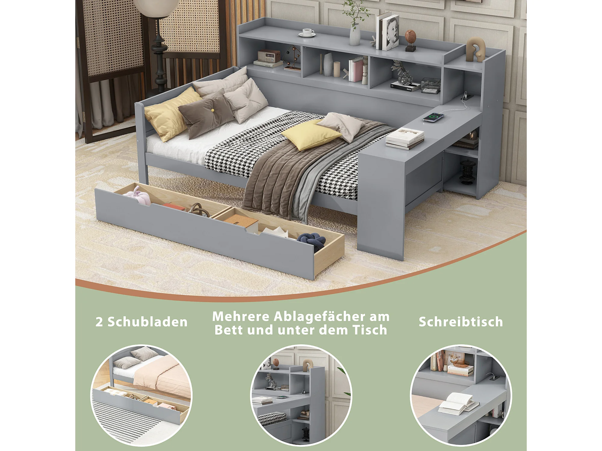 Sofá-cama 90x200 cm MDF com secretária, 2 gavetas e portas USB cinza