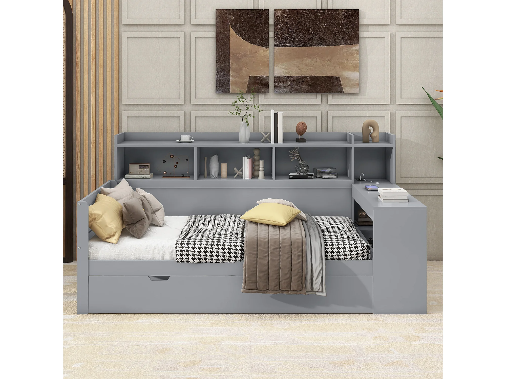 Cama infantil 90x200 cm - Cabeceira com armazenamento - Ripa de madeira - com tomada e porta USB - cinza
