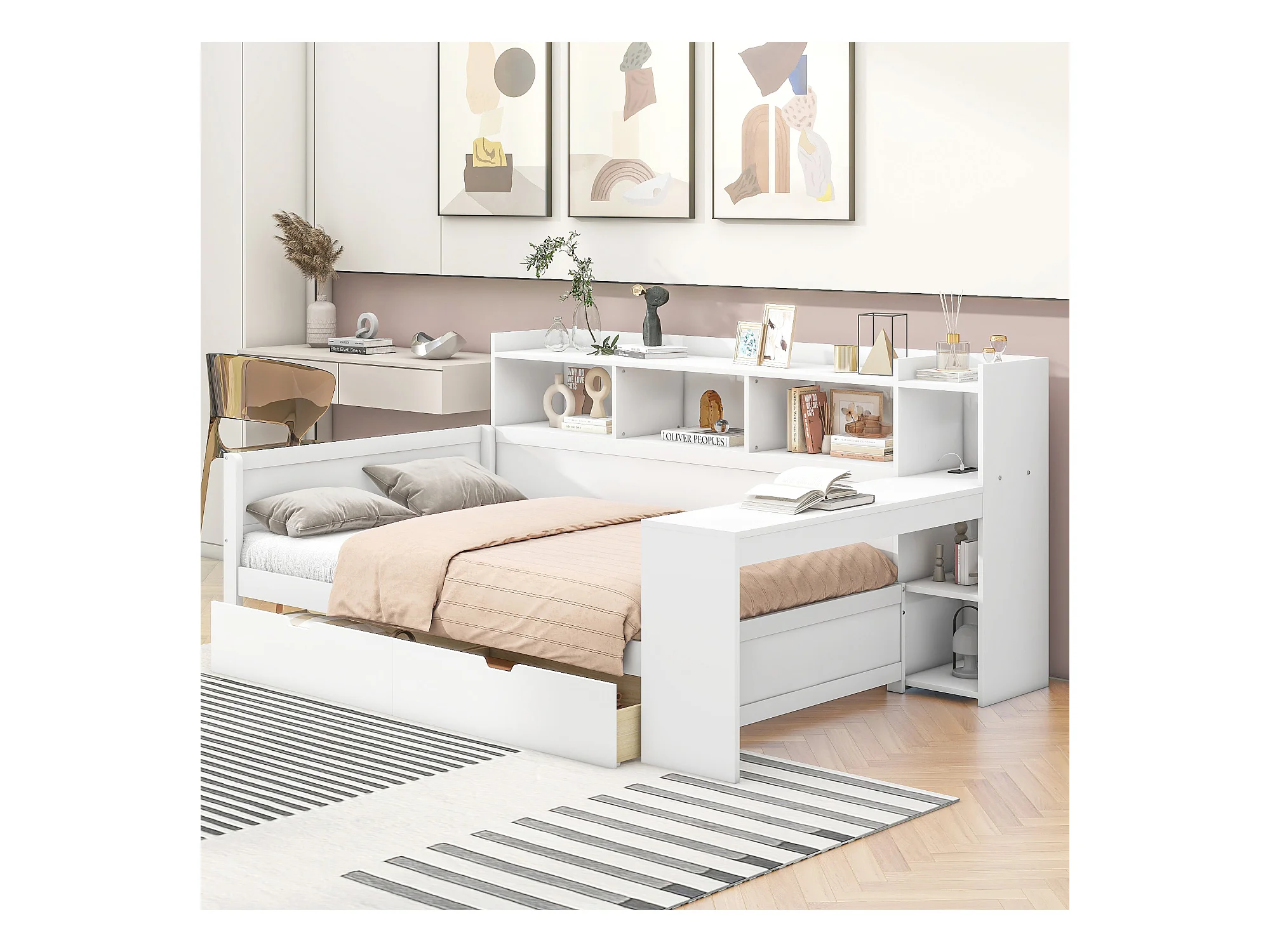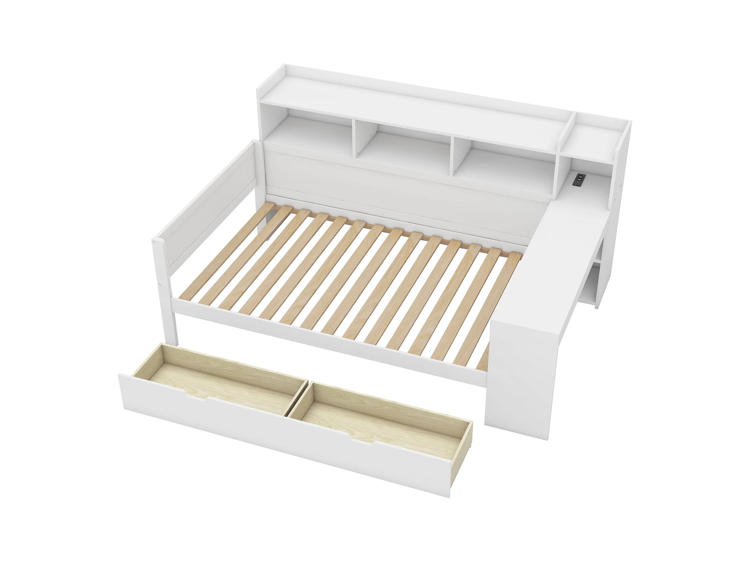 Sofá-cama 90x200 cm MDF com secretária integrada, 2 gavetas e portas USB branco