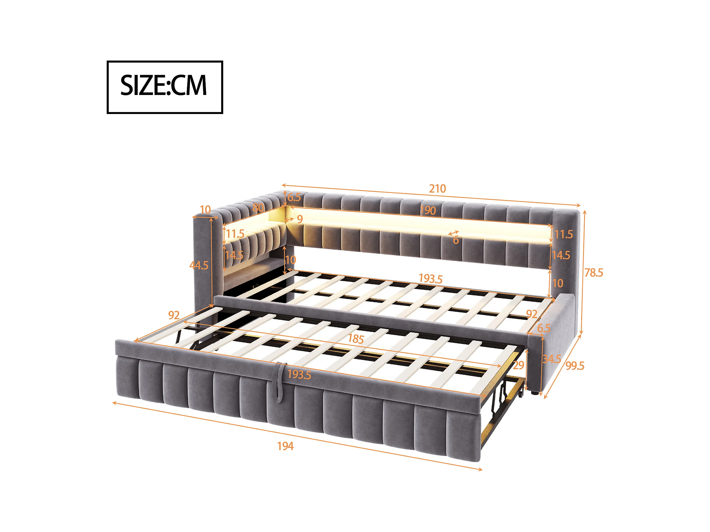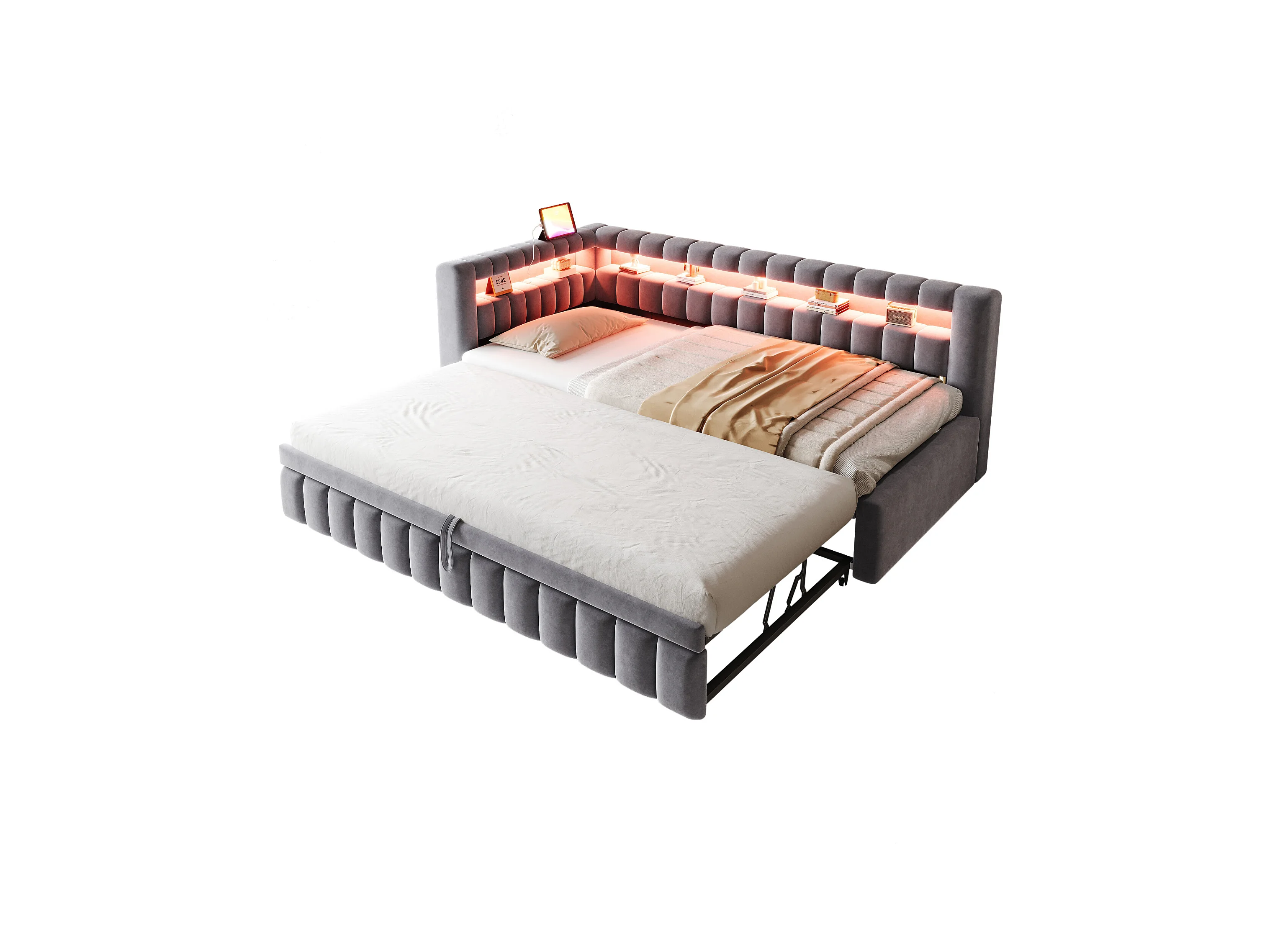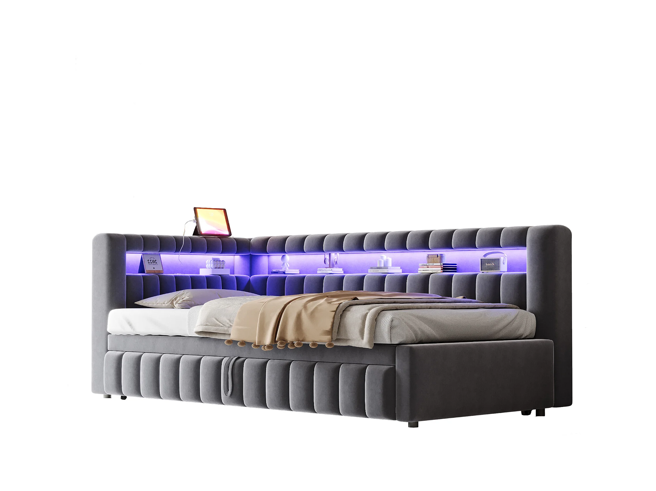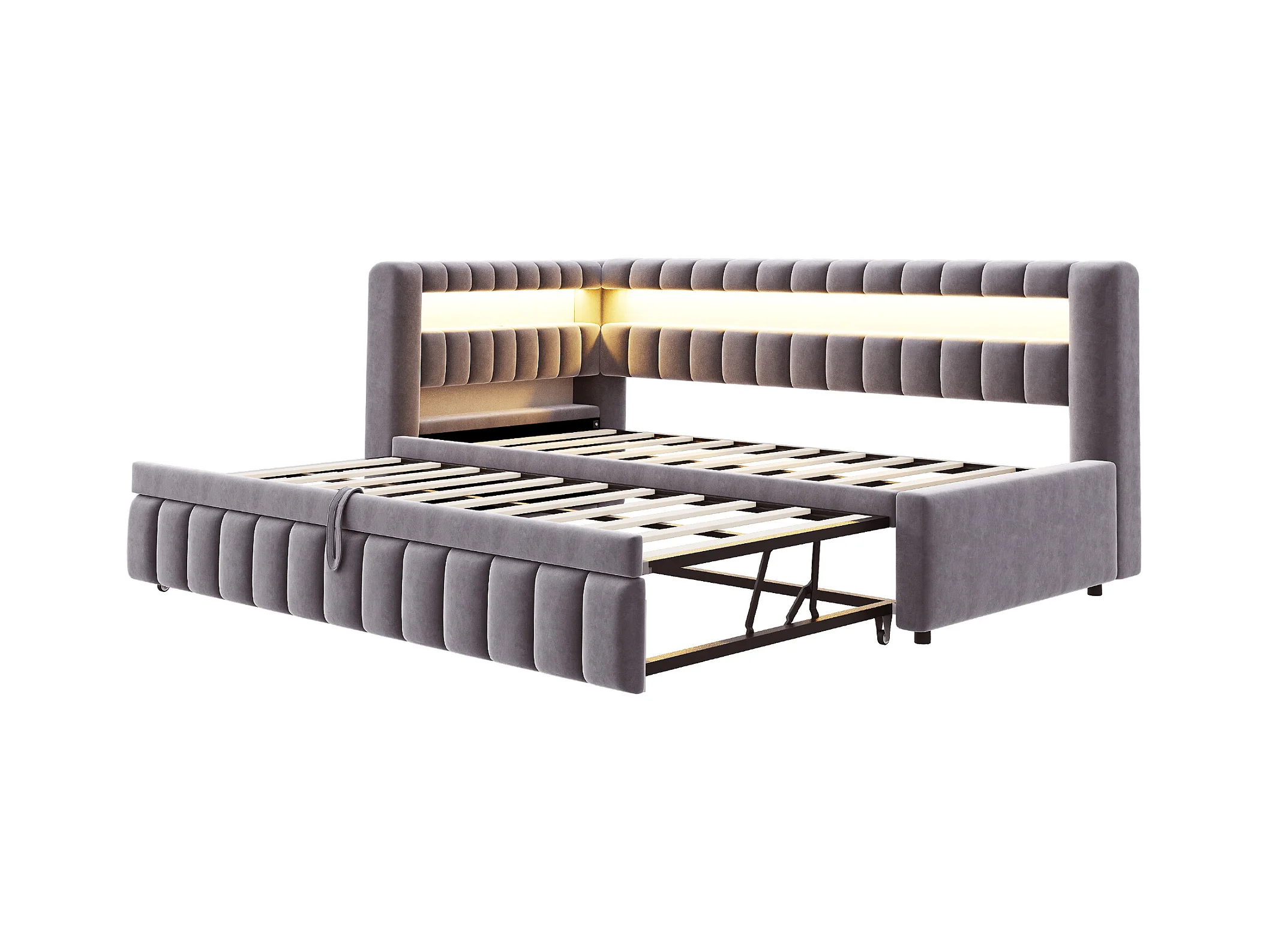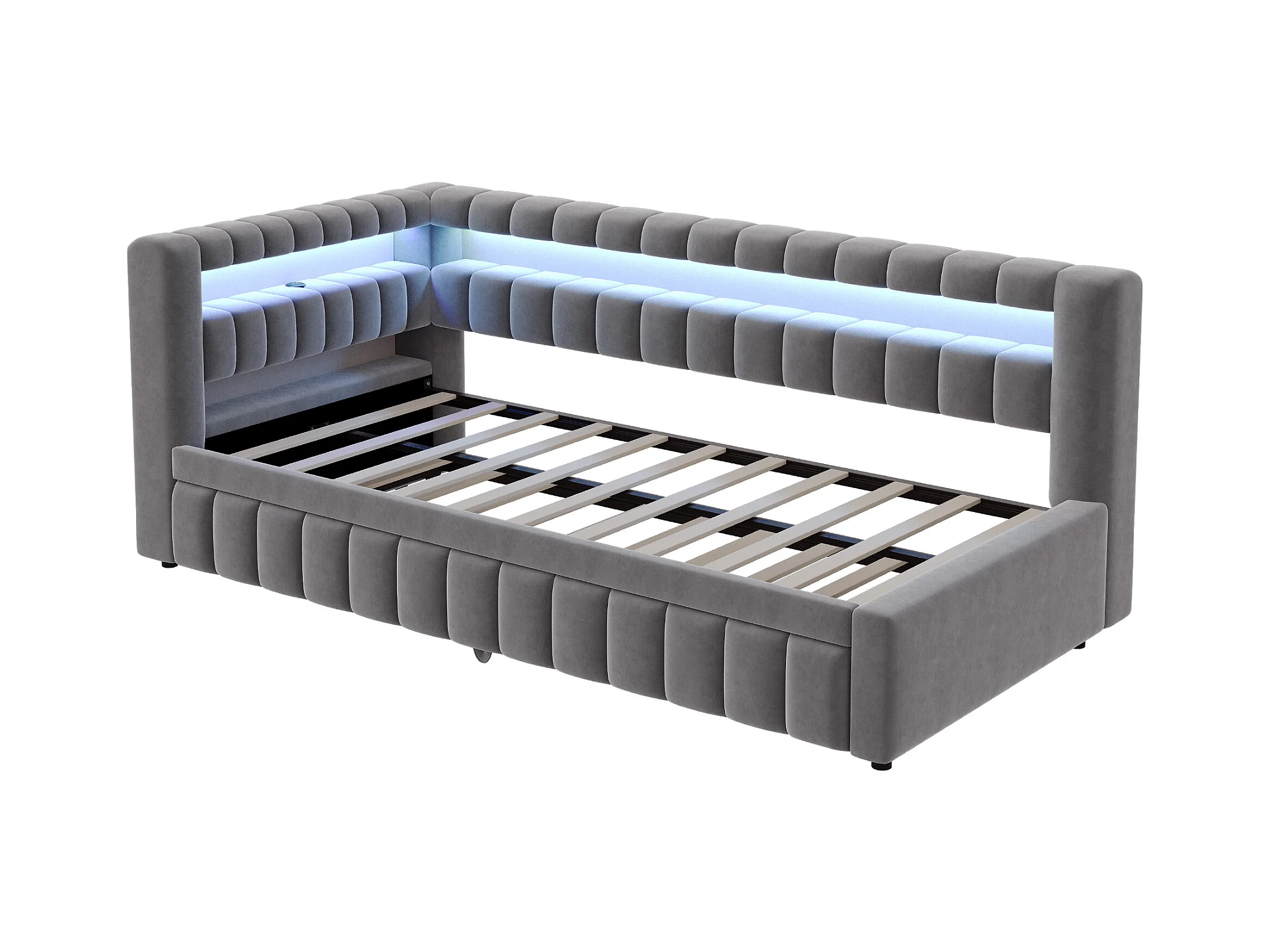Sofá-cama acolchoado 90×200 cm - com iluminação LED - com porta de carregamento USB - cama extra - tecido veludo - cinza (colchão não incluído)
