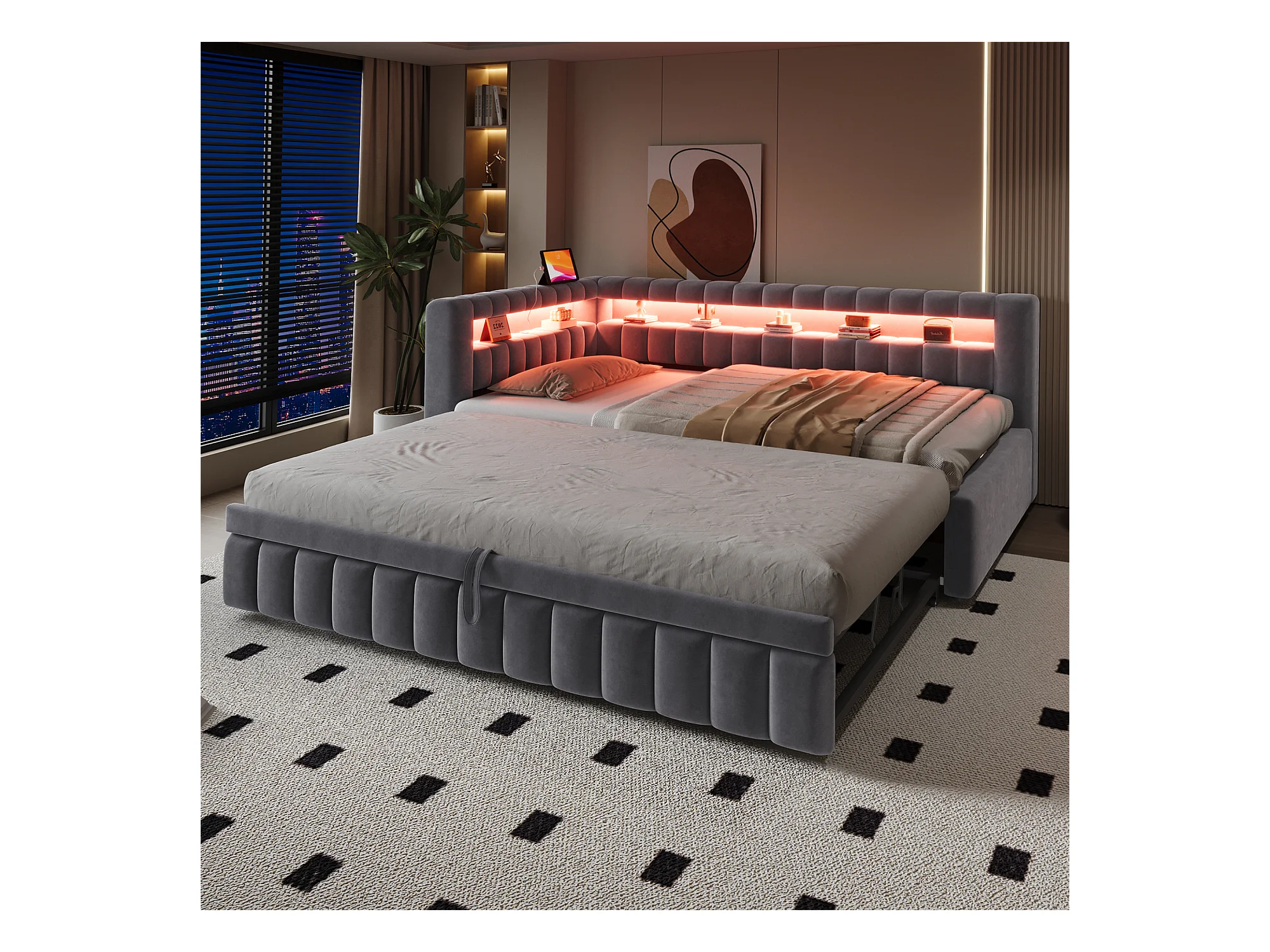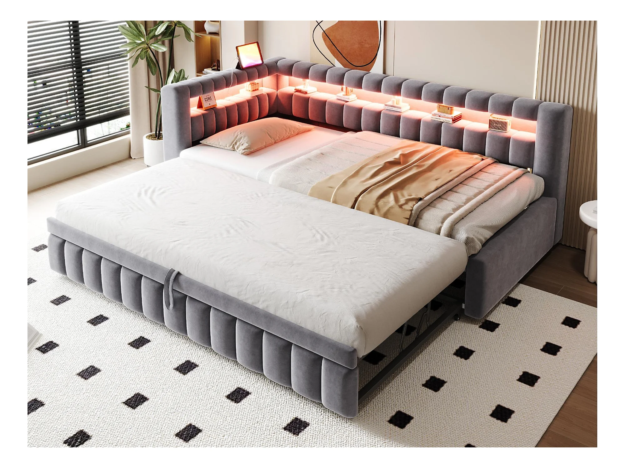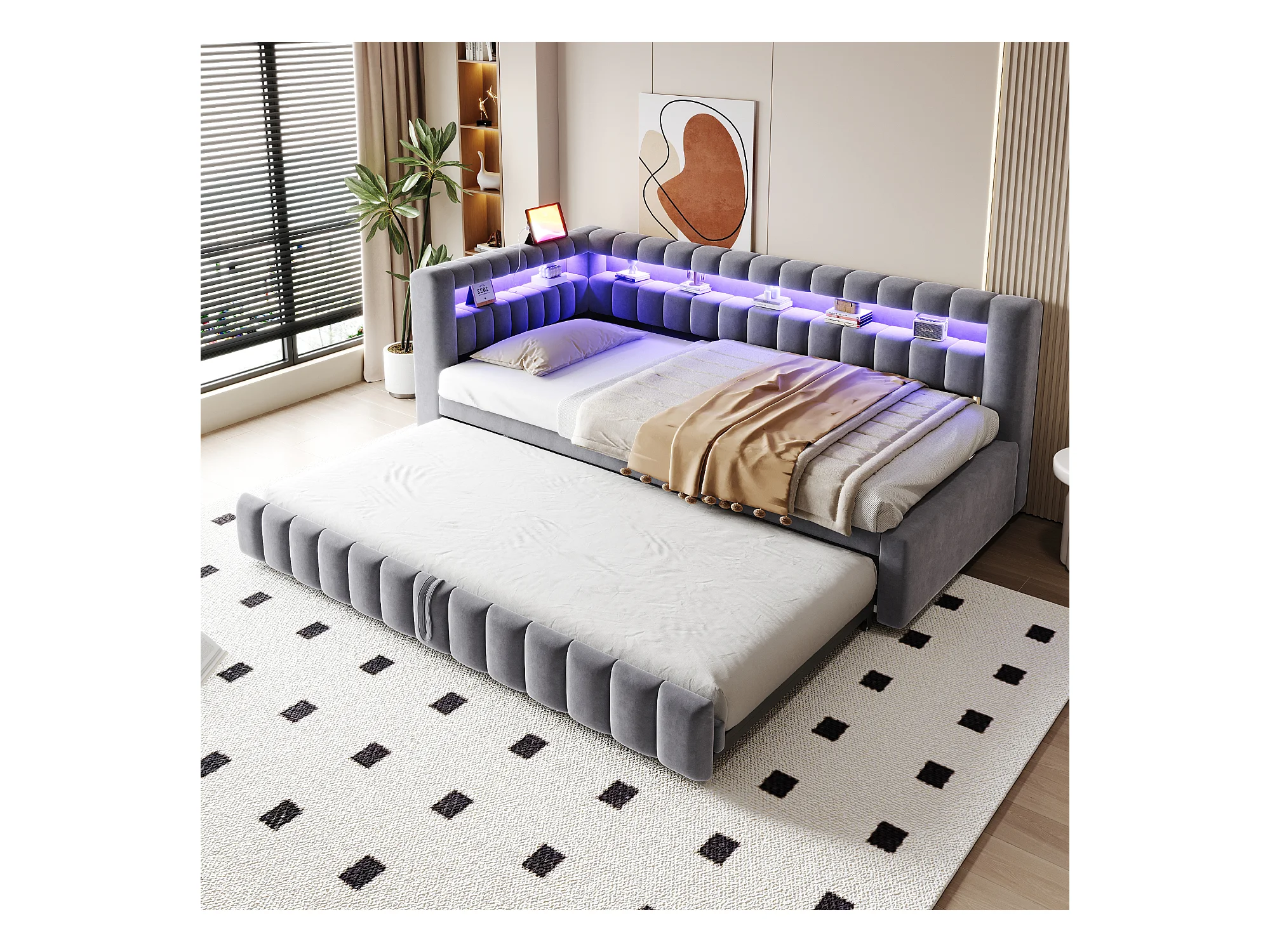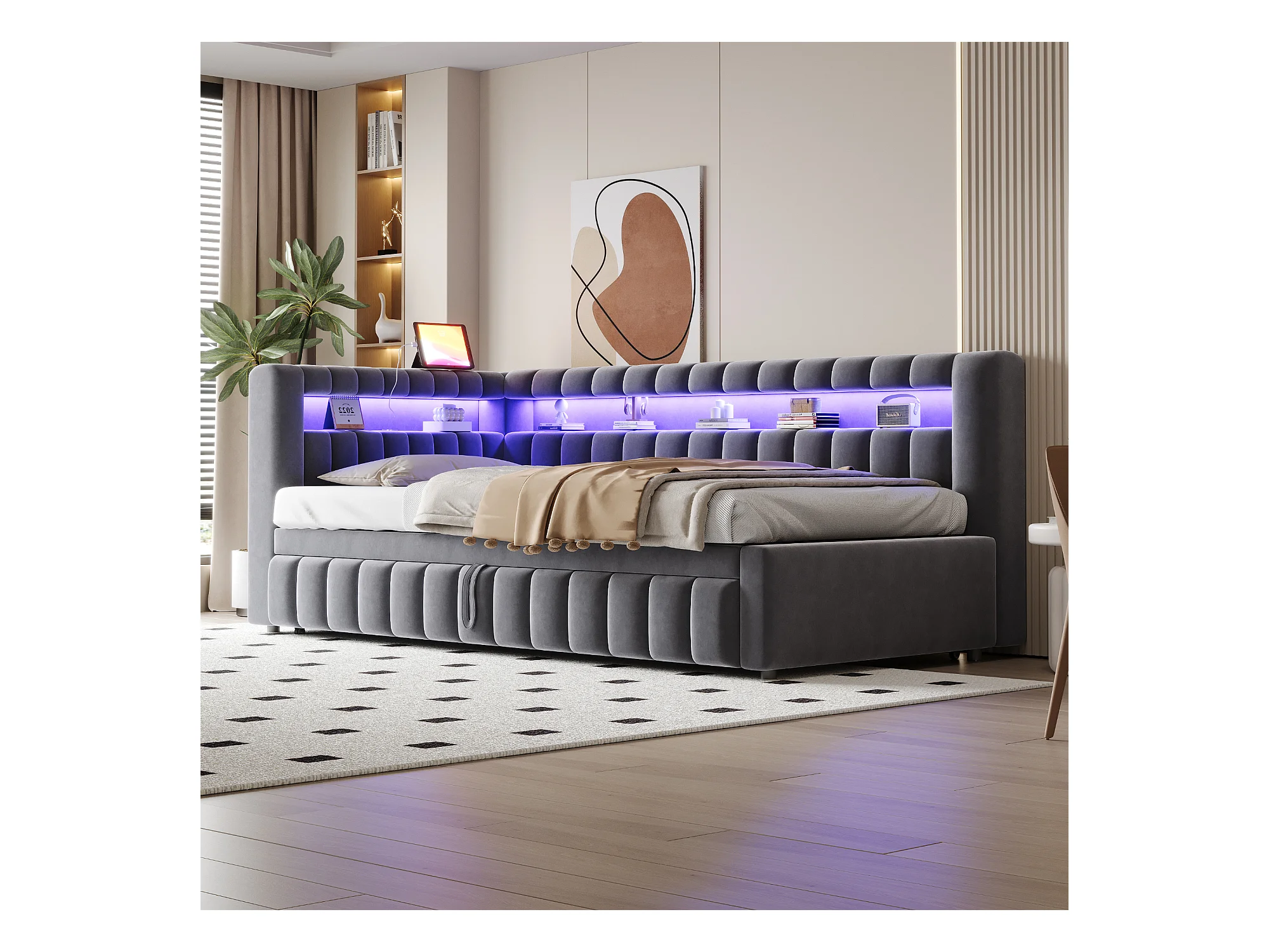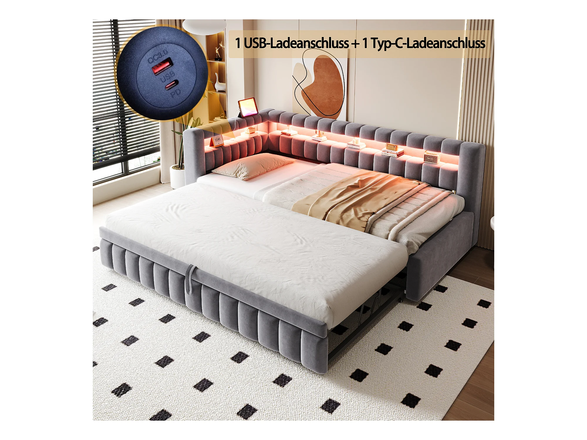 Sofá-cama acolchoado 90×200 cm - com iluminação LED - com porta de carregamento USB - cama extra - tecido veludo - cinza (colchão não incluído)
