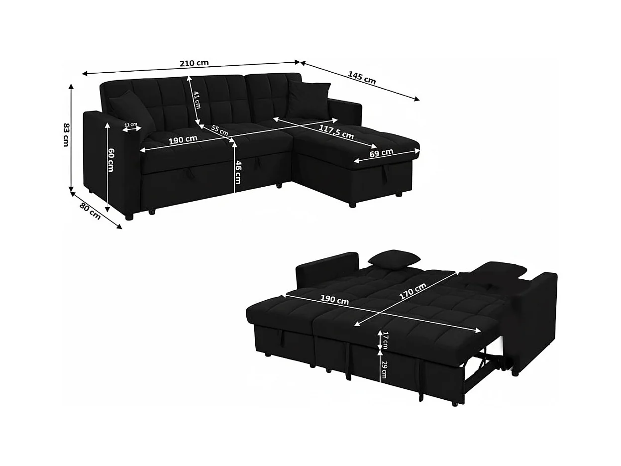 Sofá-Cama Chaise Longue Kris 210cm Preto