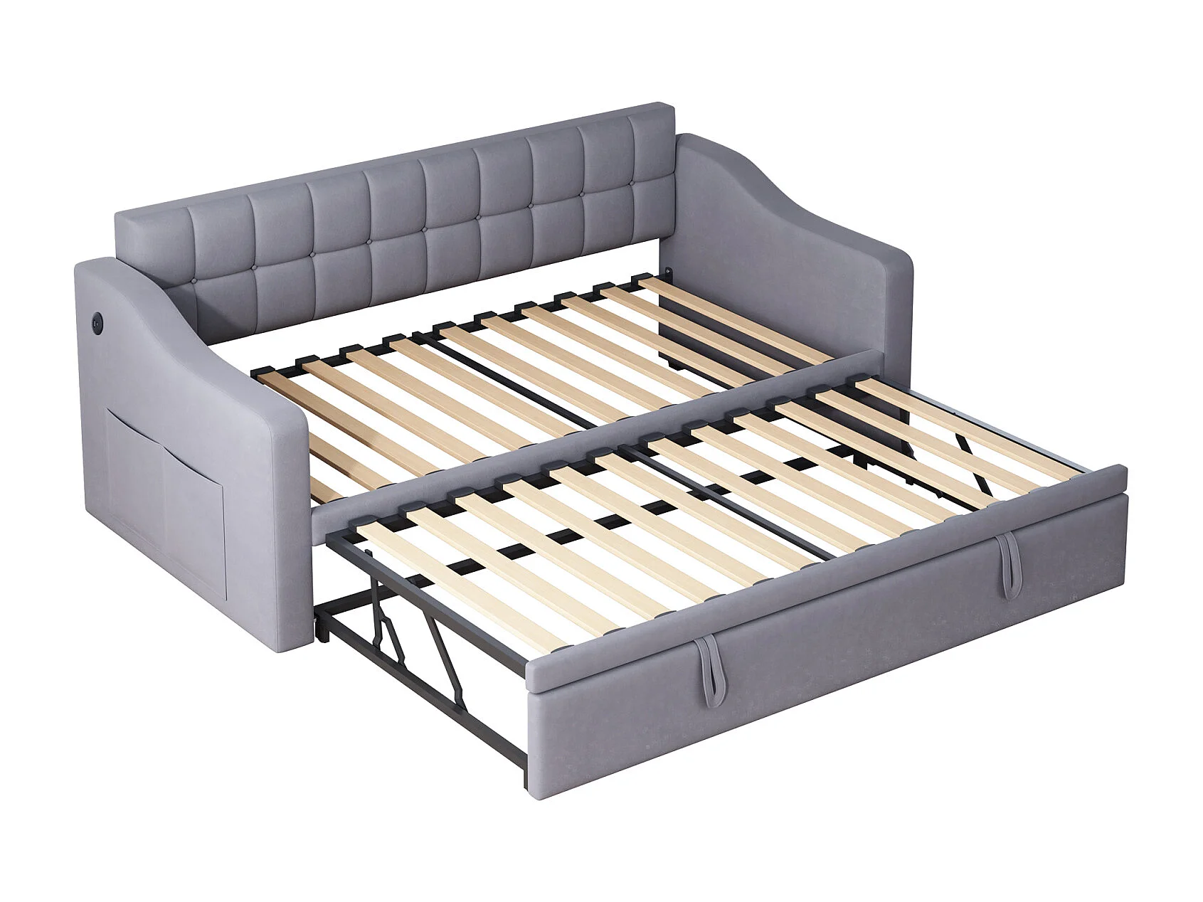 Sofá-cama conversível de 2 lugares com armazenamento e tomada, 90/180x190 cm, cama com cama de rodízio, cinza