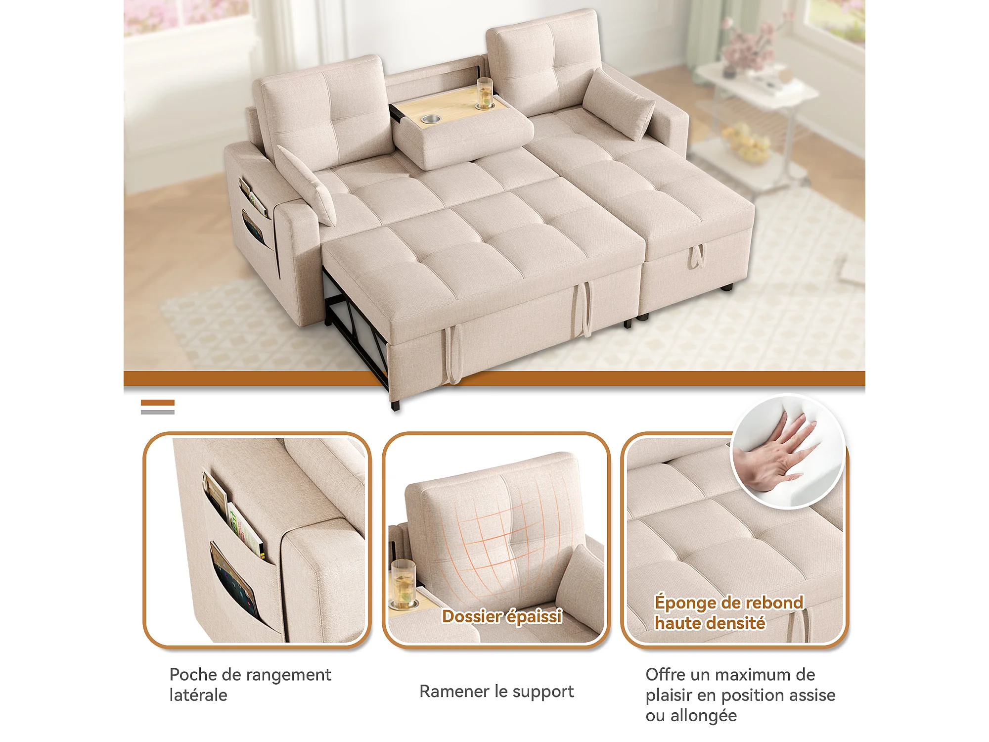 Sofá-cama em L - 205 x 139 x 87 cm - sofá-cama retrátil - com compartimento de arrumação - Madeira maciça + linho - bege