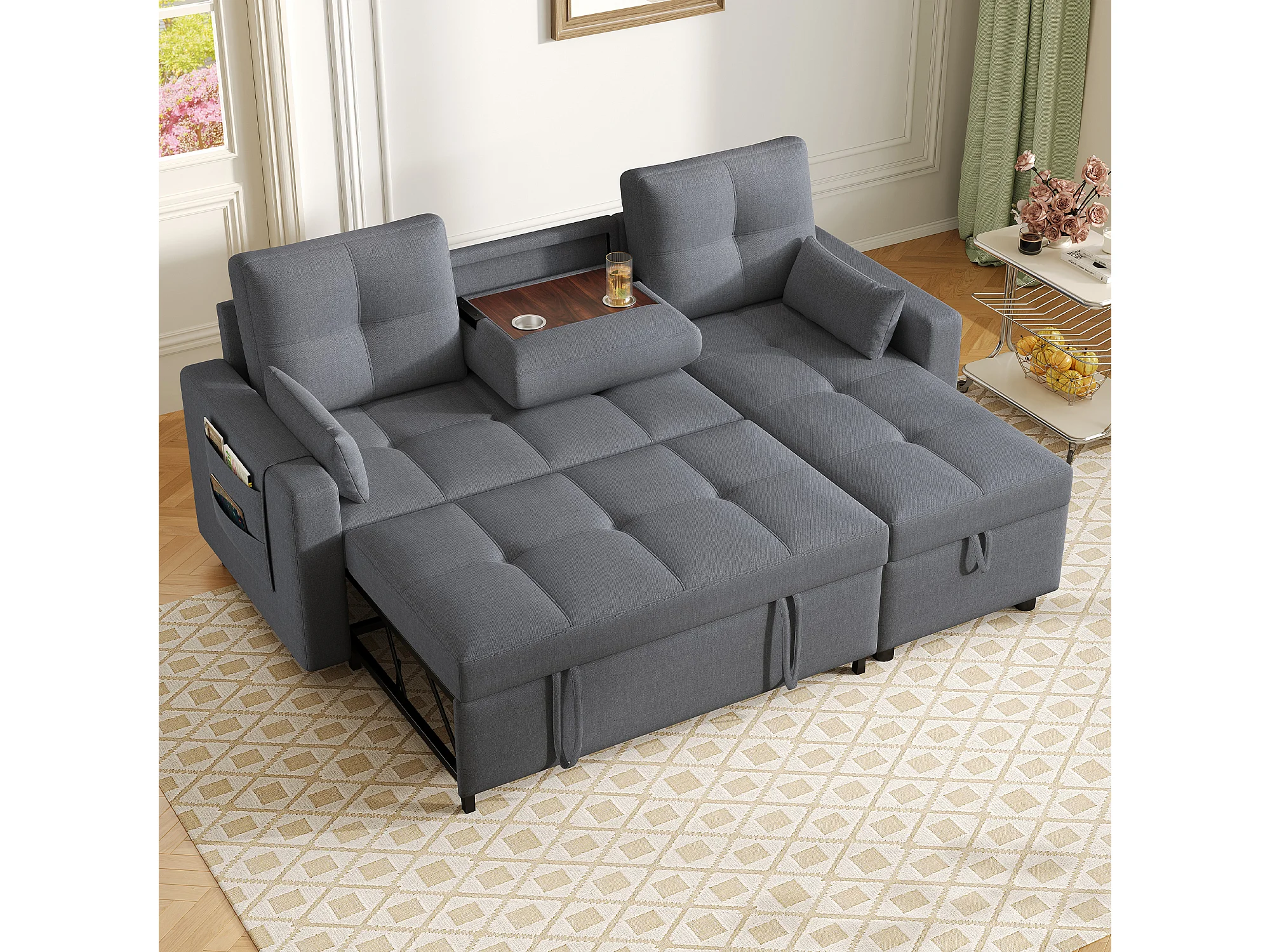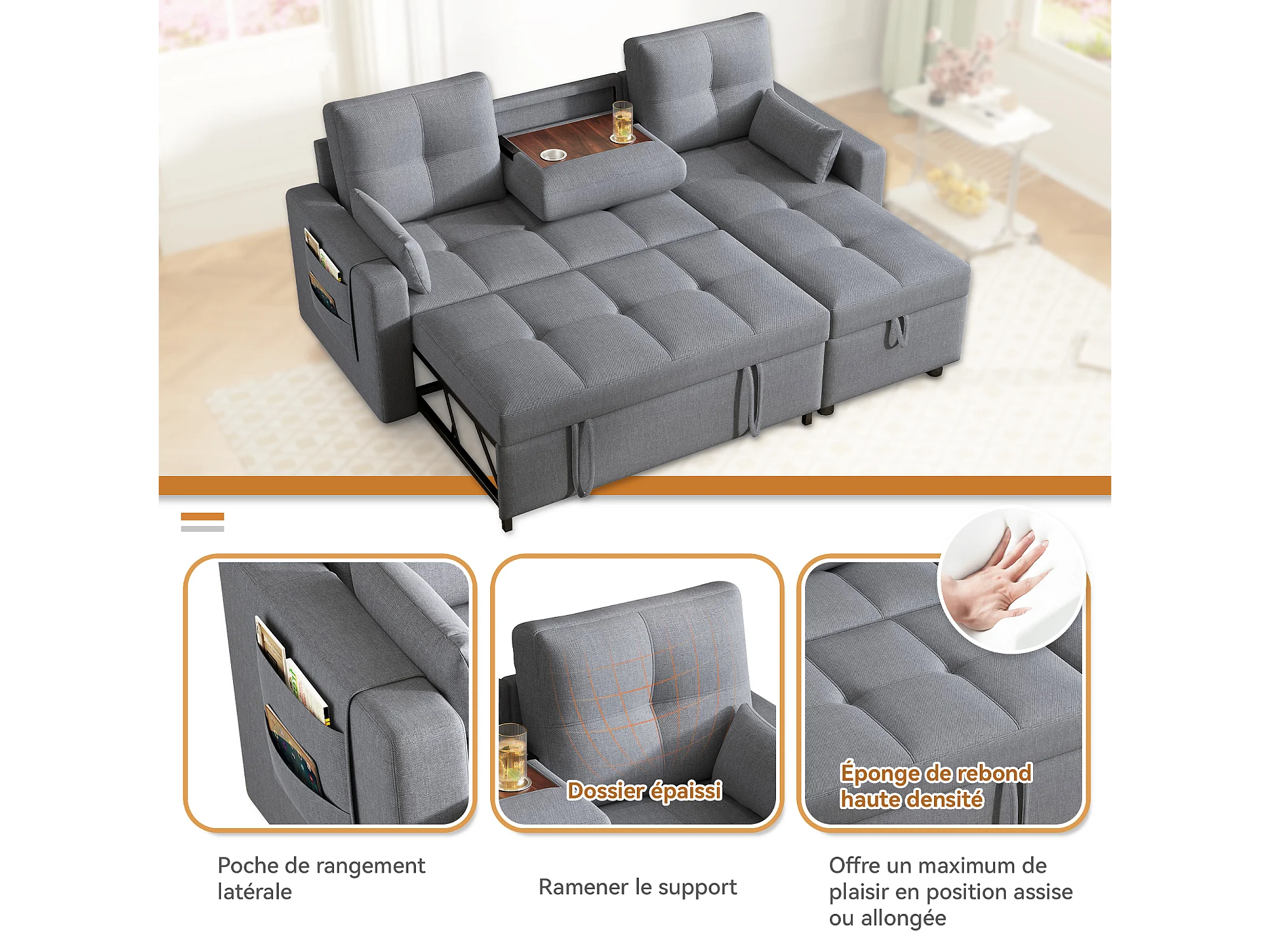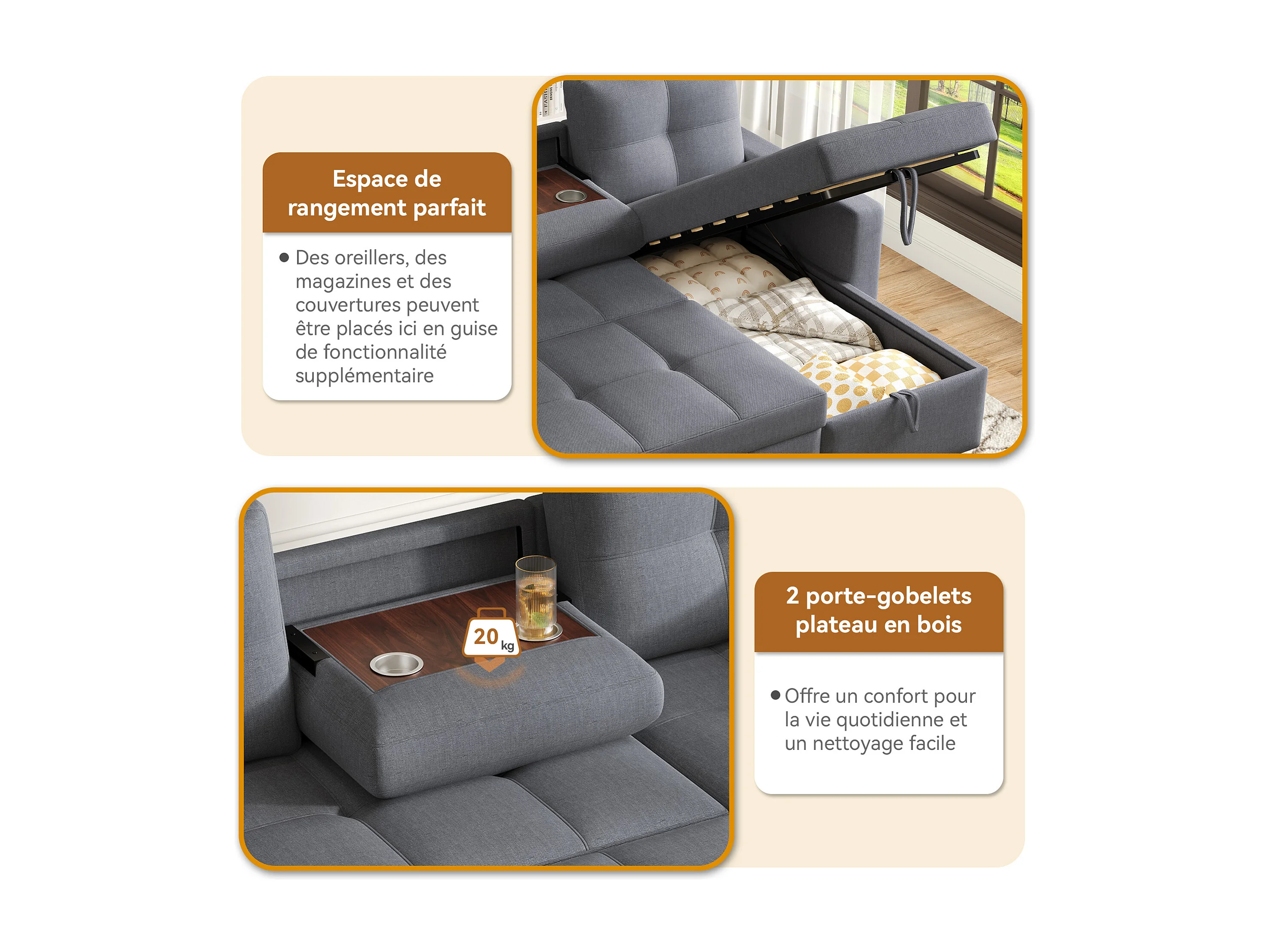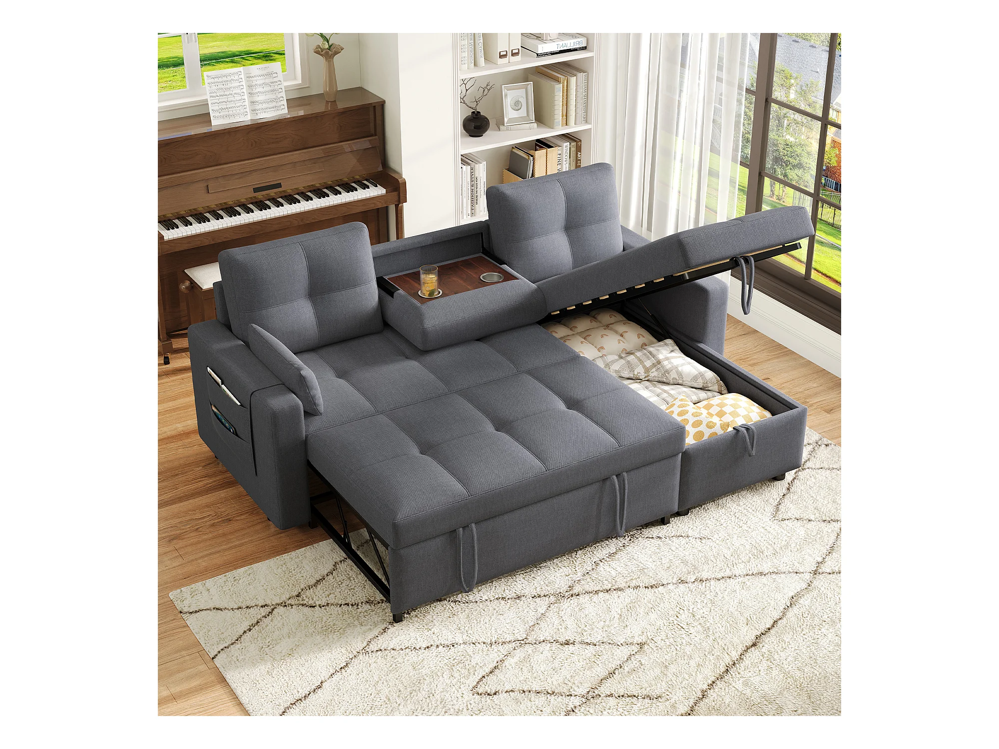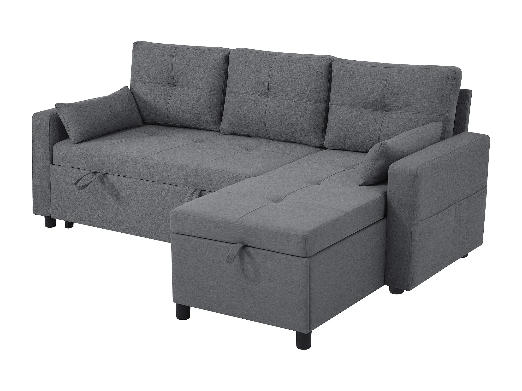 Sofá-cama em L - 205 x 139 x 87 cm - sofá-cama retrátil - com compartimento de arrumação - Madeira maciça + linho - cinza