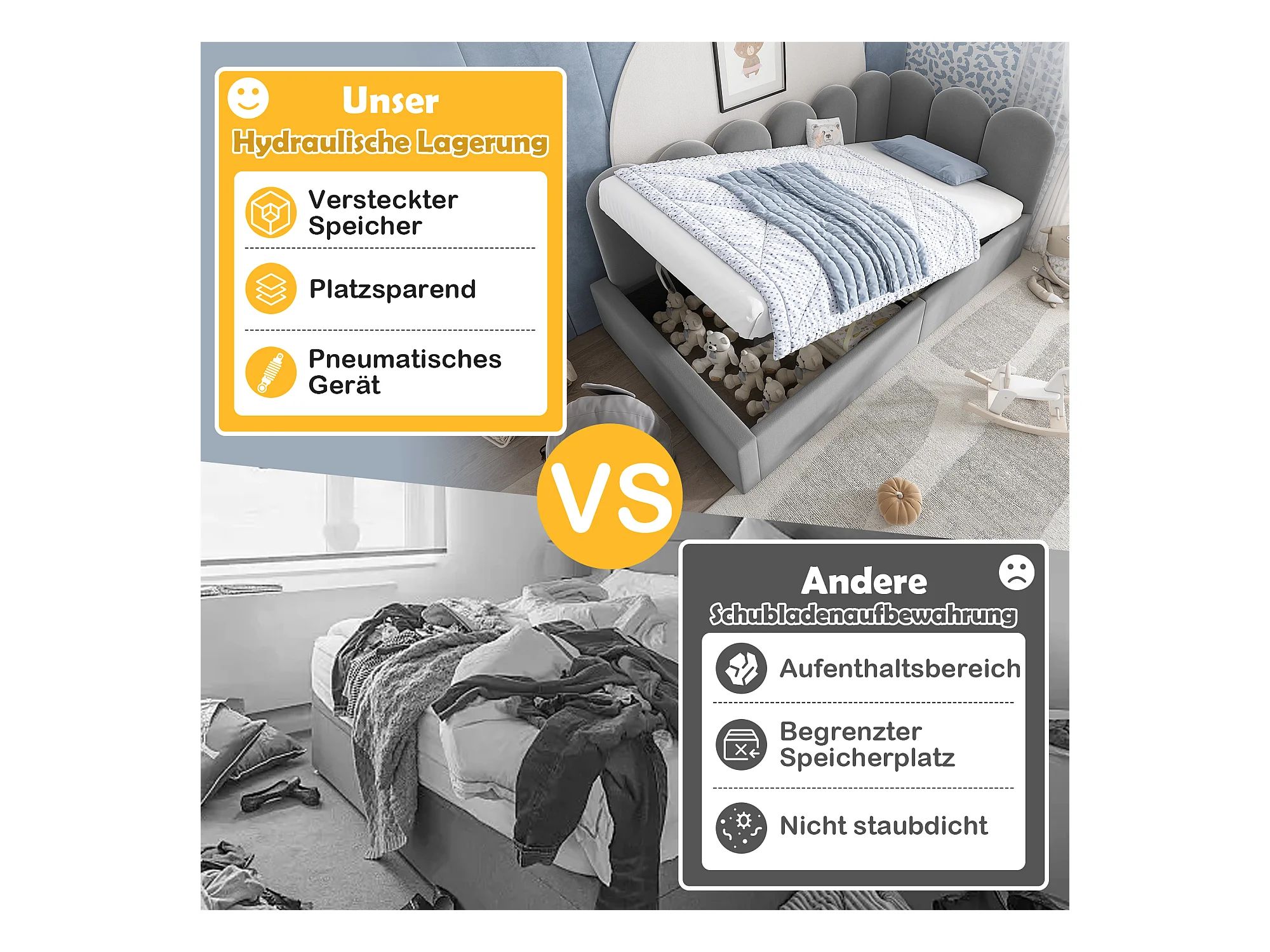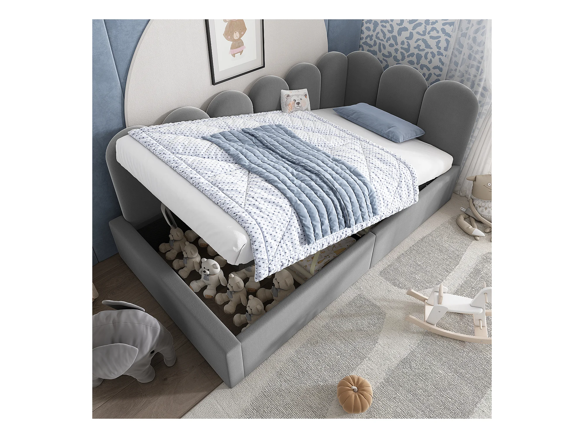 Sofá-cama estofado com armazenamento hidráulico - 90 x 200 cm - com base de ripas - veludo - cinza