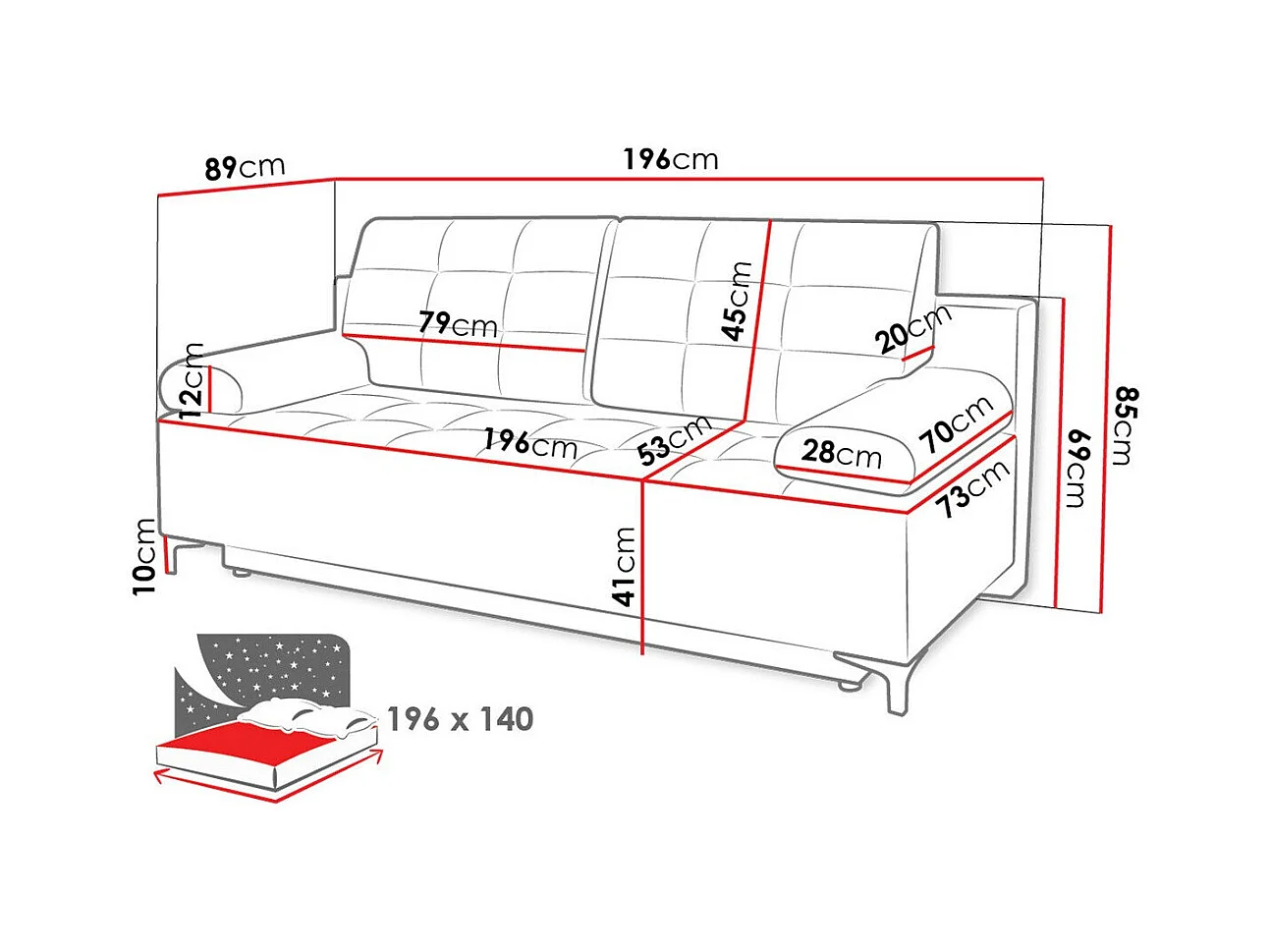 Sofá cama Columbus 196, Cama com arrumação, 9x19x10cm